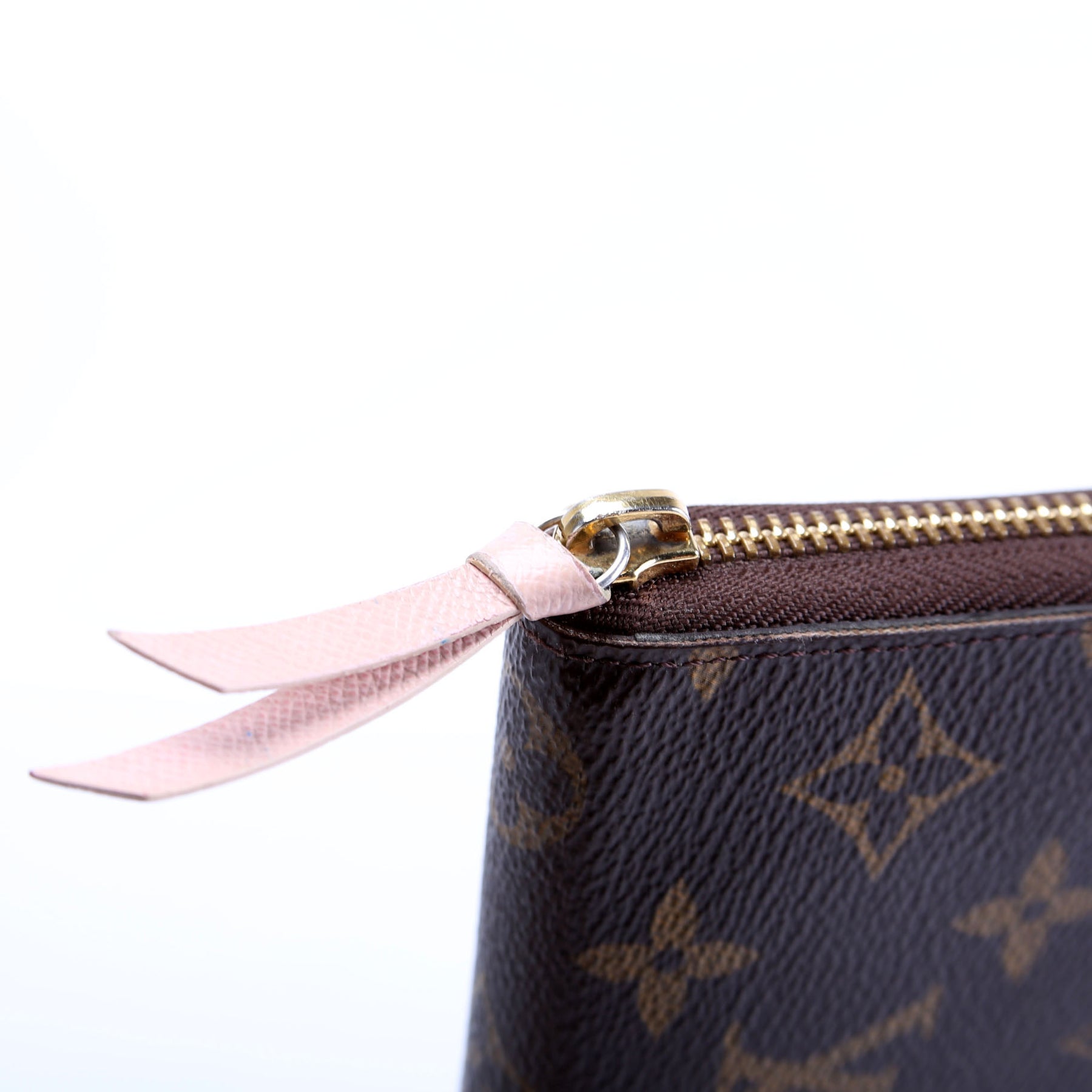 Hardware: The zipper operates properly and runs smoothly. The leather tab pull shows wear and rubbing. The hardware shows wear and discoloration.