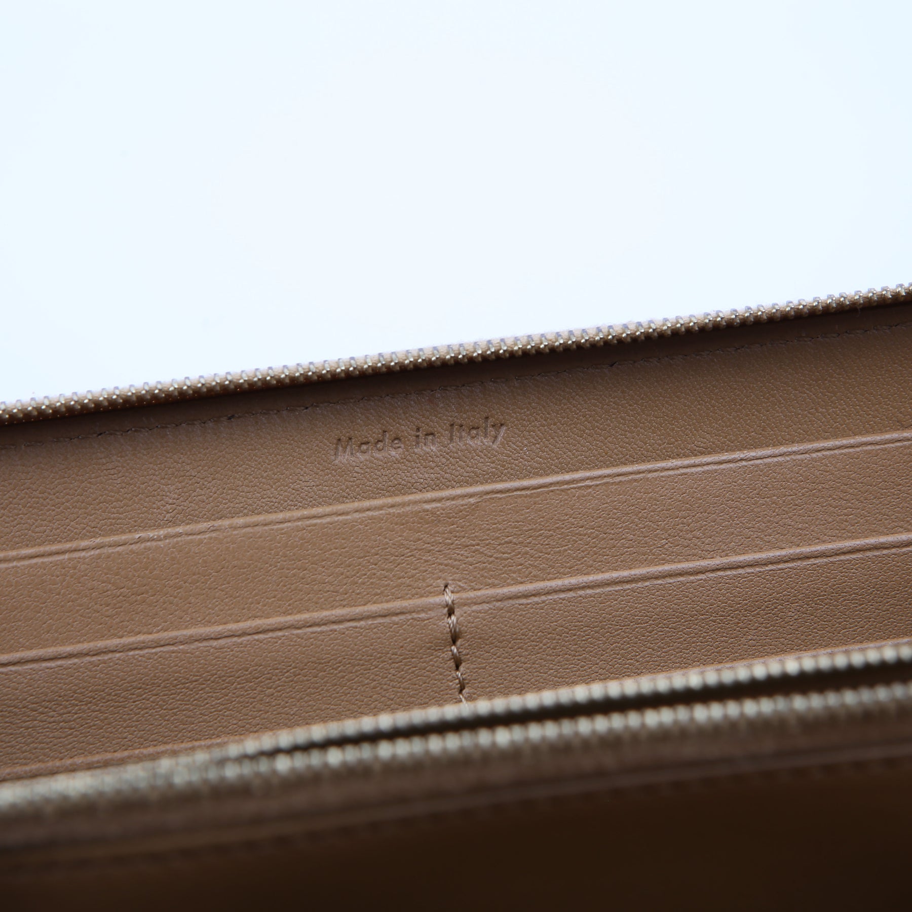 Interior: The interior is free of rips or tears. The interior features four bill slots, one zip closure coin pouch, and twelve card slots. There is minor discoloration to the interior leather.