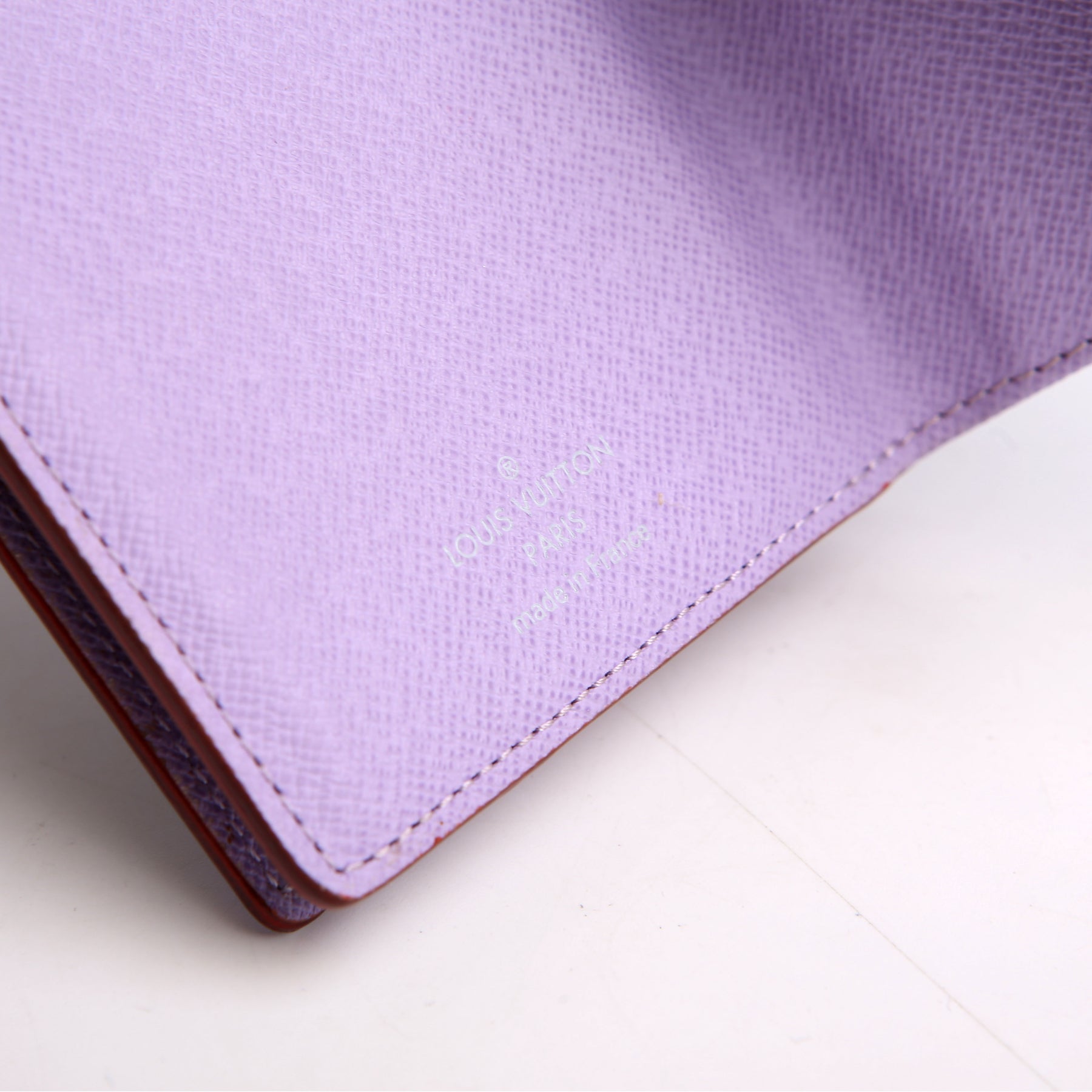Exterior: The exterior pipping shows minor wear throughout. The leather tab shows minor wear and discoloration.