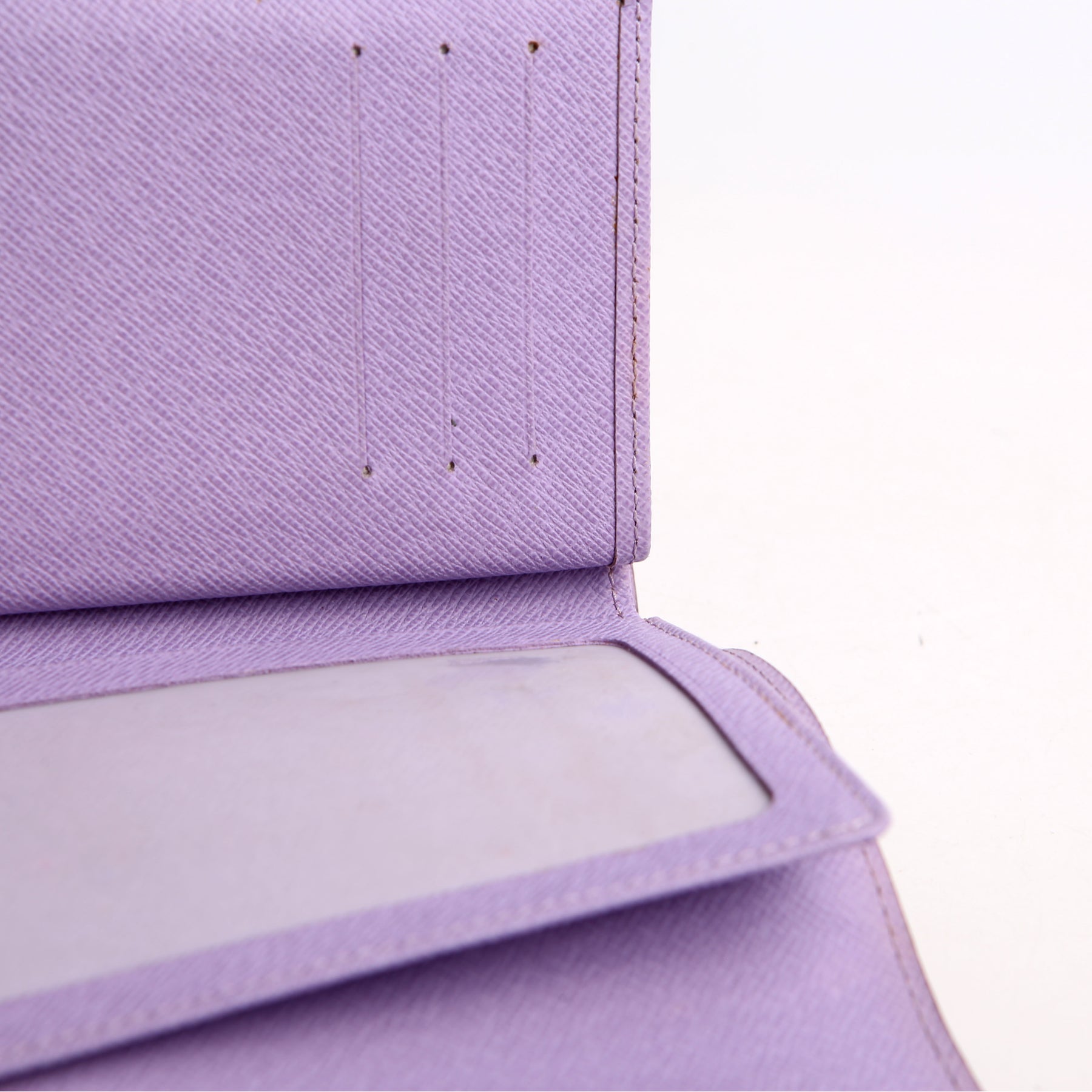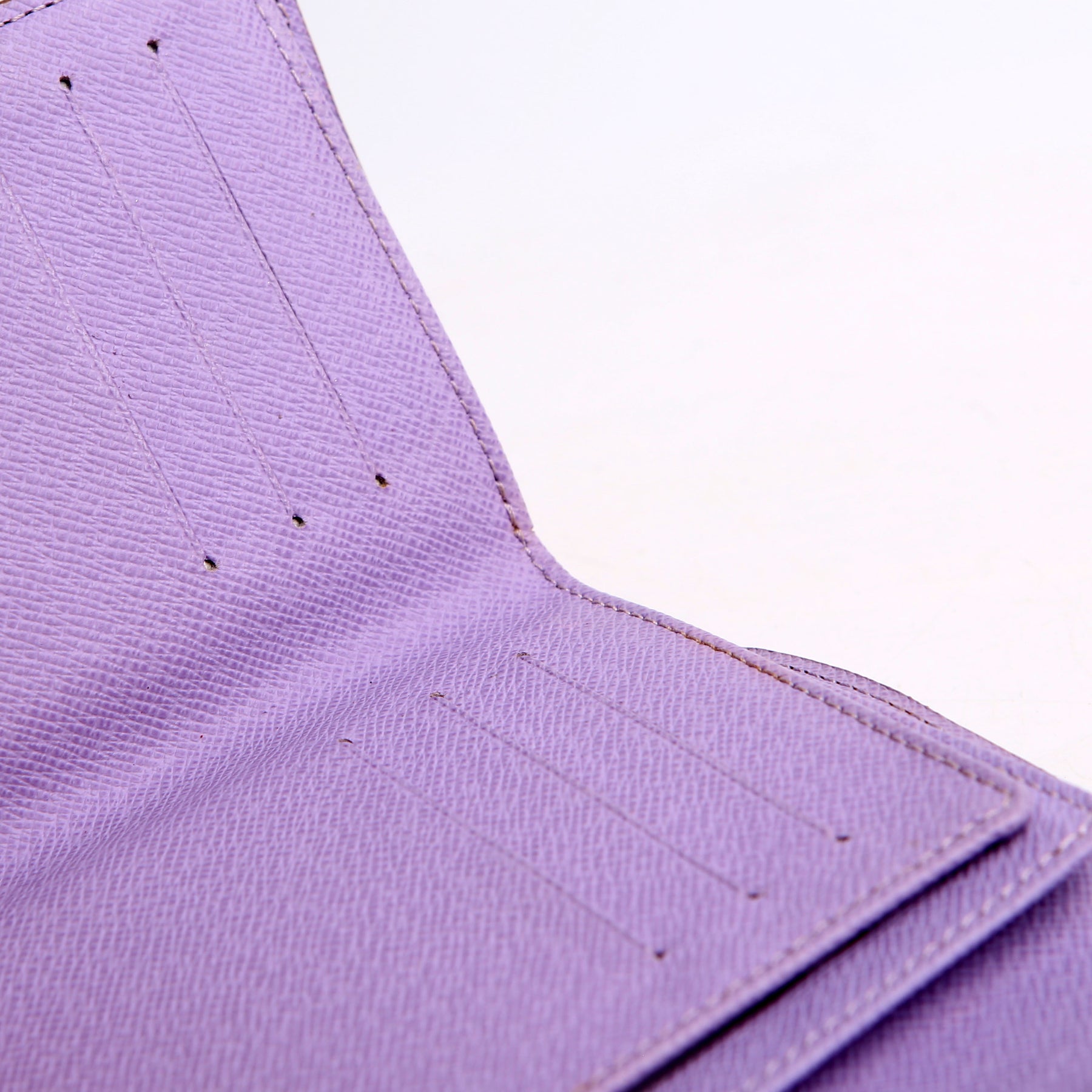 Interior: The interior shows light wear throughout, and features one bill slot, nine card slots, one transparent ID holder, and one zipper pocket with two slots.