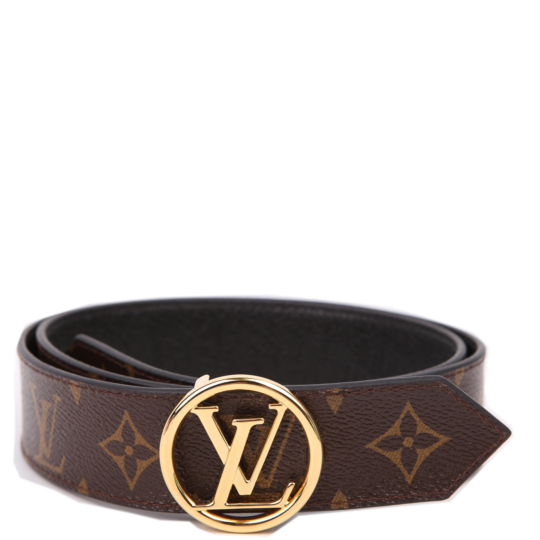 This pre-owned Louis Vuitton LV Circle Reversible Leather/Monogram Belt is guaranteed 100% authentic. The exterior is in the classic Louis Vuitton Monogram coated canvas.