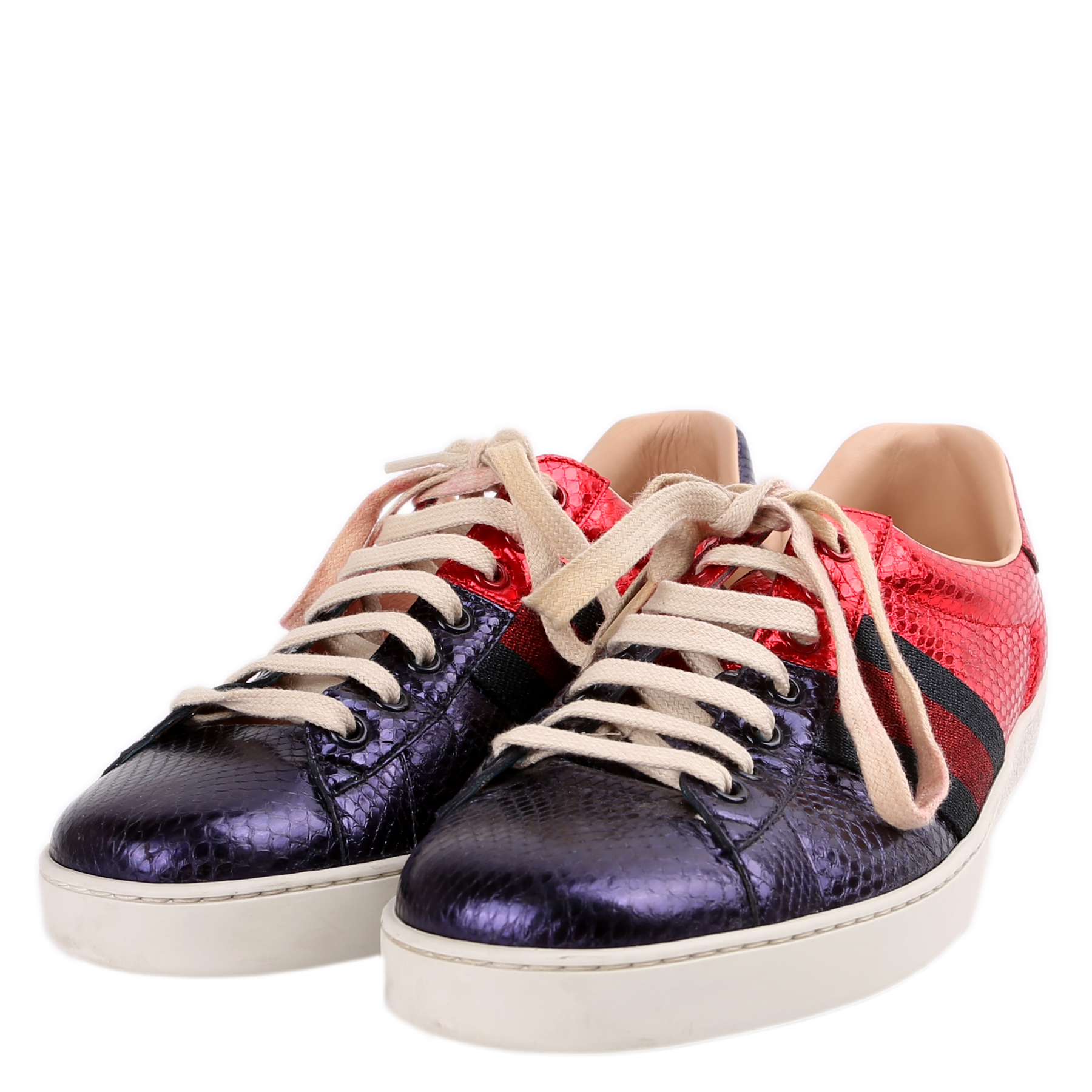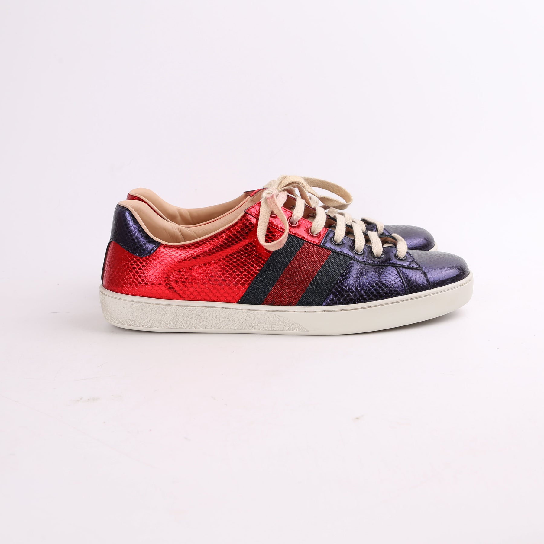 These pre-owned Gucci Metallic Ayers Web Sneakers are guaranteed 100% authentic.