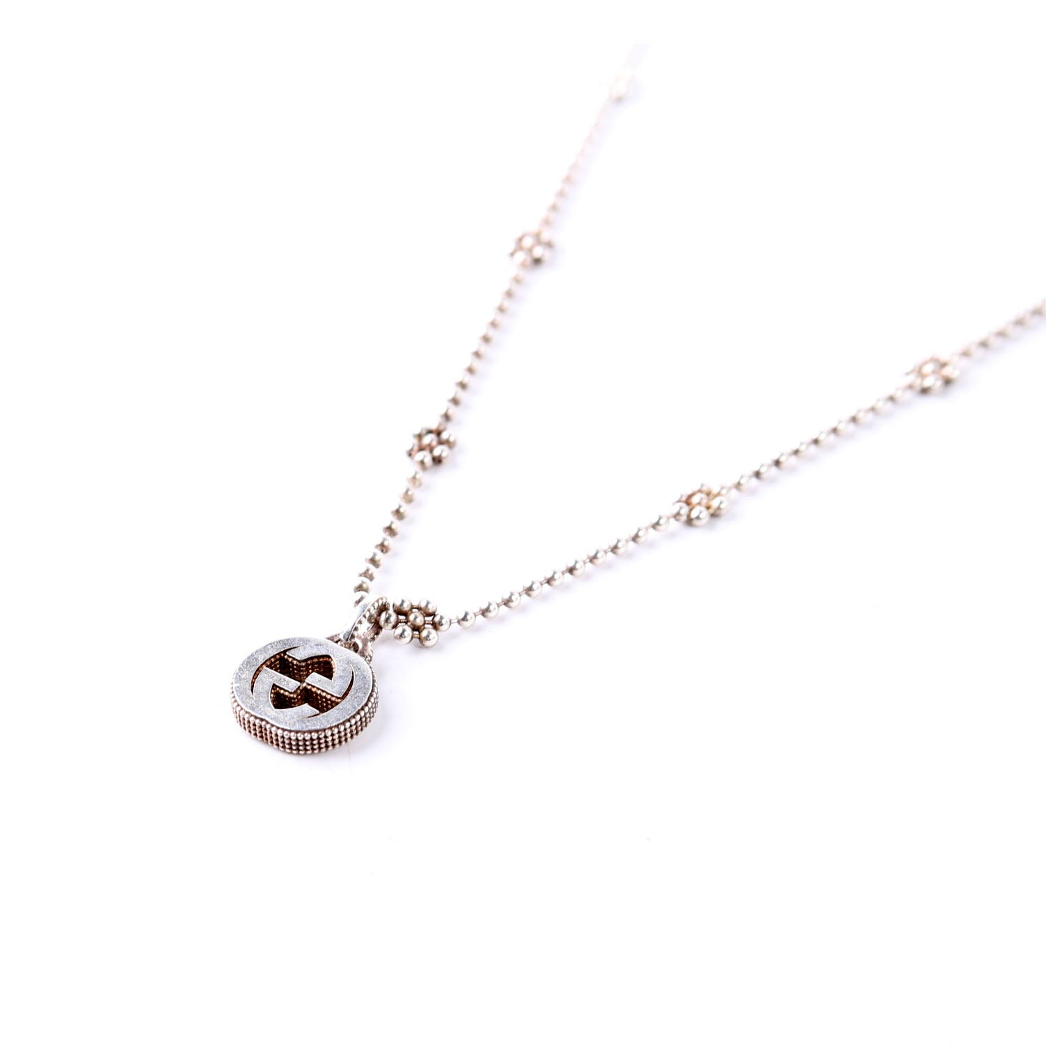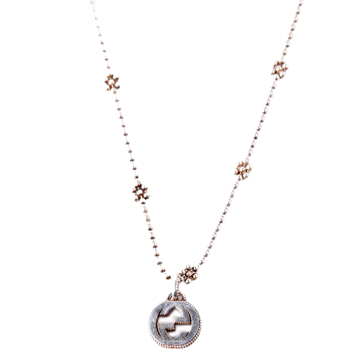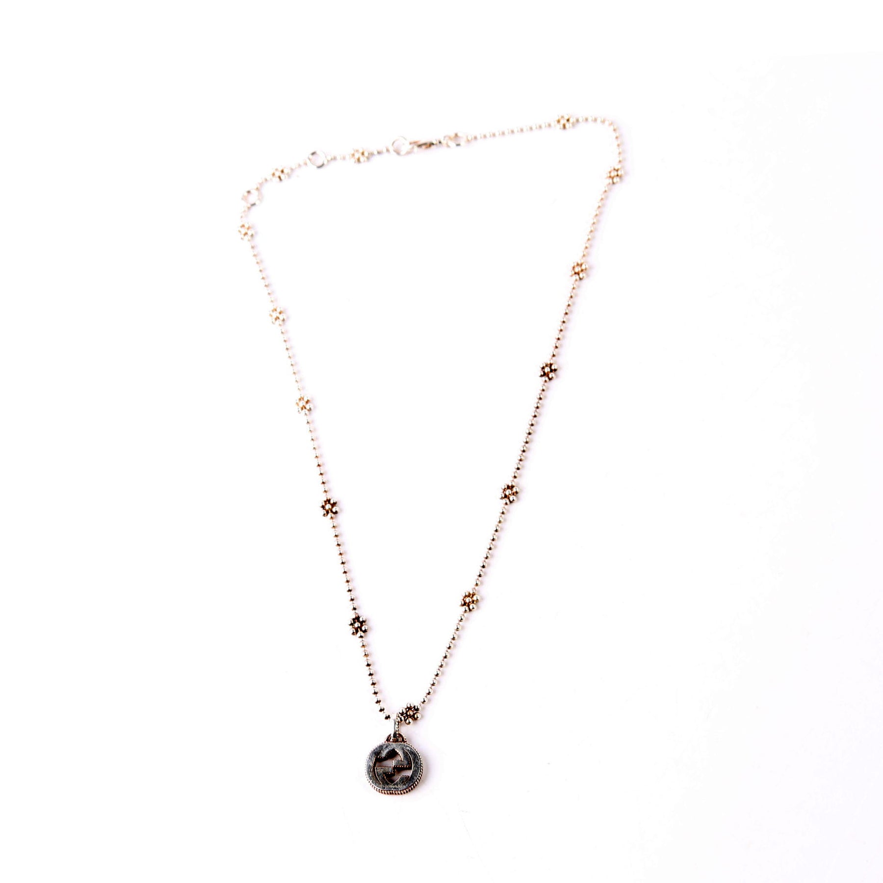 This pre-owned Gucci Interlocking G Flower Bead Chain Necklace is guaranteed 100% authentic.
