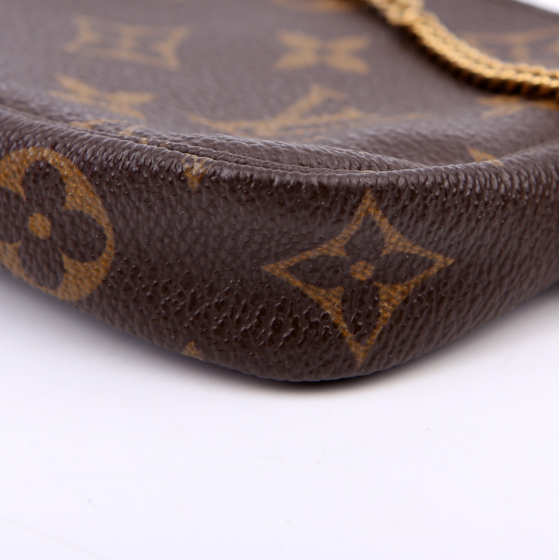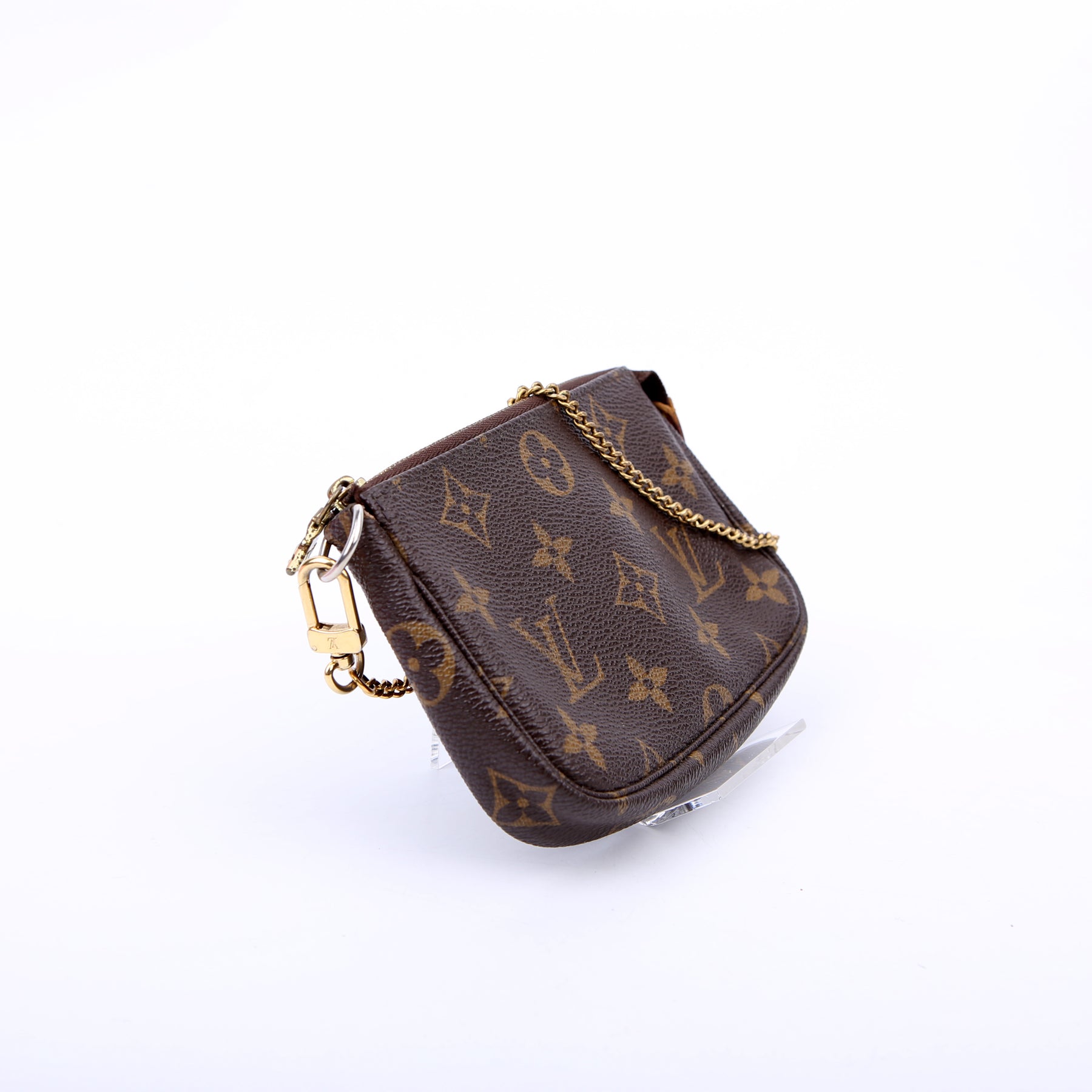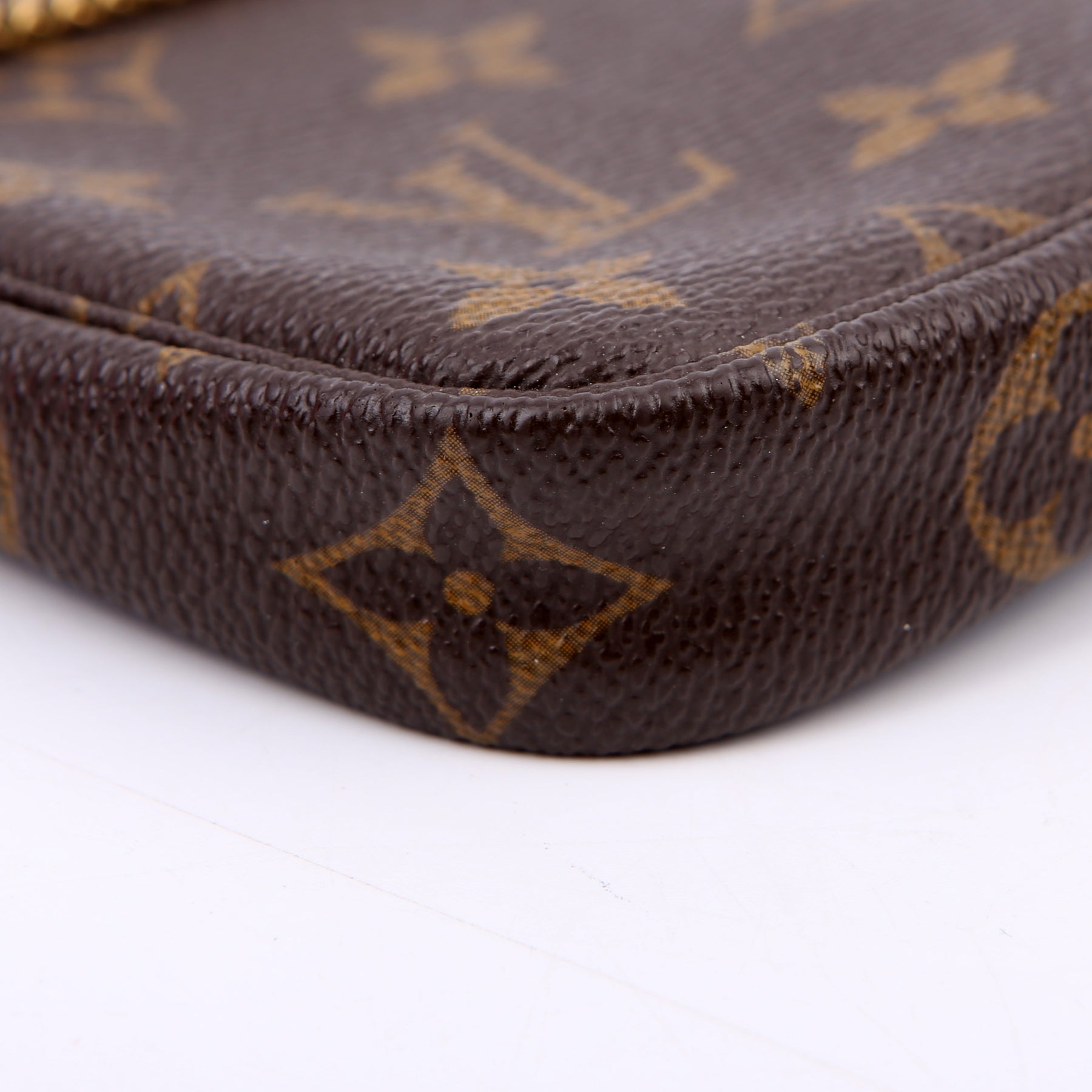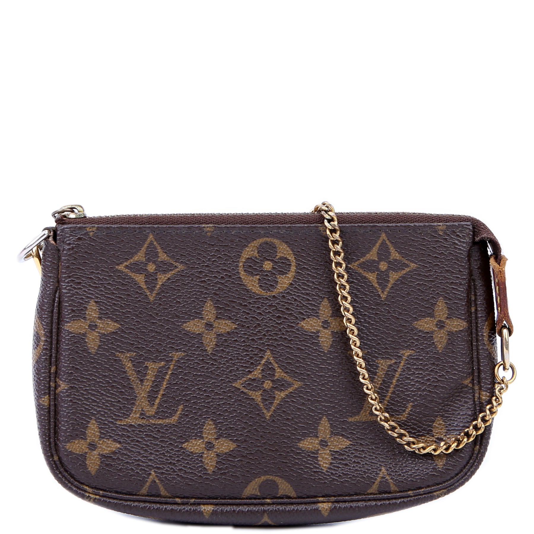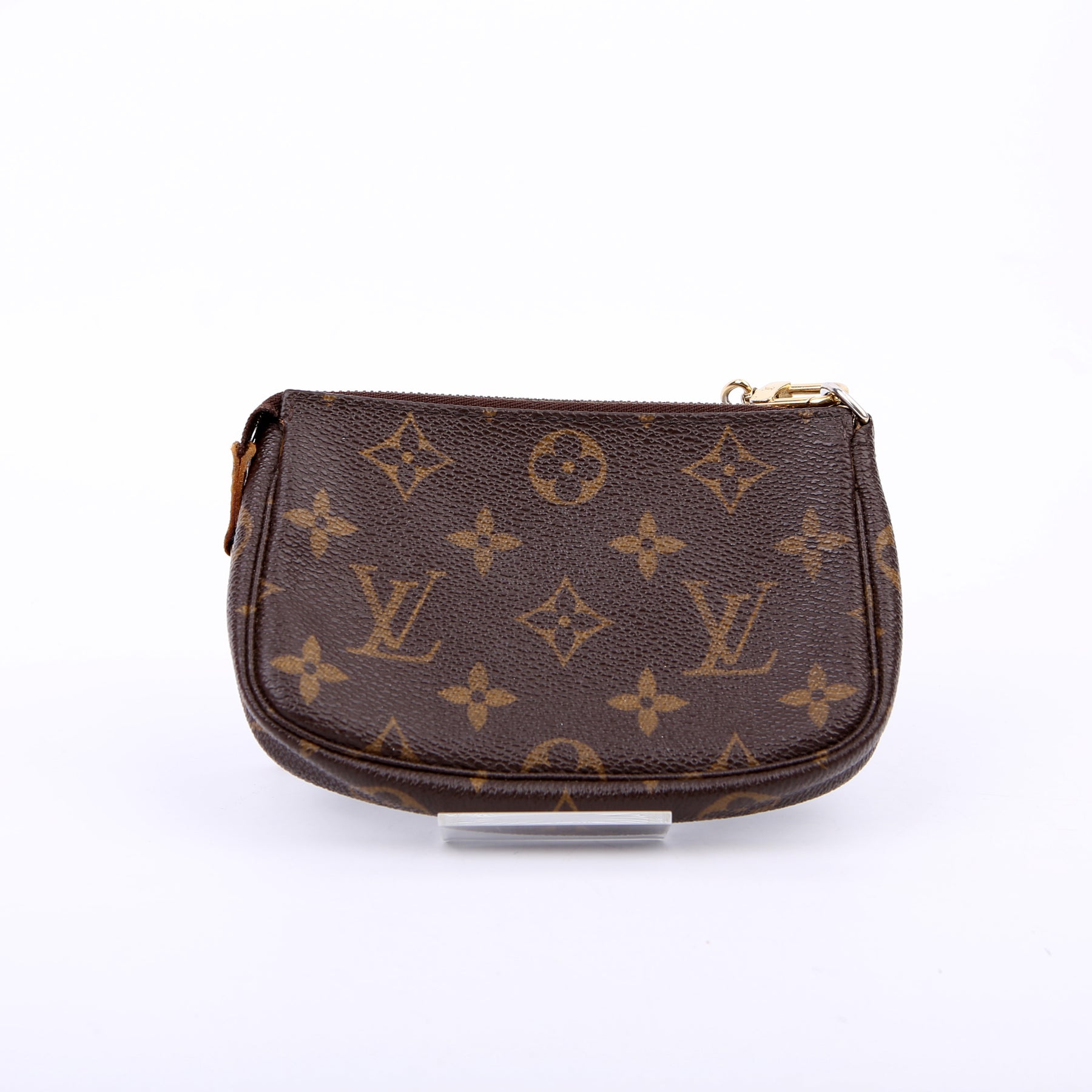 This pre-owned Louis Vuitton Pochette Accessories Mini is guaranteed 100% authentic. The exterior is in the classic Louis Vuitton Monogram coated canvas.