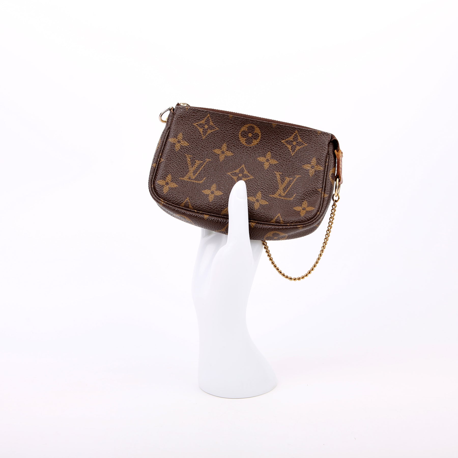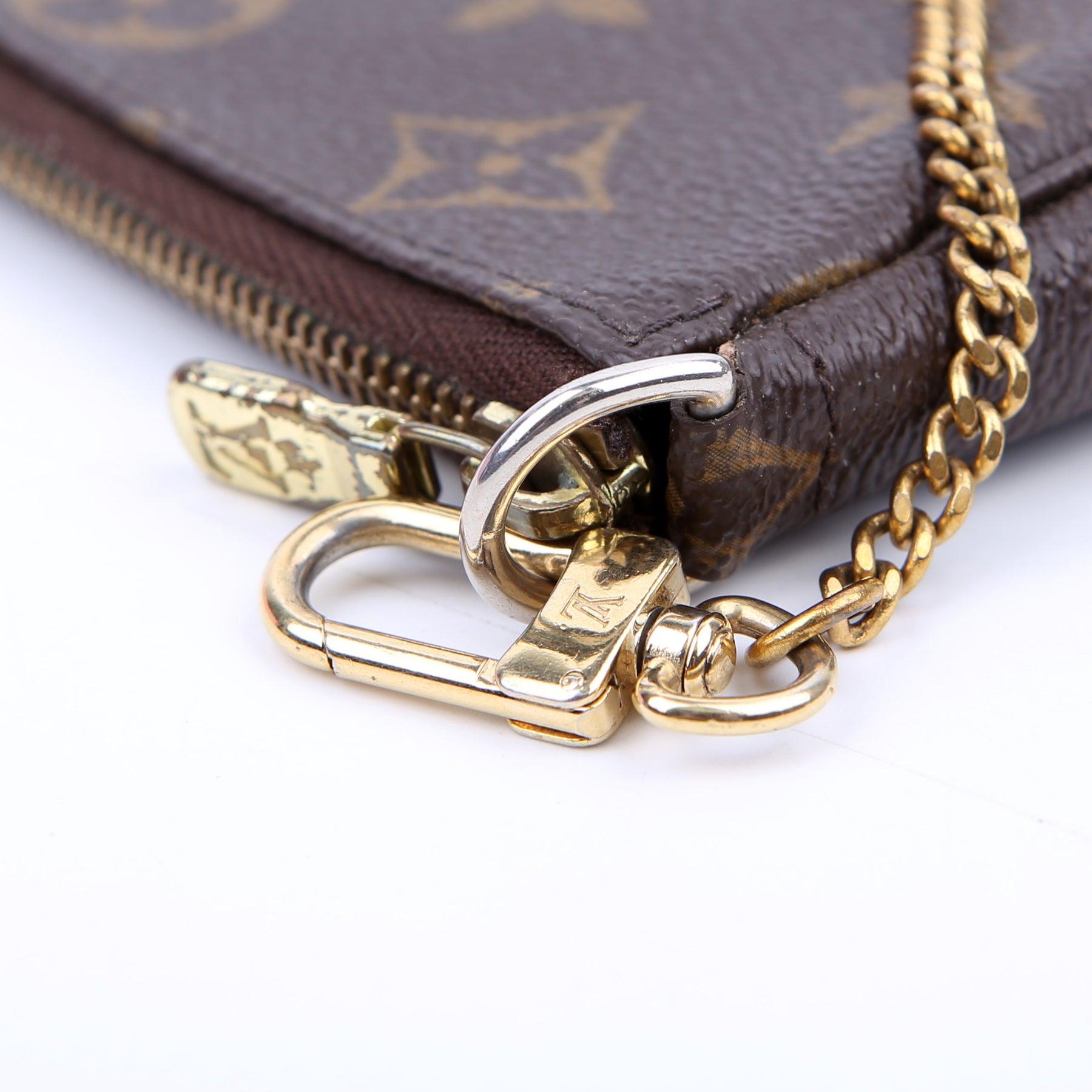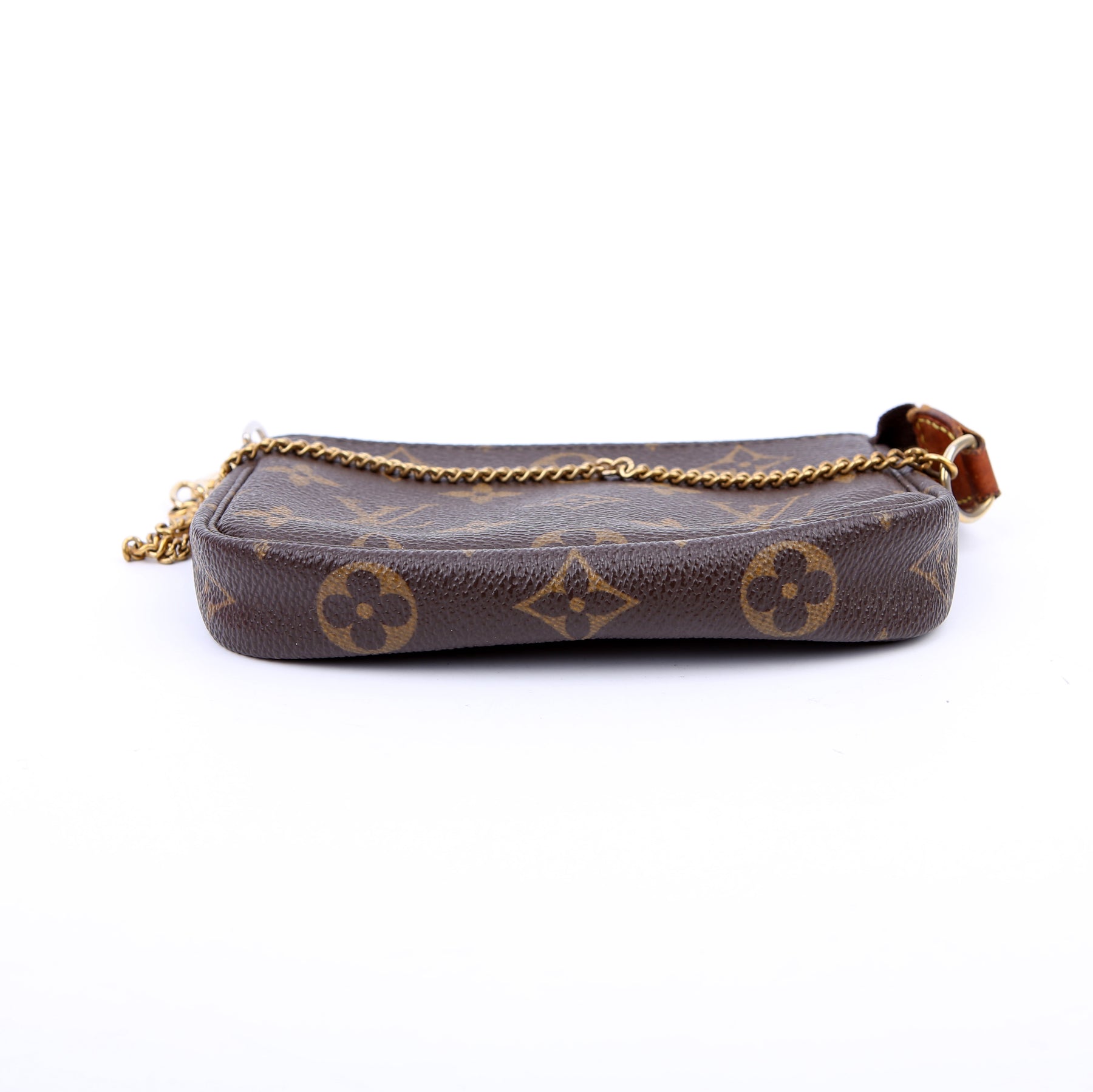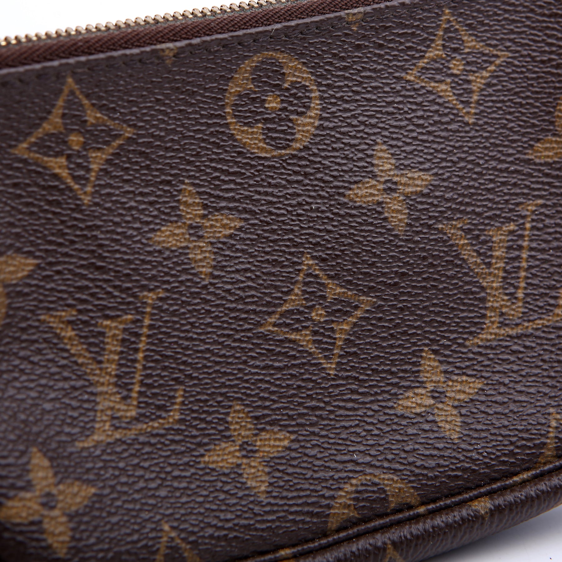 This pre-owned Louis Vuitton Pochette Accessories Mini is guaranteed 100% authentic. The exterior is in the classic Louis Vuitton Monogram coated canvas.