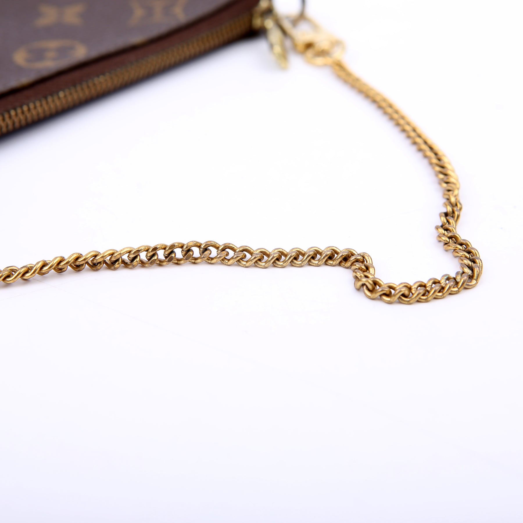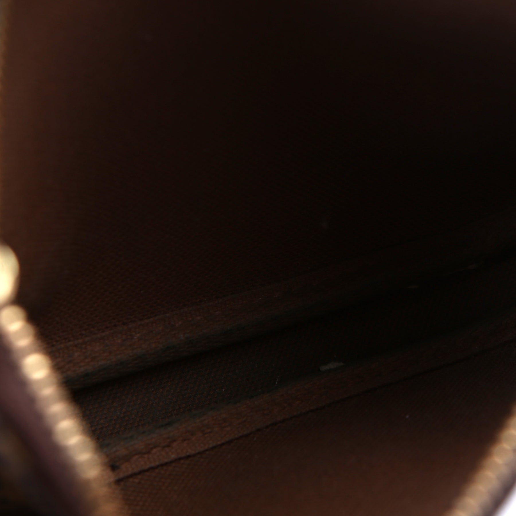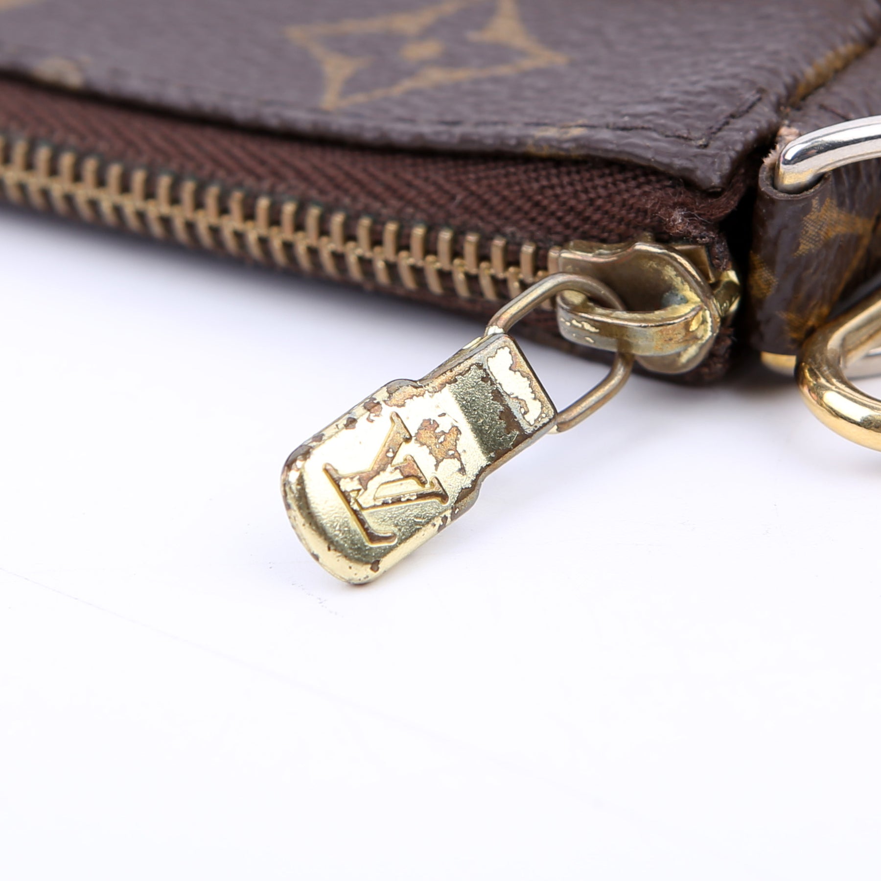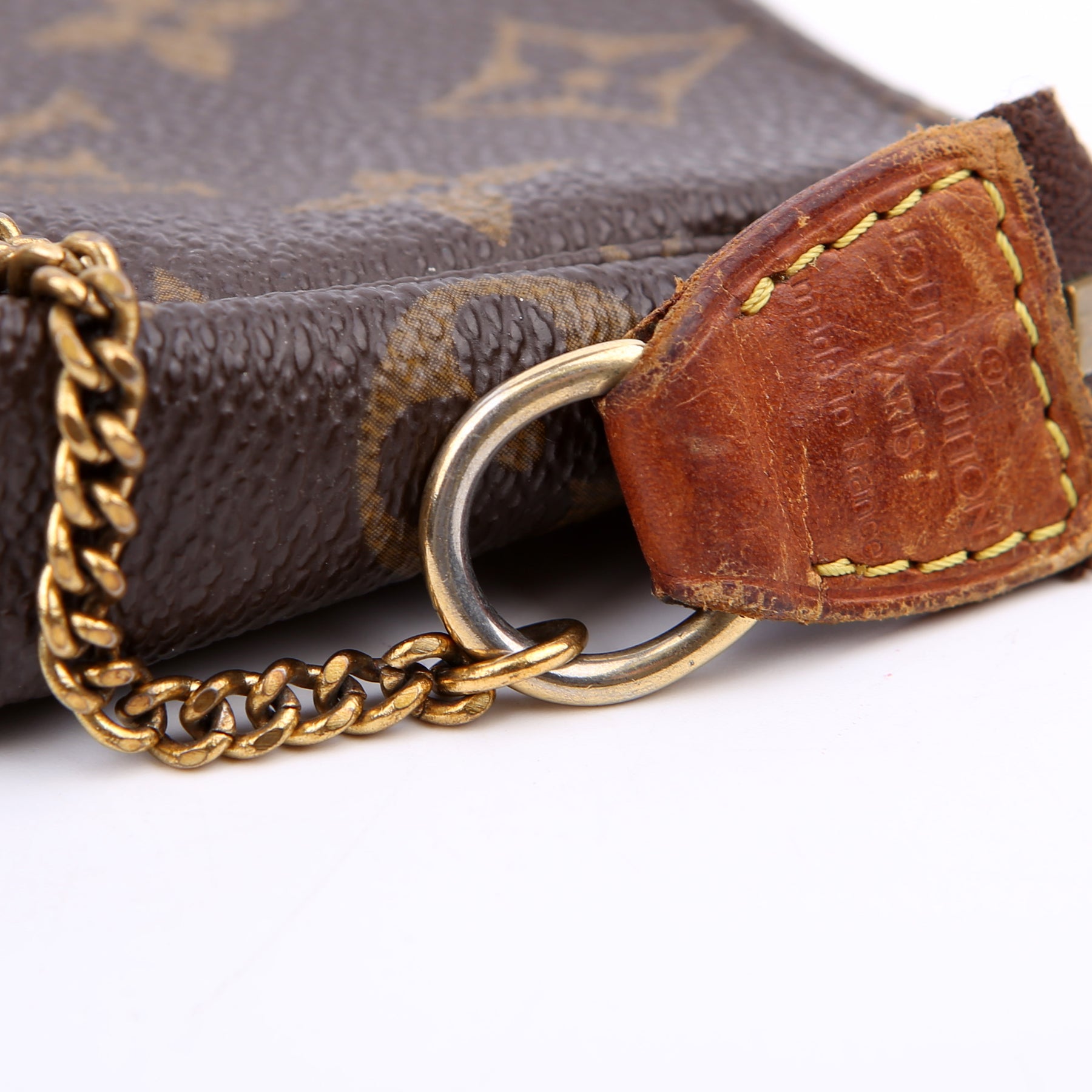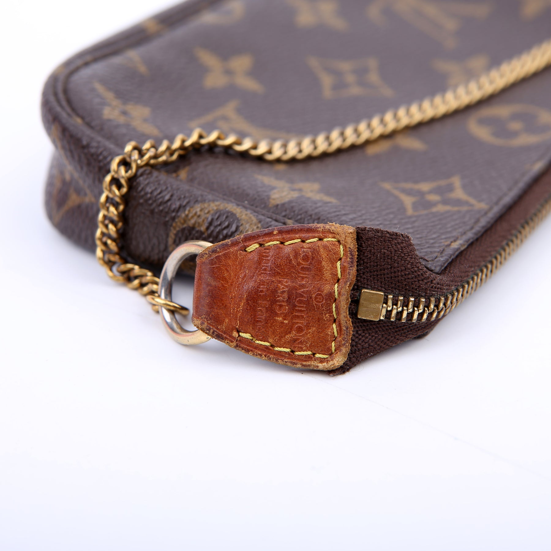 This pre-owned Louis Vuitton Pochette Accessories Mini is guaranteed 100% authentic. The exterior is in the classic Louis Vuitton Monogram coated canvas.