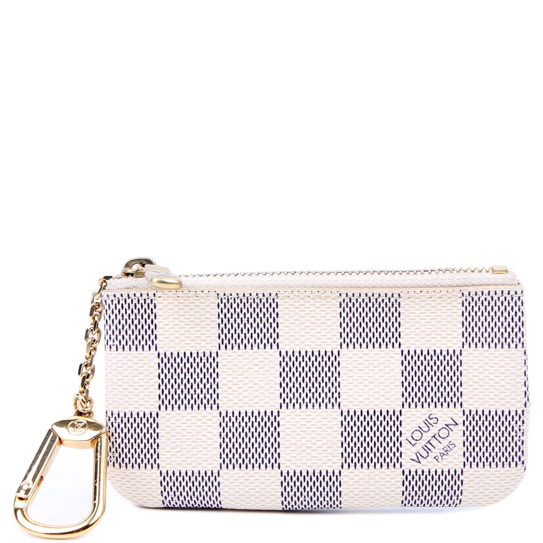 This pre-owned Louis Vuitton Pochette Cles is guaranteed 100% authentic. The exterior is in the classic Damier Azur coated canvas.