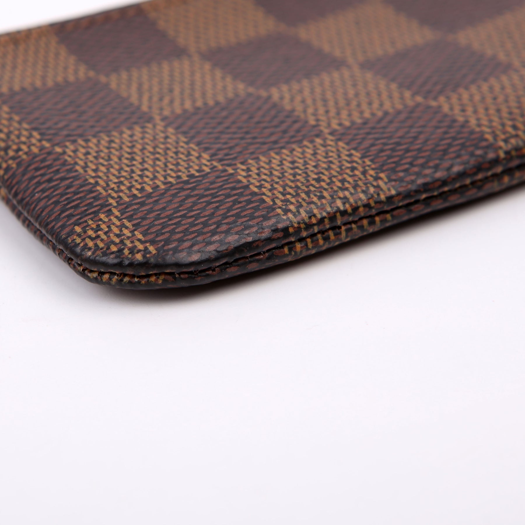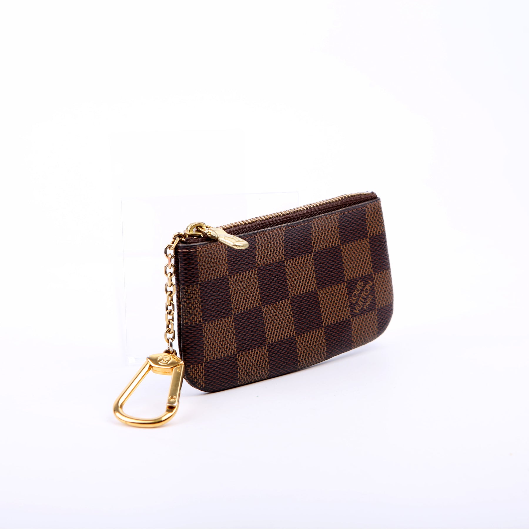 This pre-owned Louis Vuitton Pochette Cles is guaranteed 100% authentic. The exterior is in the classic Louis Vuitton Damier Ebene coated canvas.