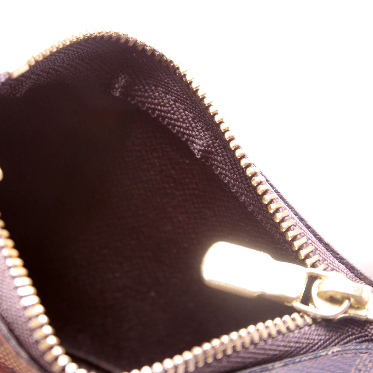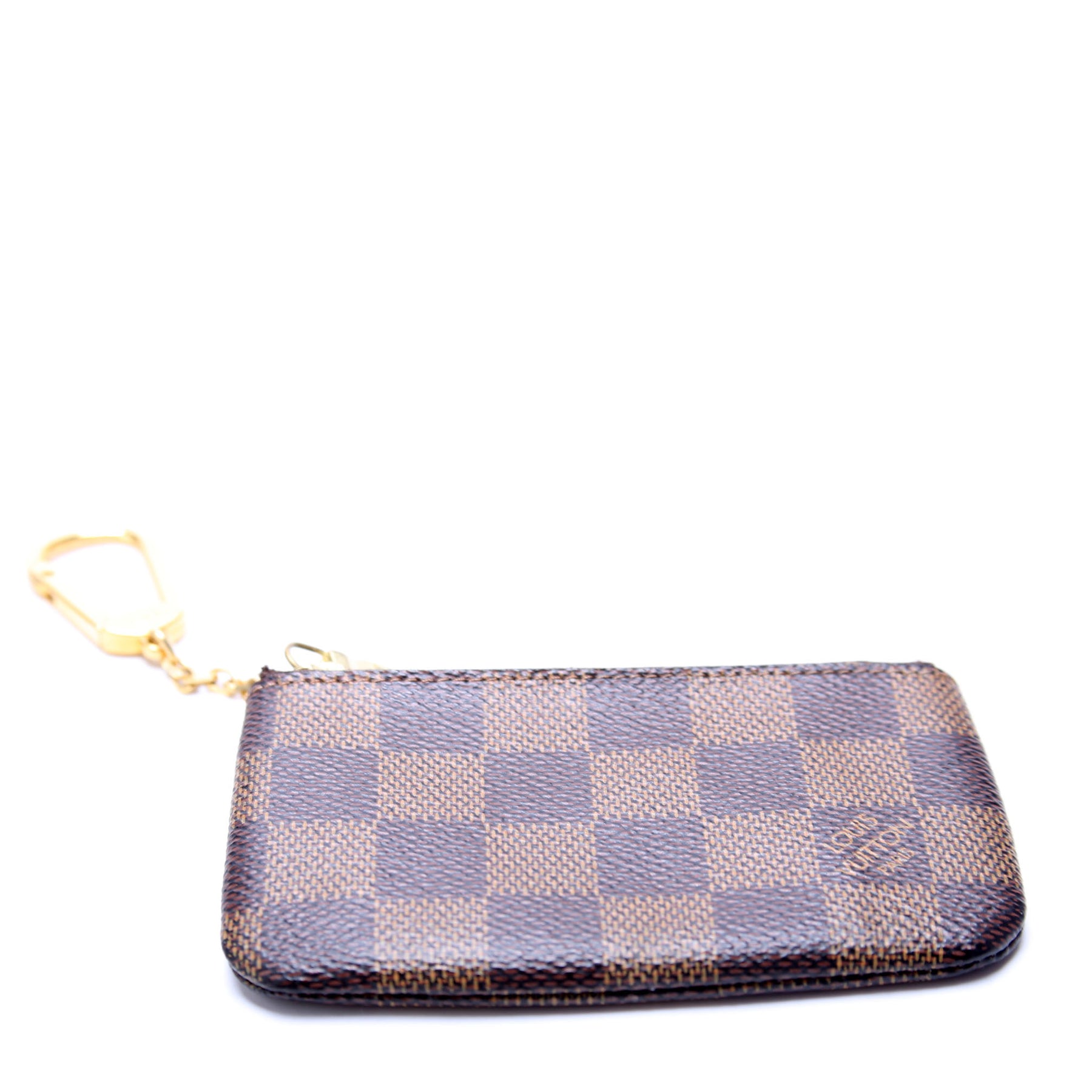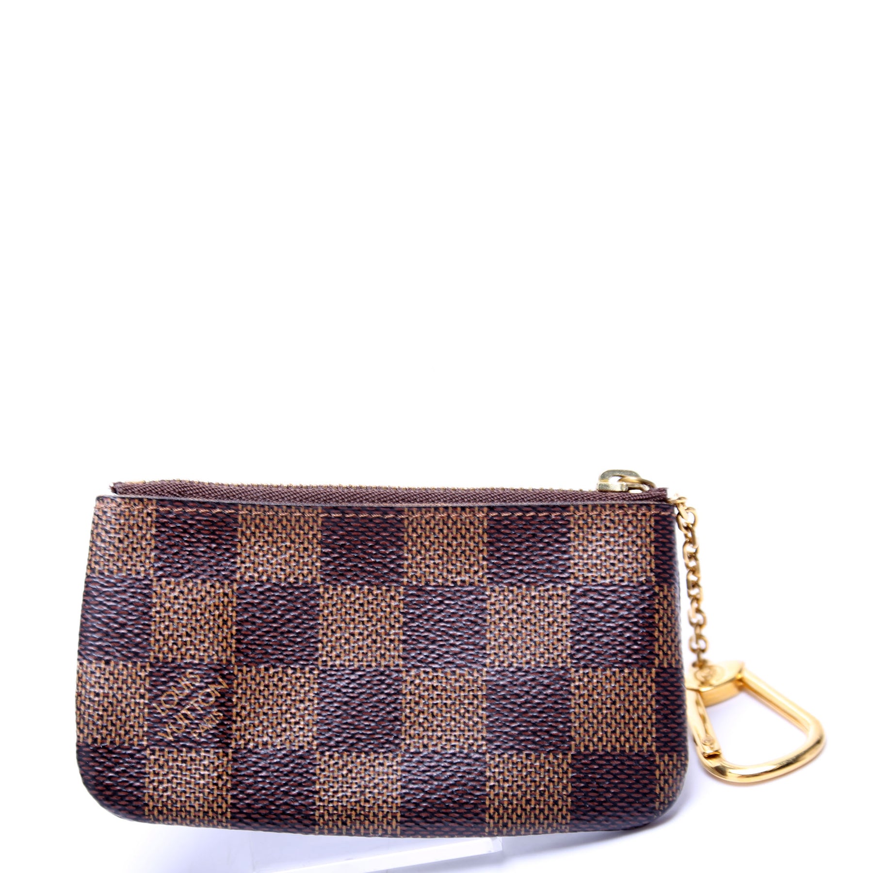This pre-owned Louis Vuitton Pochette Cles is guaranteed 100% authentic. The exterior is in the classic Louis Vuitton Damier Ebene coated canvas.