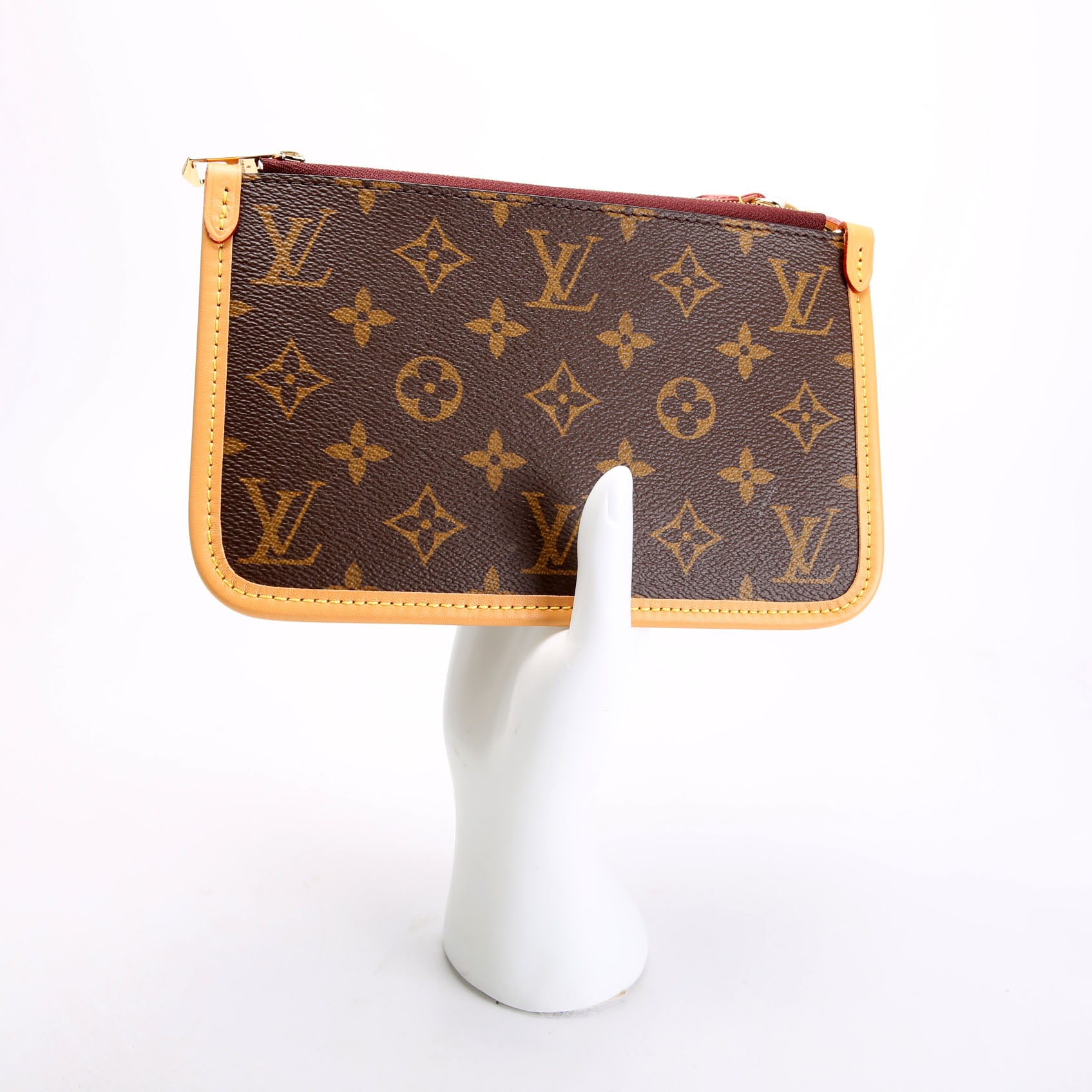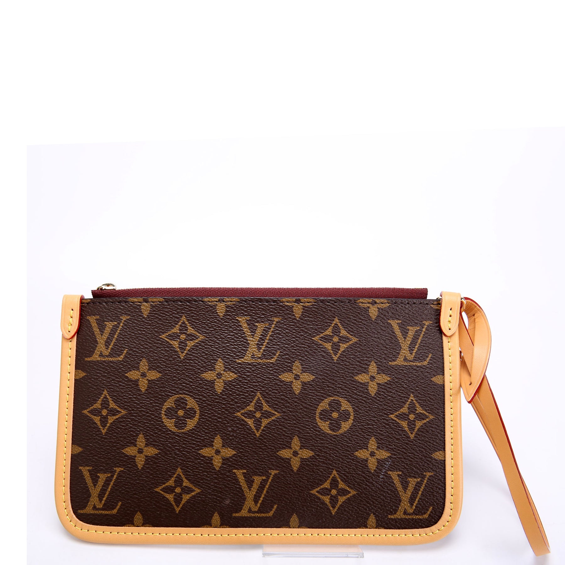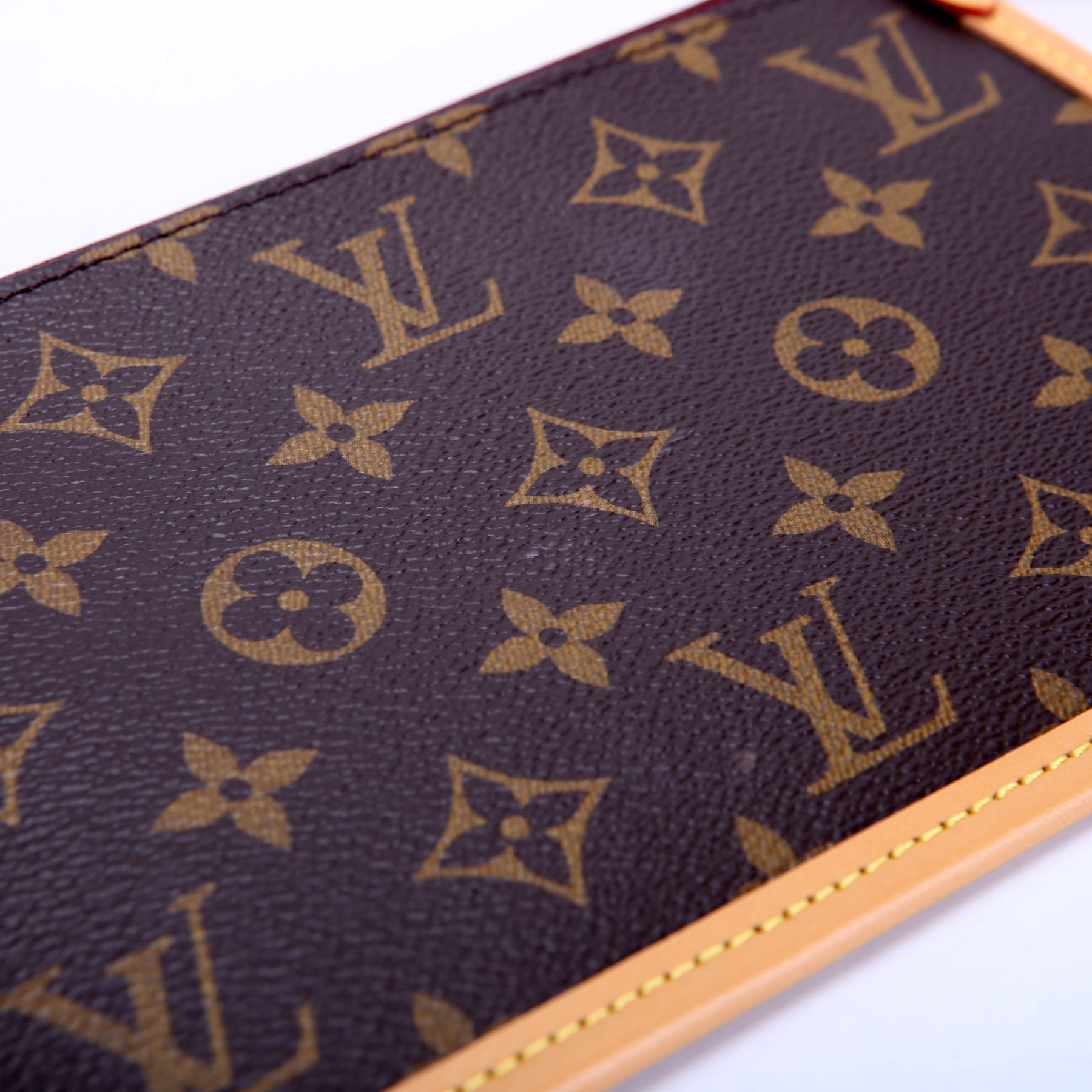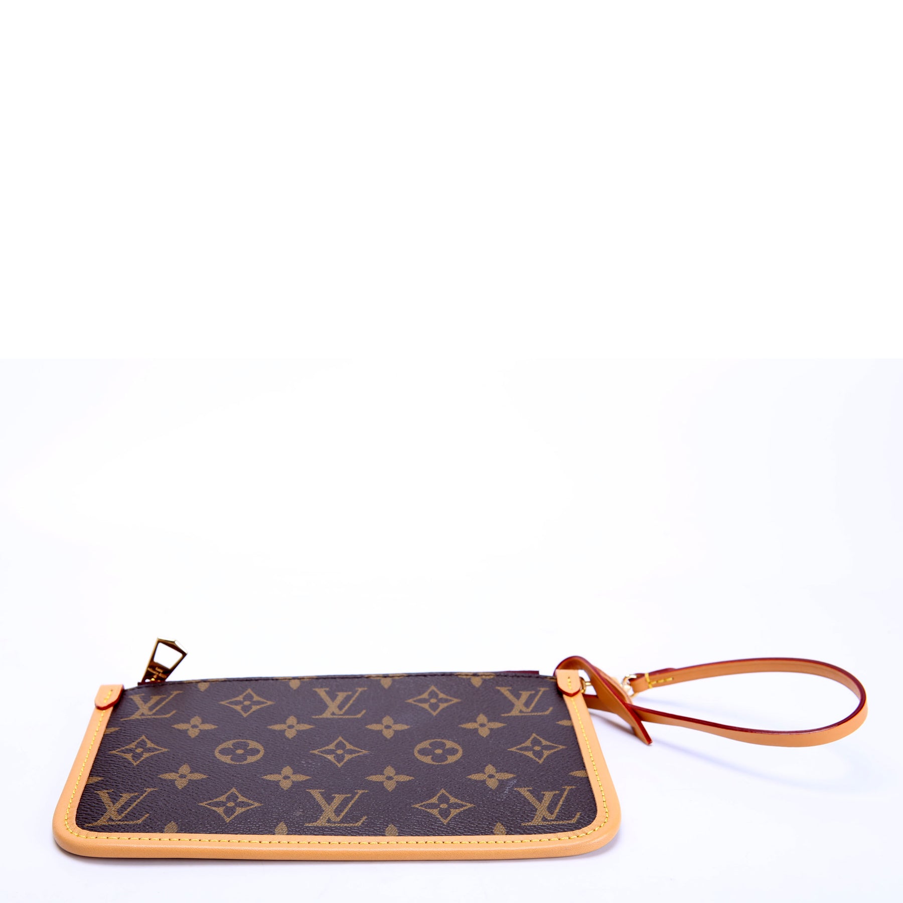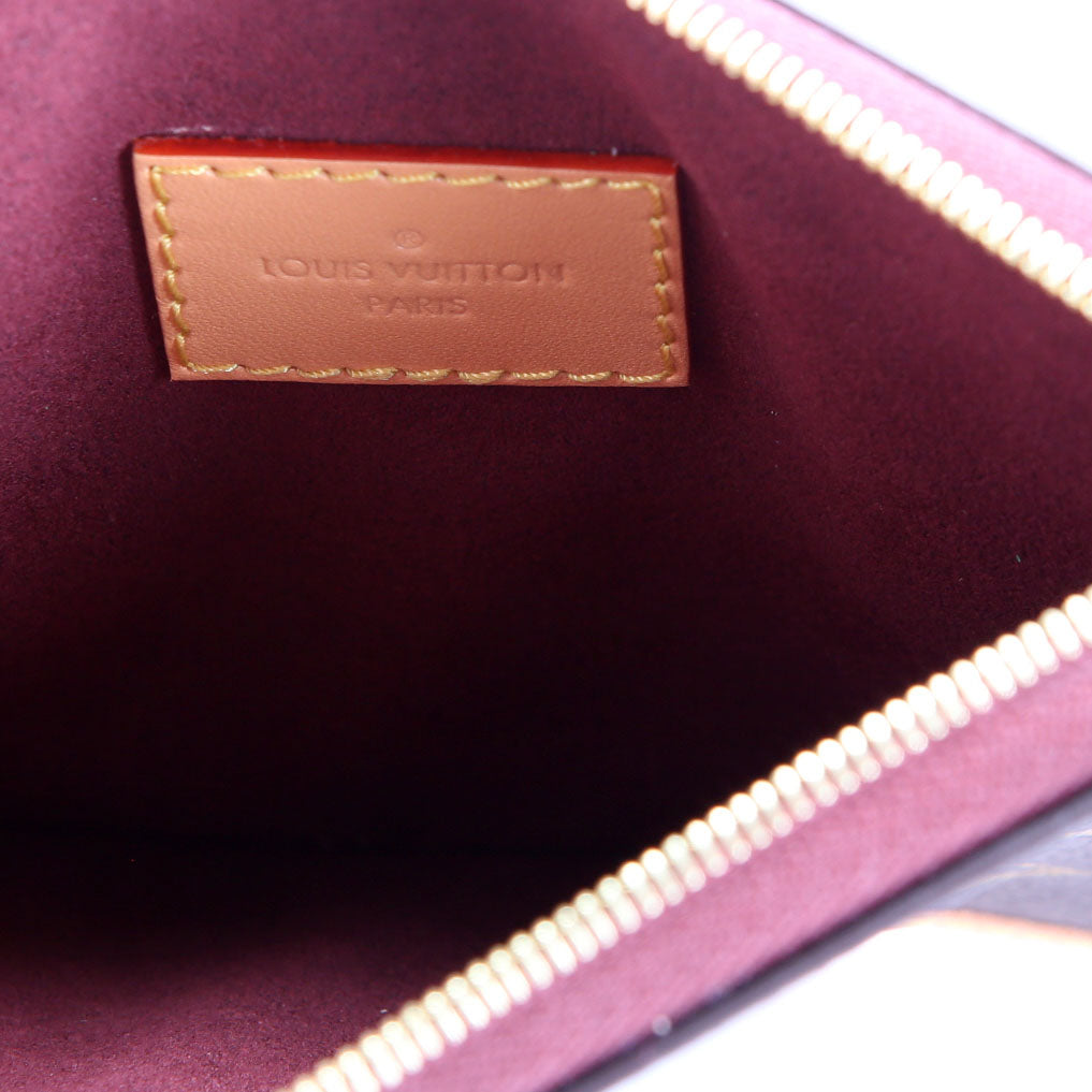 These pre-owned Louis Vuitton Pochette Only Carrall PM are guaranteed 100% authentic. The exterior is in the classic Monogram coated canvas.