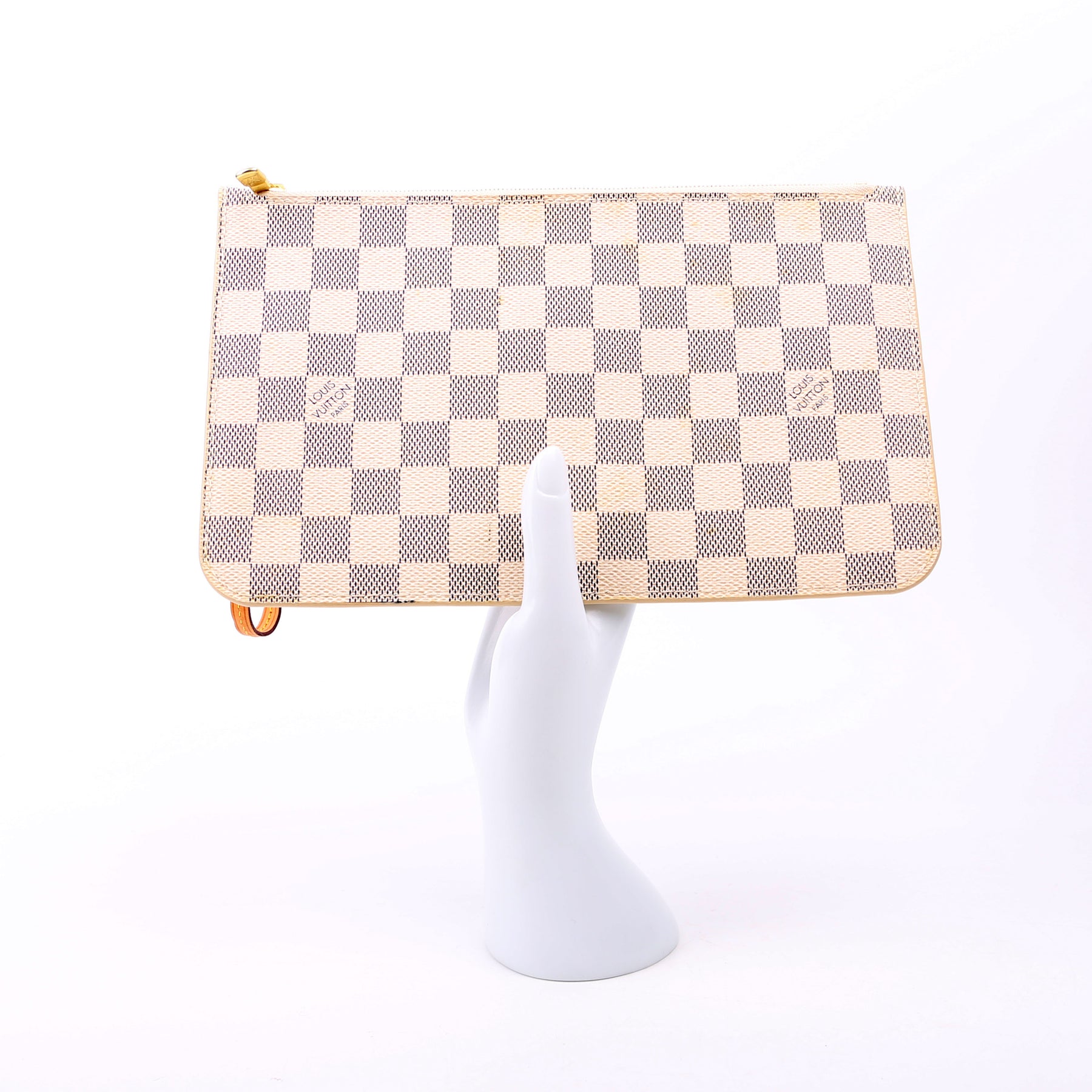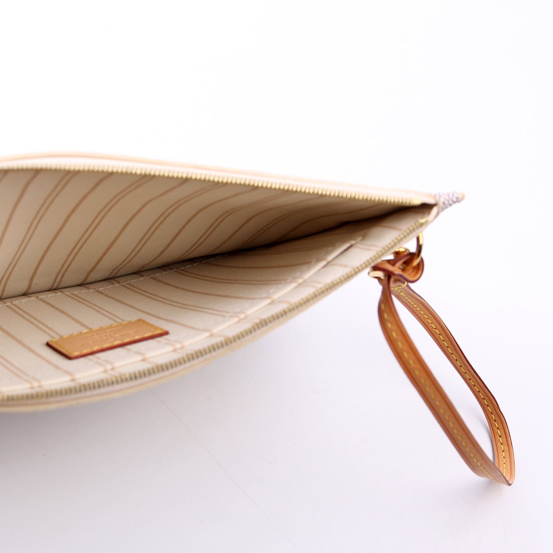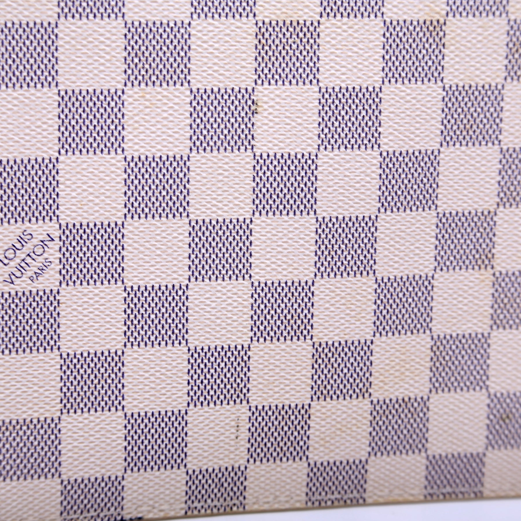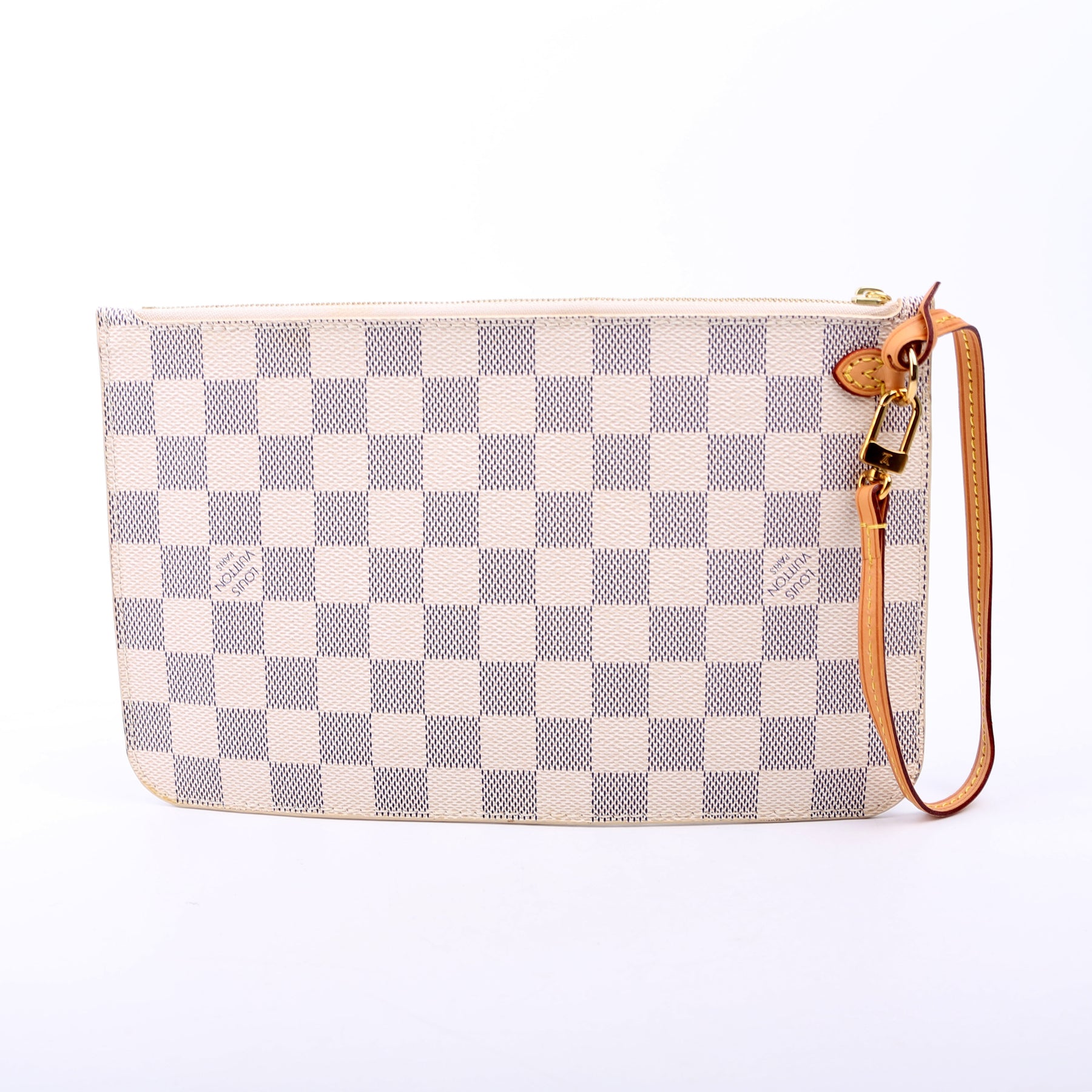 This pre-owned Louis Vuitton Pochette Only Neverfull is guaranteed 100% authentic. The exterior is in the classic Damier Azur coated canvas.