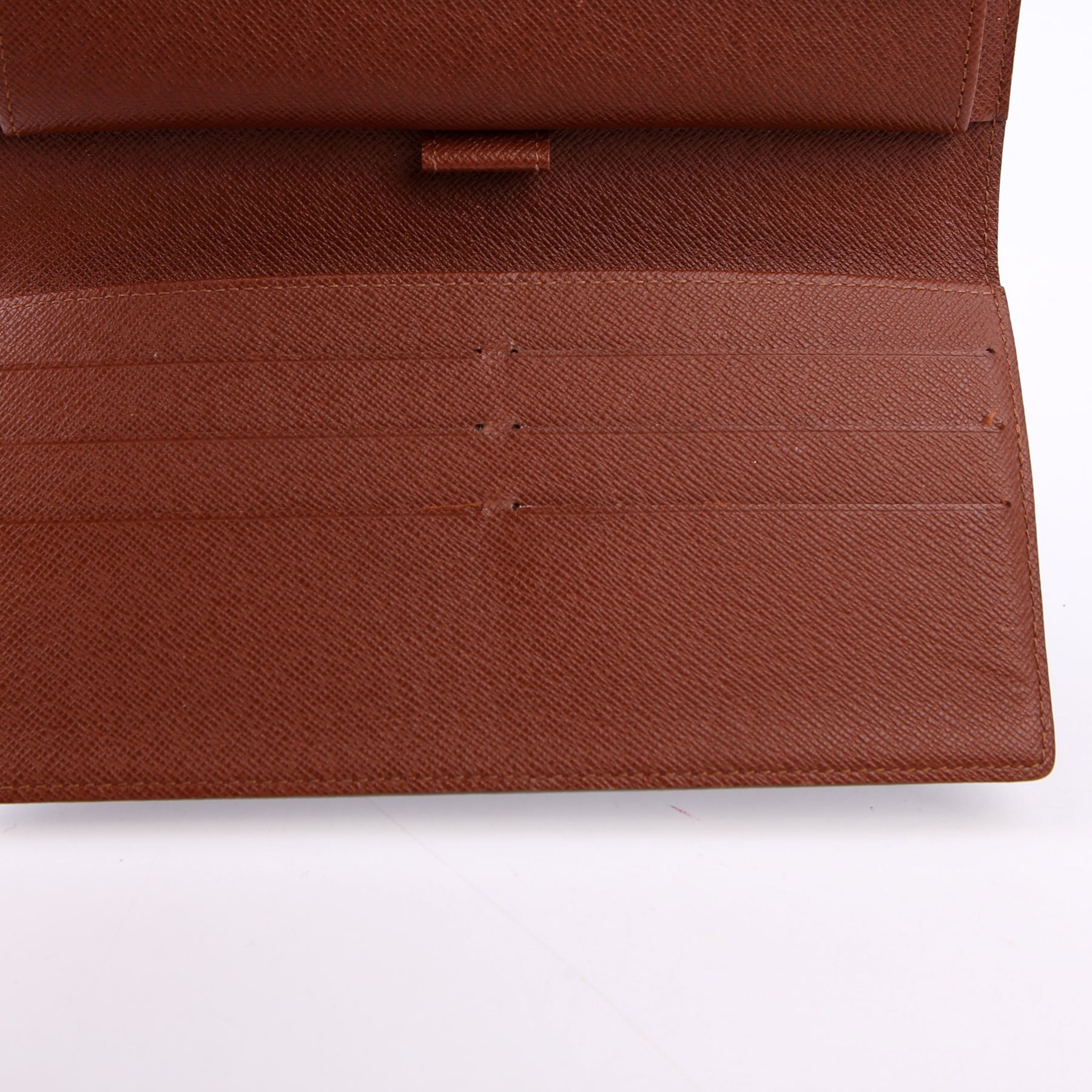 Interior: The interior shows minor wear throughout, and features six card slots, two bill slots, one snap closure pocket, and one pen holder.
