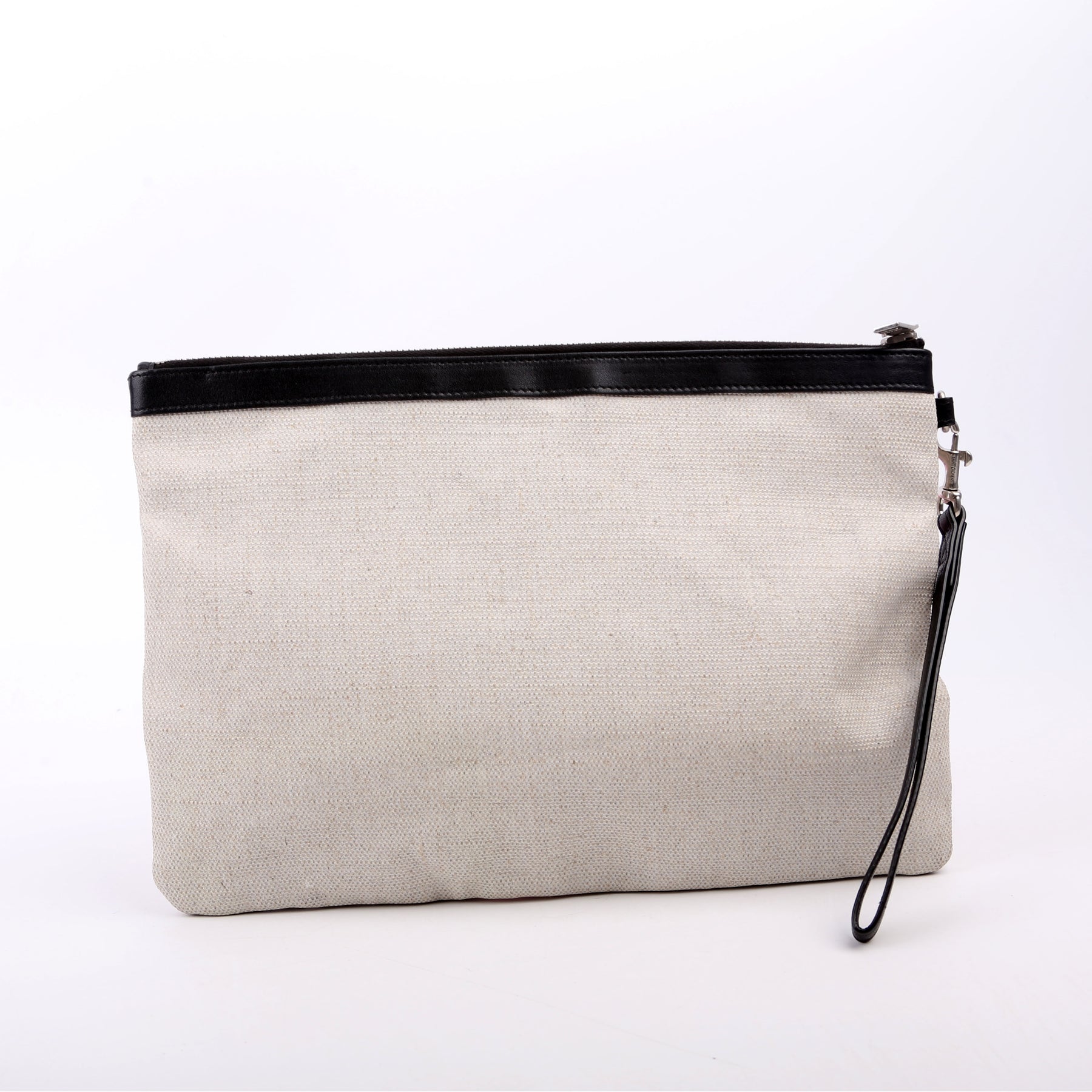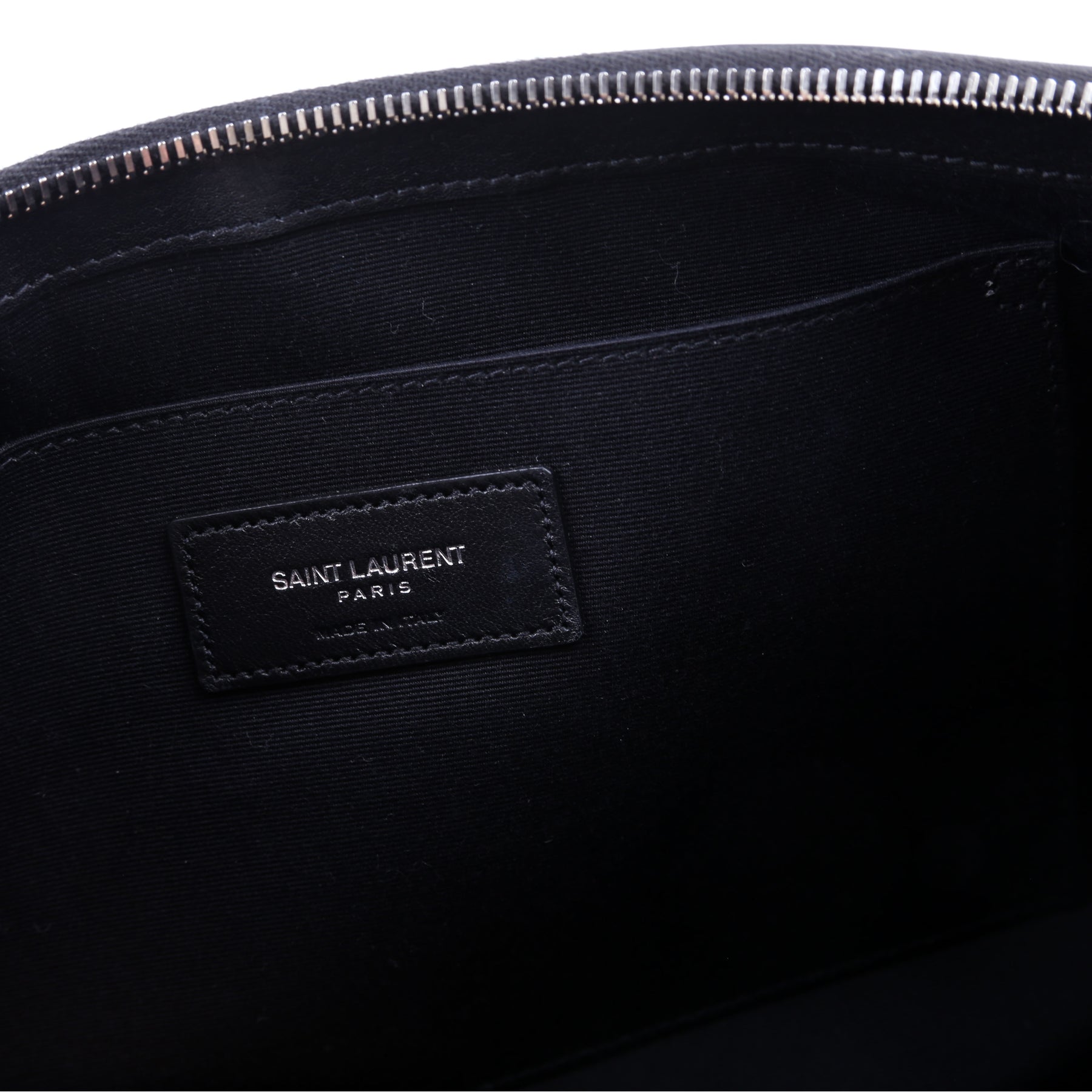This pre-owned Saint Laurent Rive Gauche Wristlet Pouch is guaranteed 100% authentic. The exterior is in the classic Saint Laurent canvas.