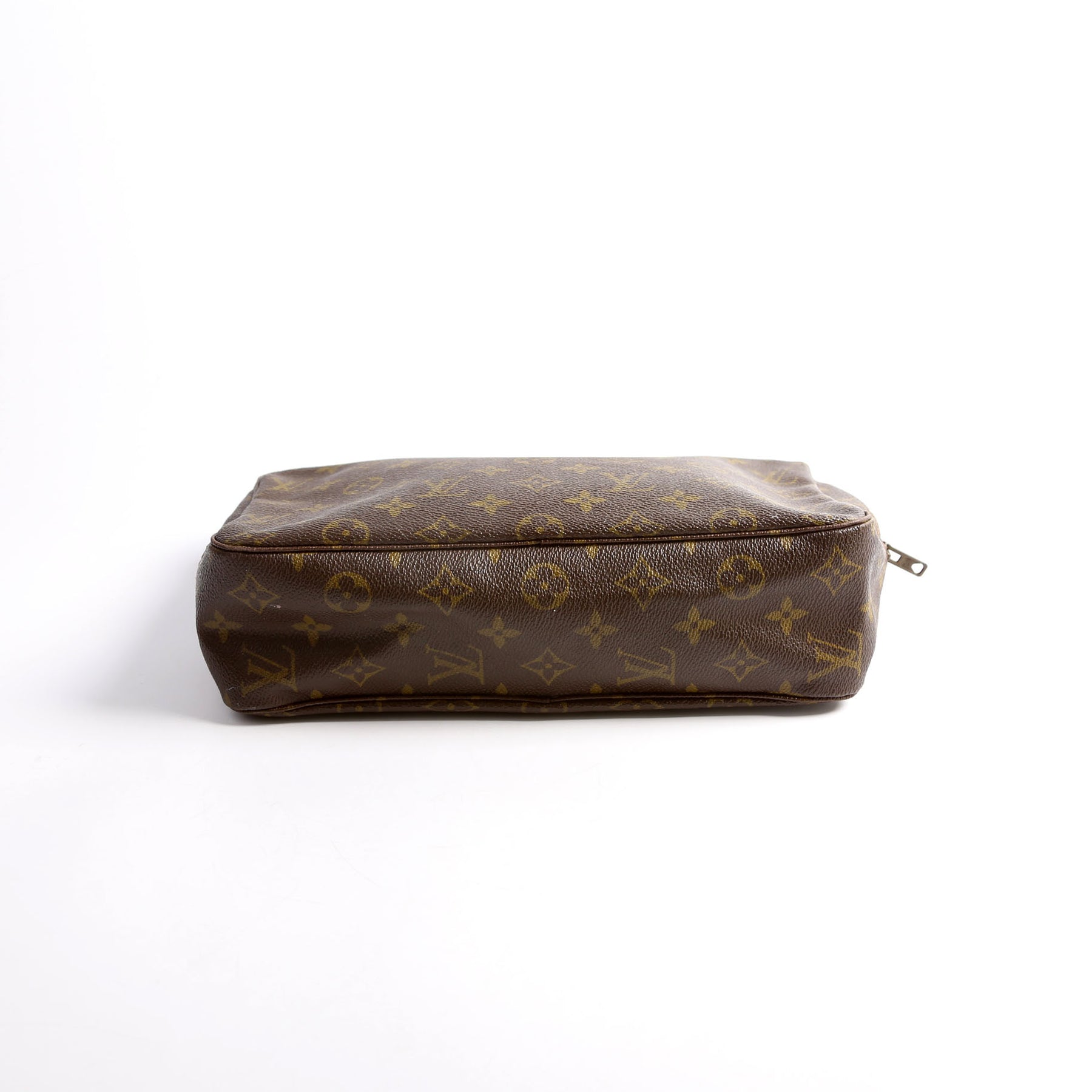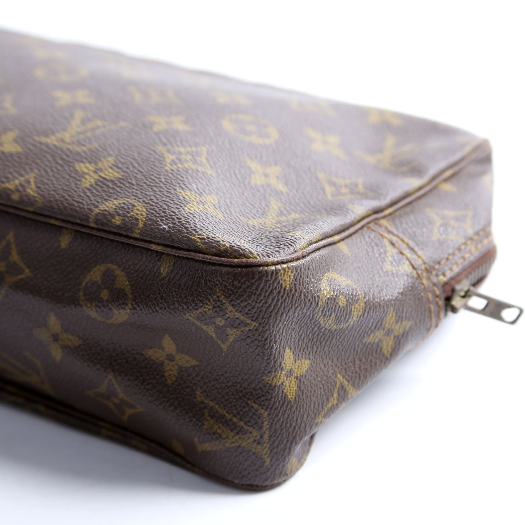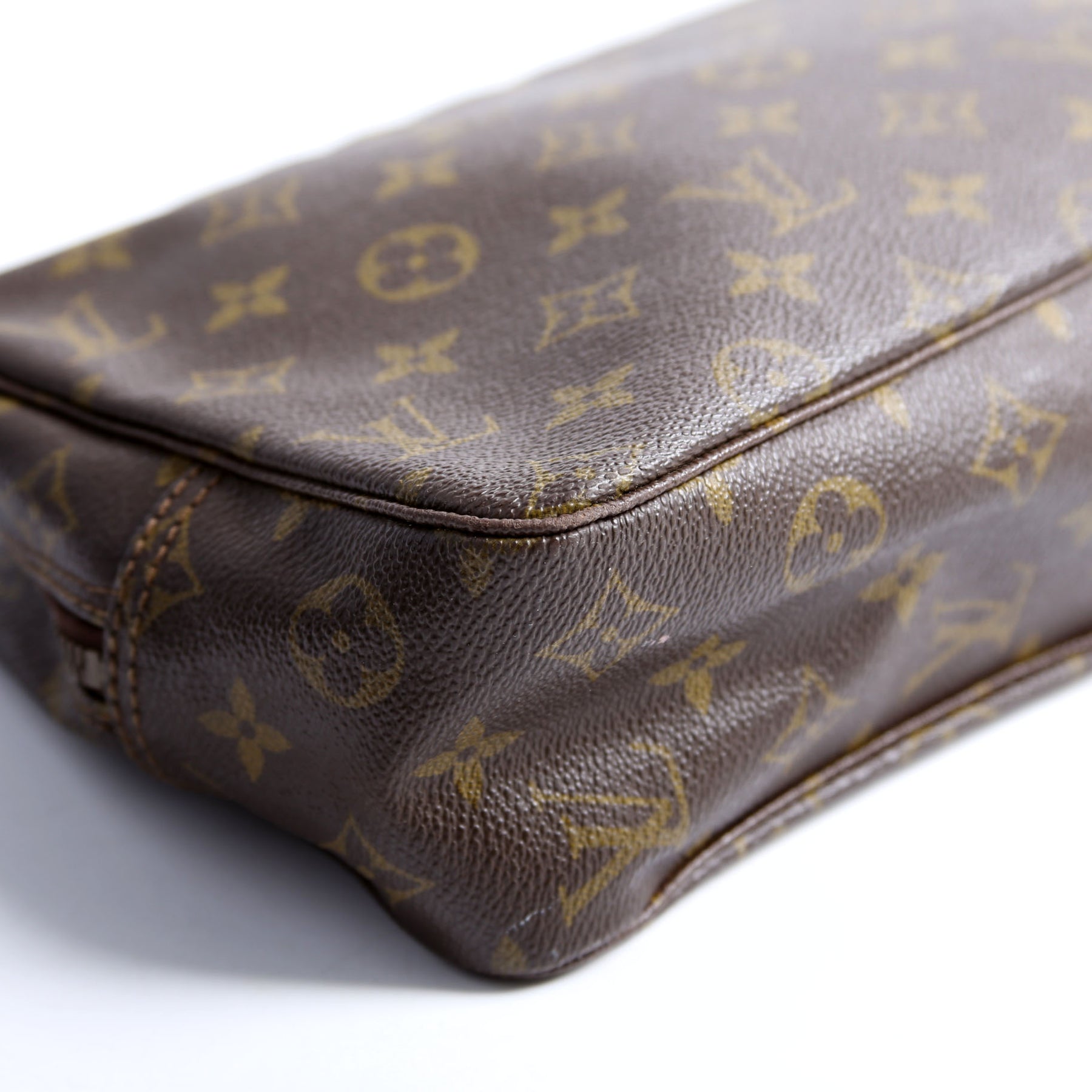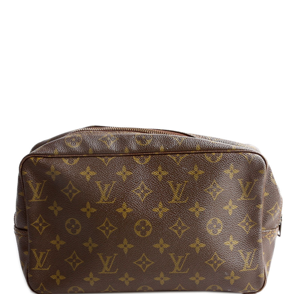 This pre-owned Louis Vuitton Trousse Toilette 28 is guaranteed 100% authentic. The exterior is in the classic Louis Vuitton Monogram coated canvas.