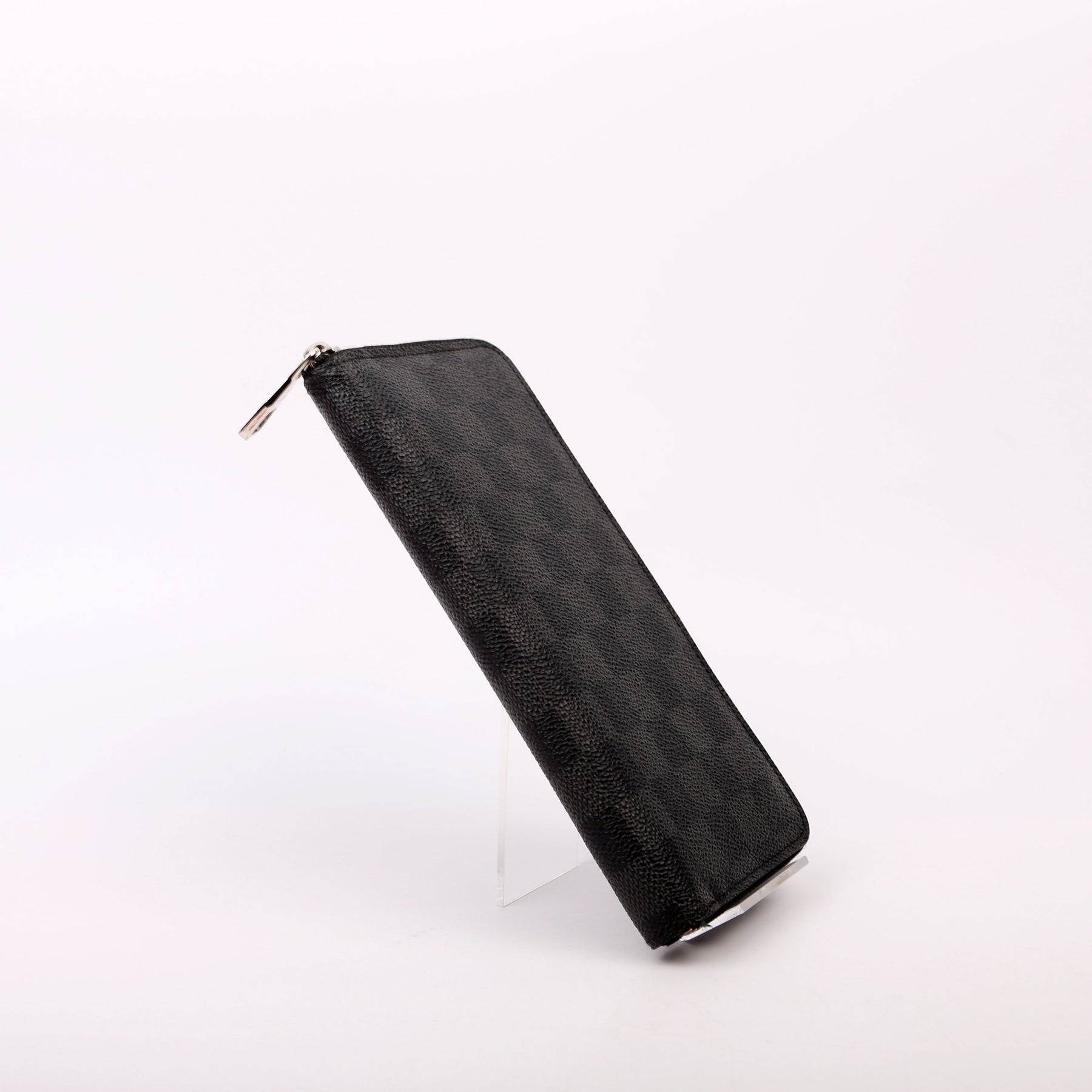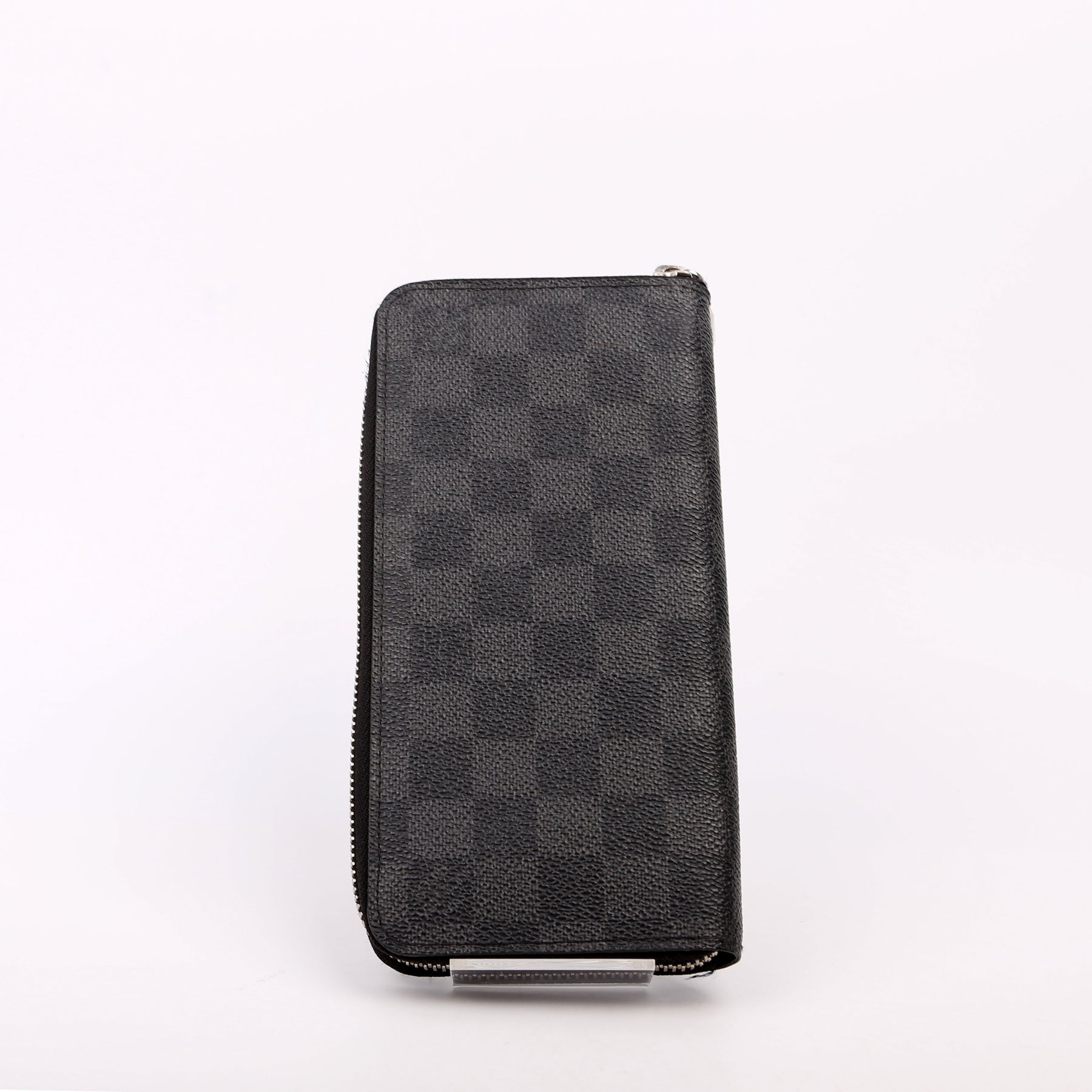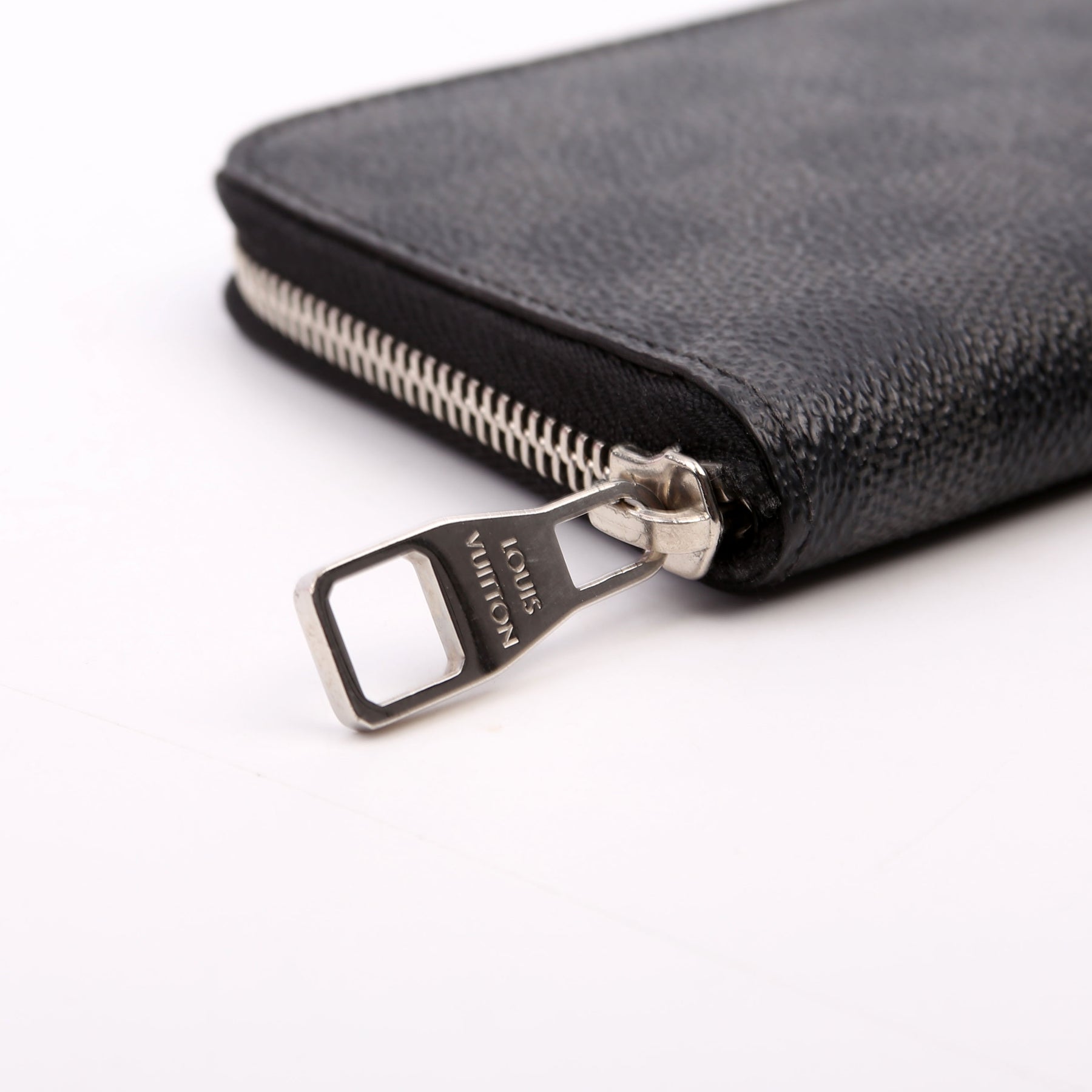 This pre-owned Louis Vuitton Zippy Organizer is guaranteed 100% authentic. The exterior is in the classic Louis Vuitton Damier Graphite coated canvas.