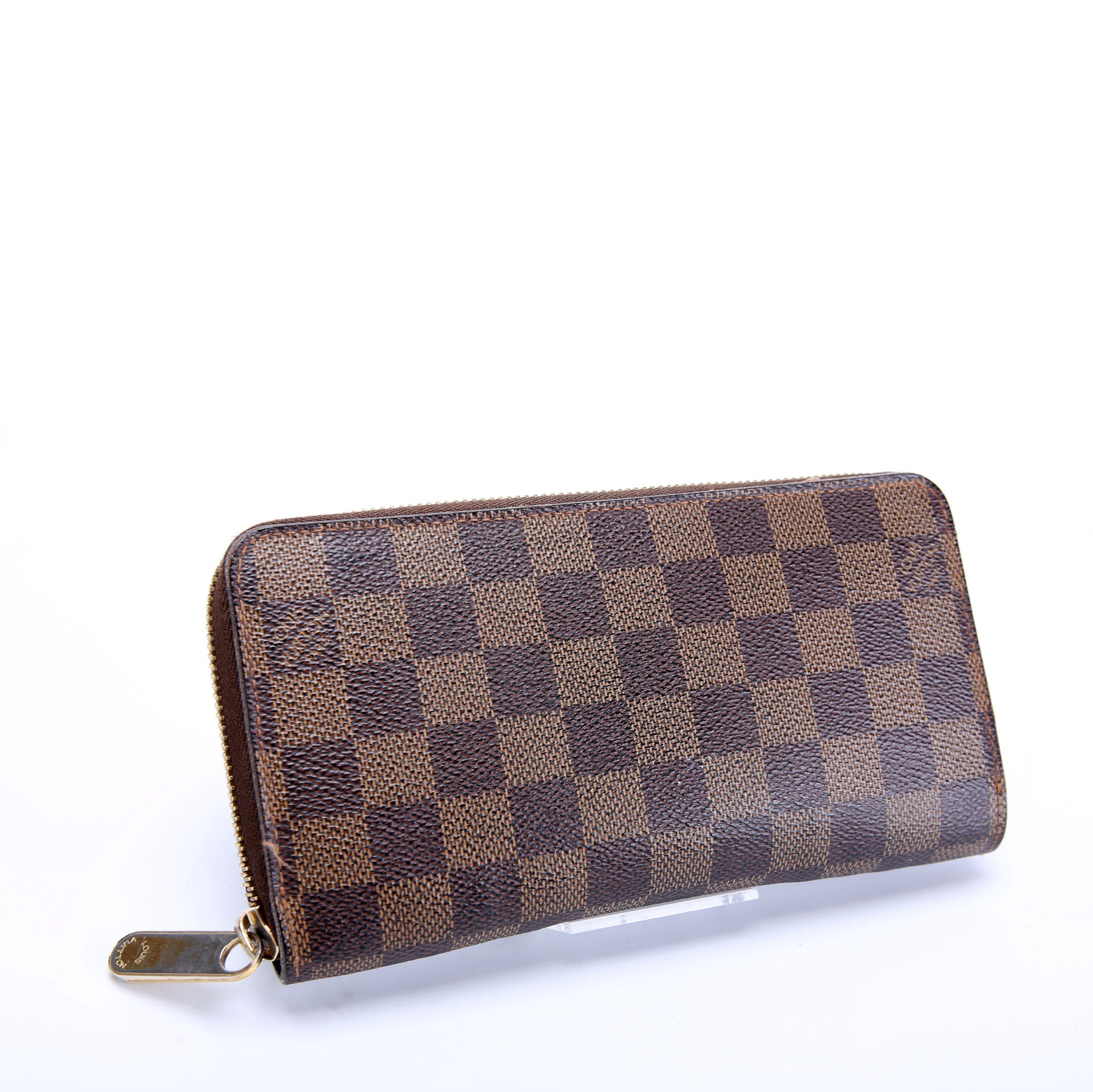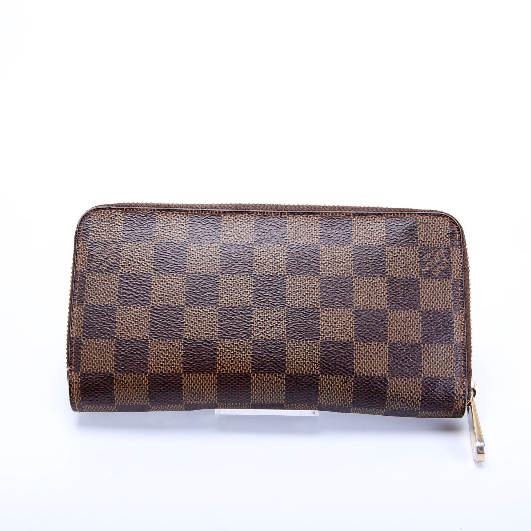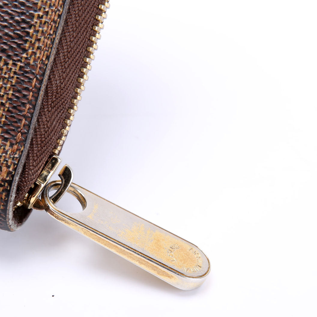 This pre-owned Louis Vuitton Zippy Wallet is guaranteed 100% authentic. The exterior is in the classic Louis Vuitton Damier Ebene coated canvas.