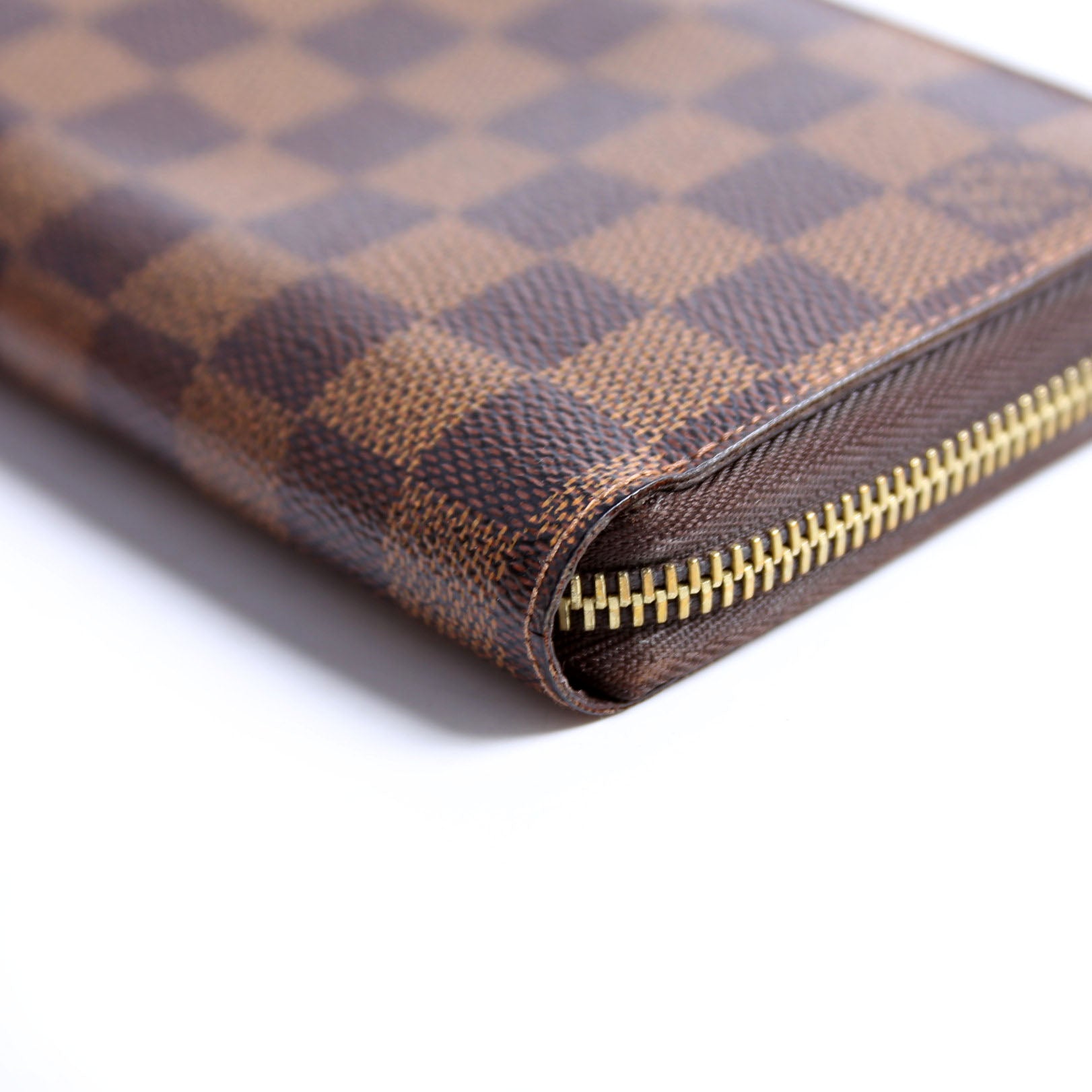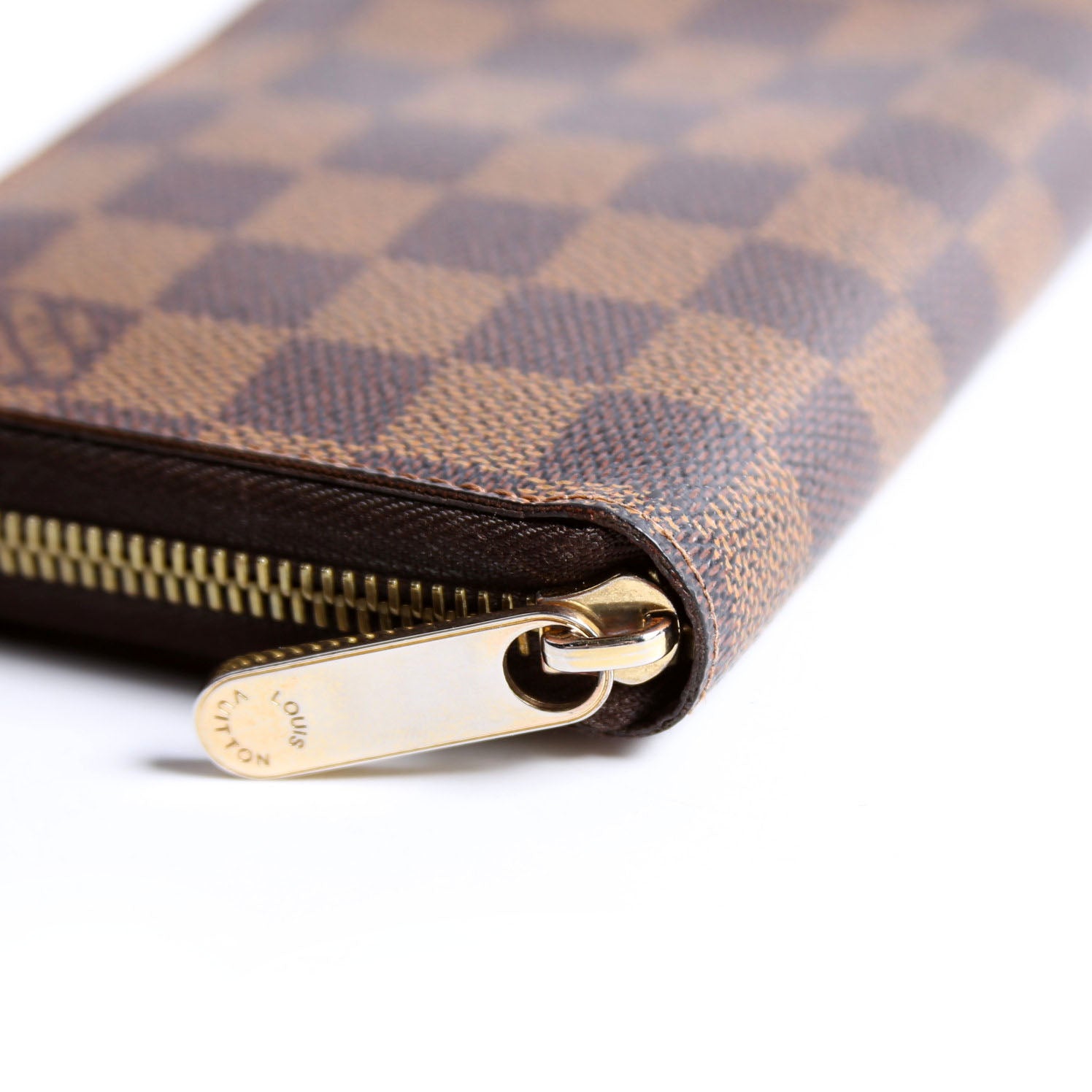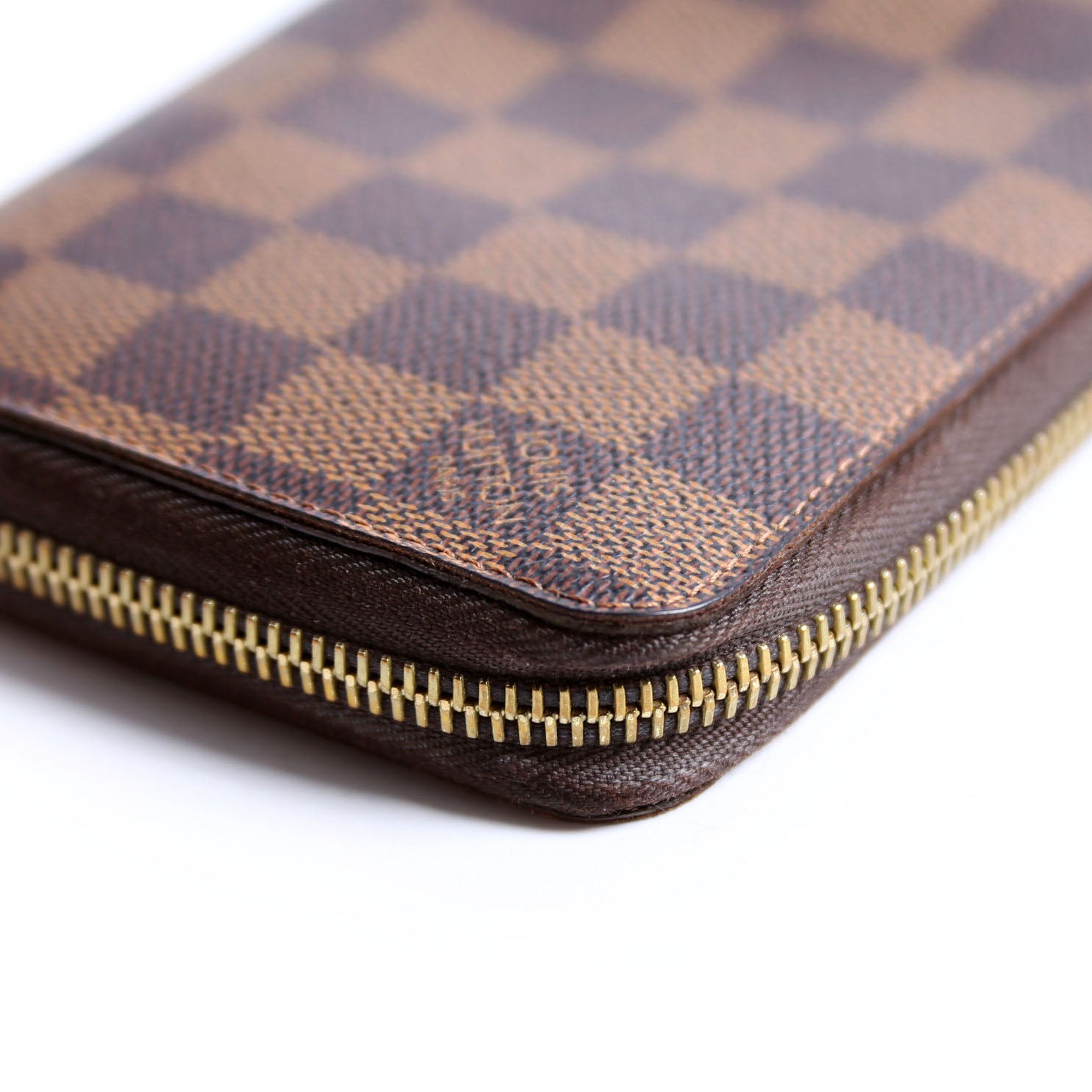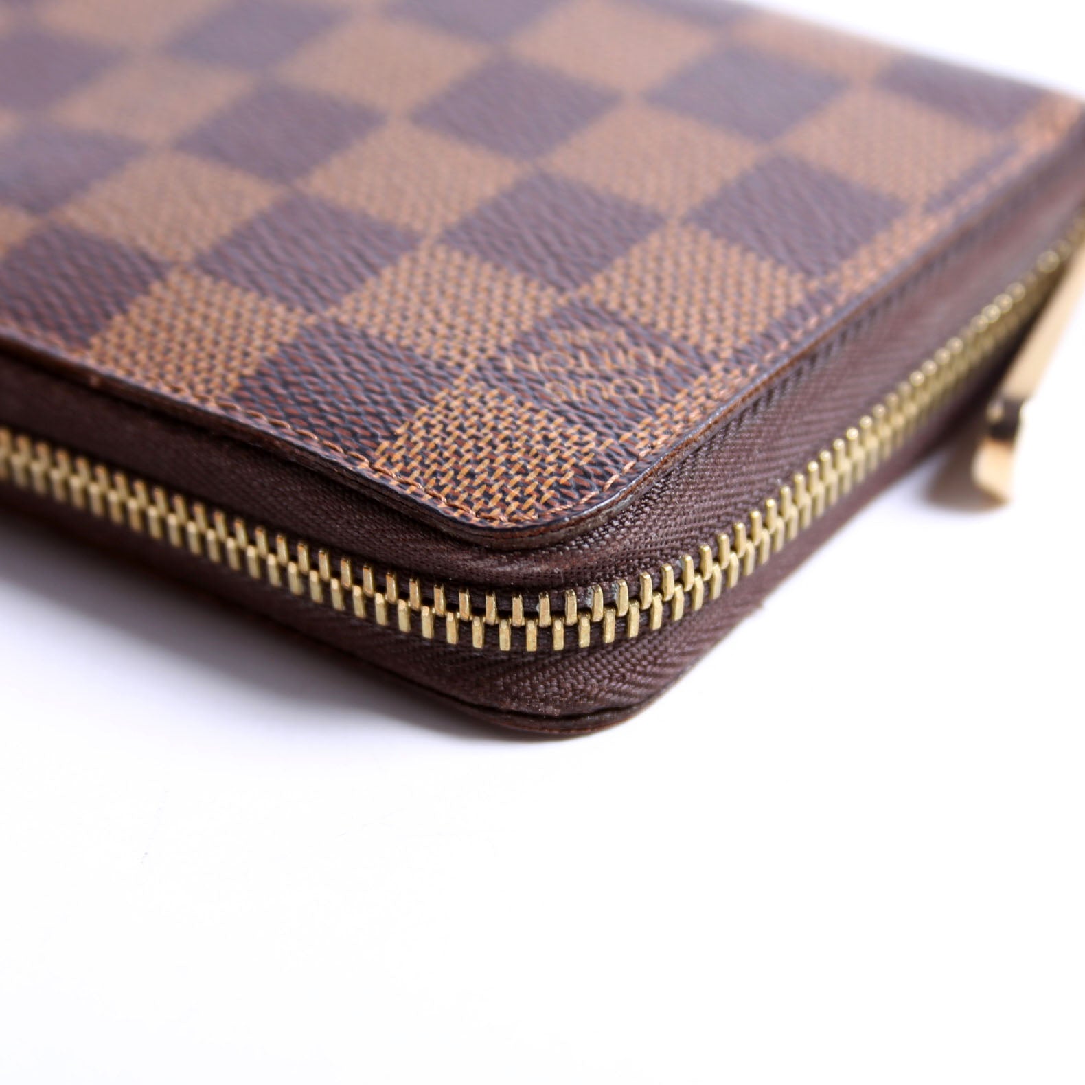 This pre-owned Louis Vuitton Zippy Wallet is guaranteed 100% authentic. The exterior is in the classic Louis Vuitton Damier Ebene coated canvas.