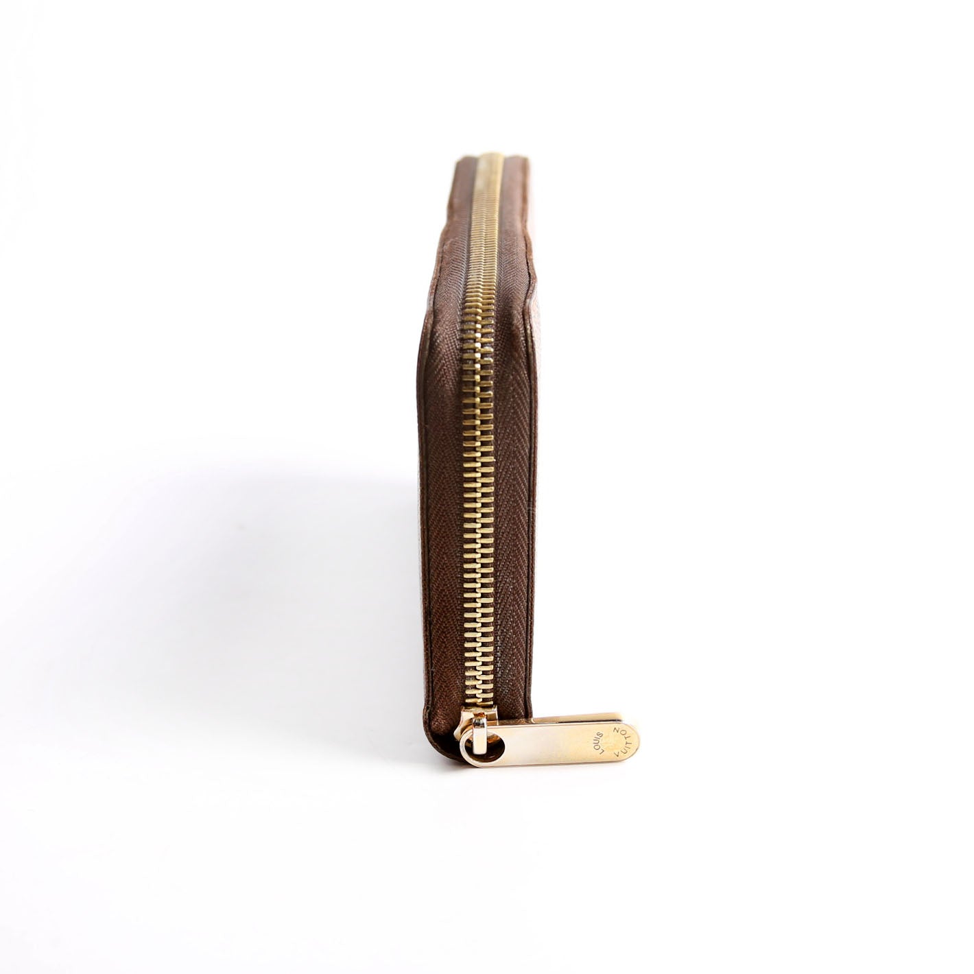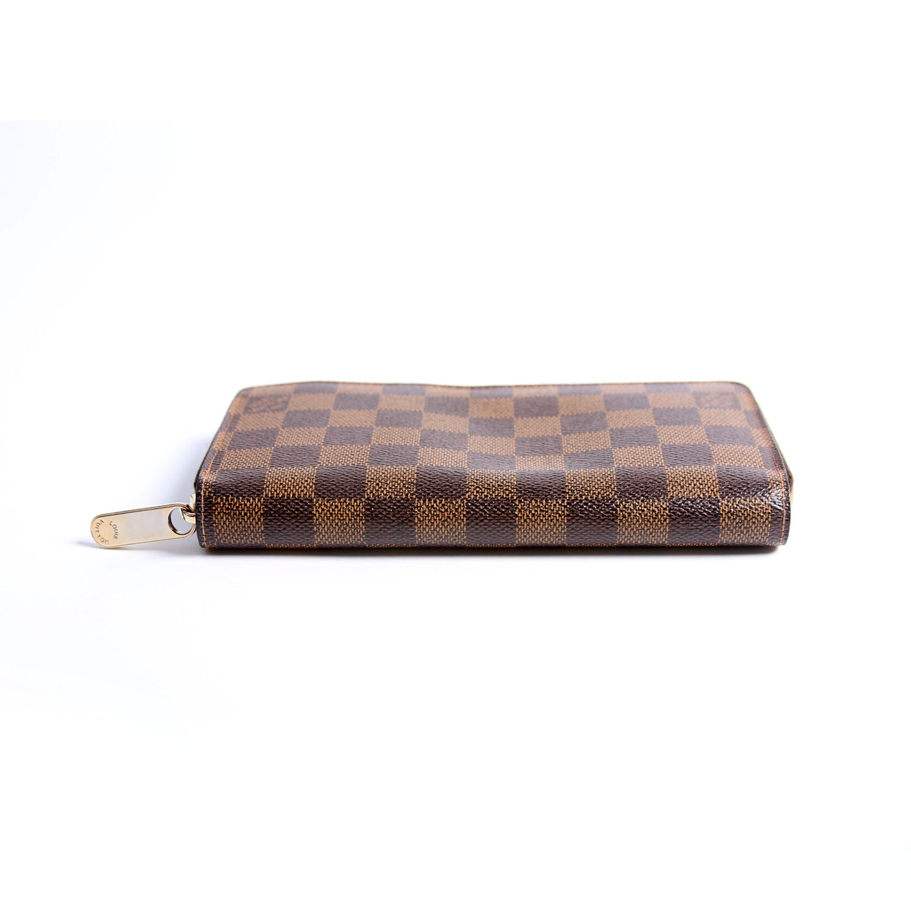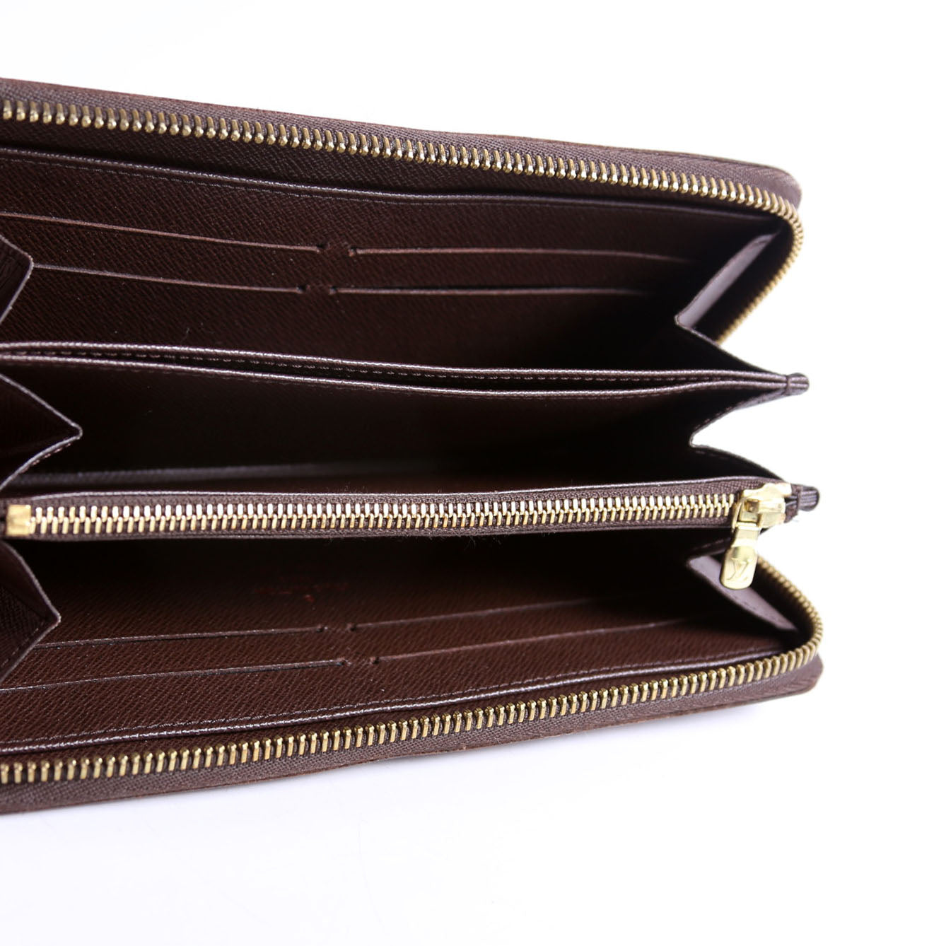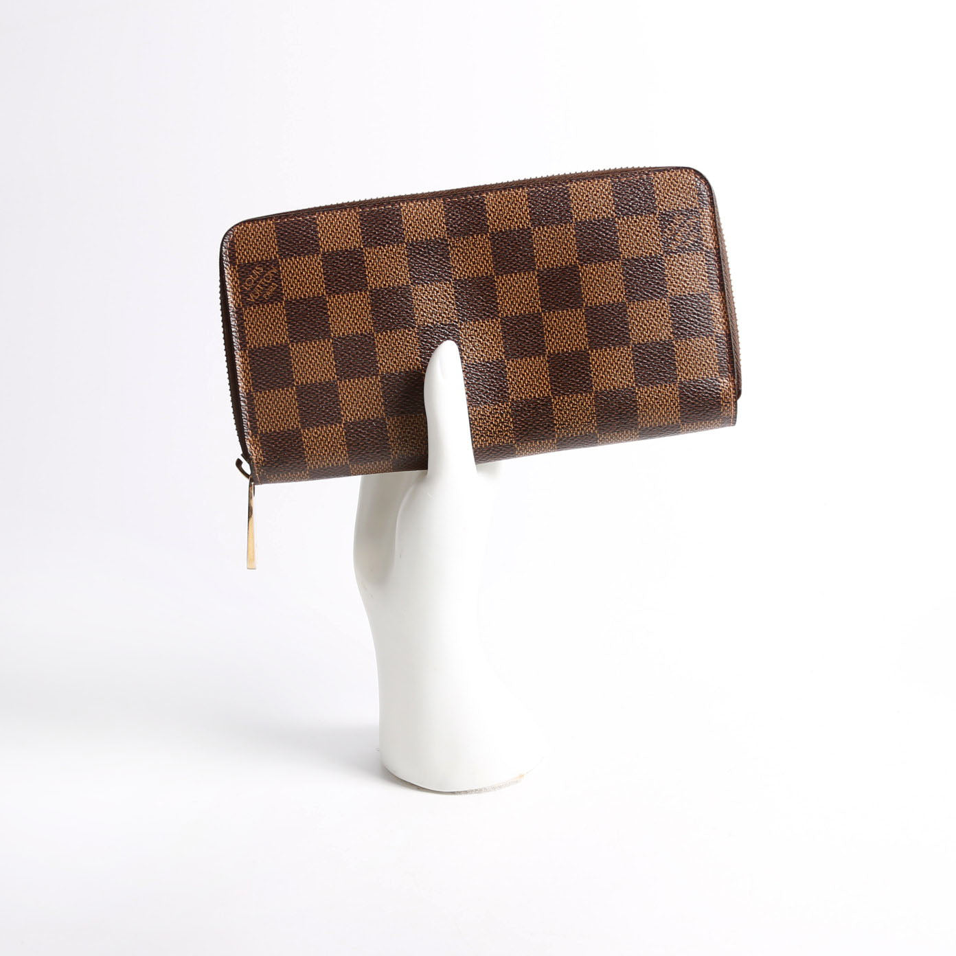 This pre-owned Louis Vuitton Zippy Wallet is guaranteed 100% authentic. The exterior is in the classic Louis Vuitton Damier Ebene coated canvas.
