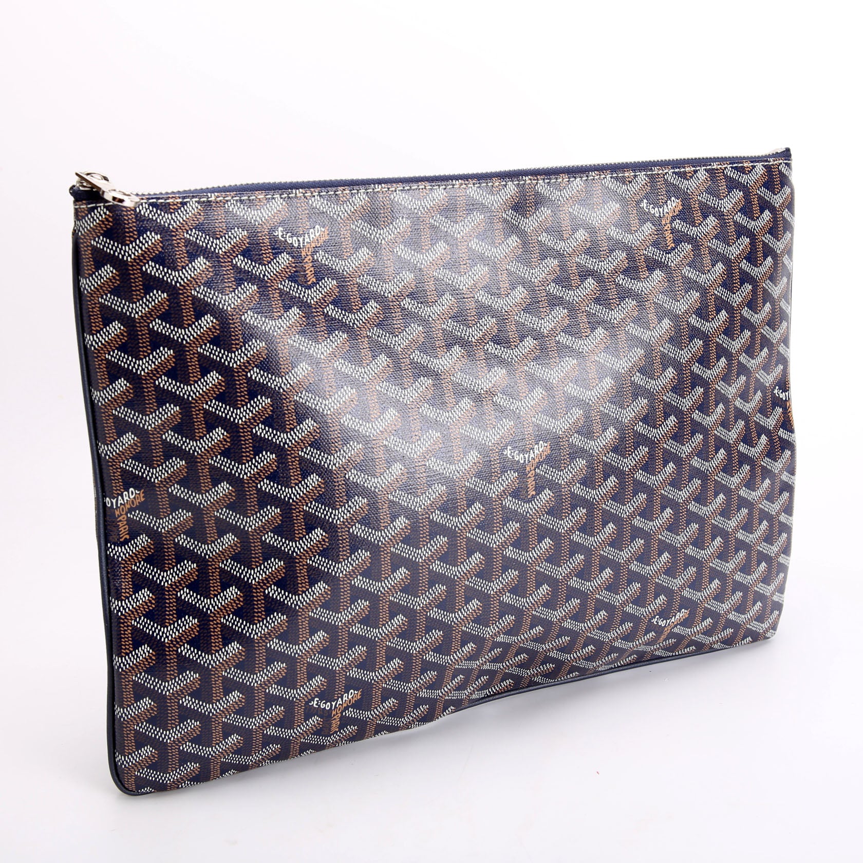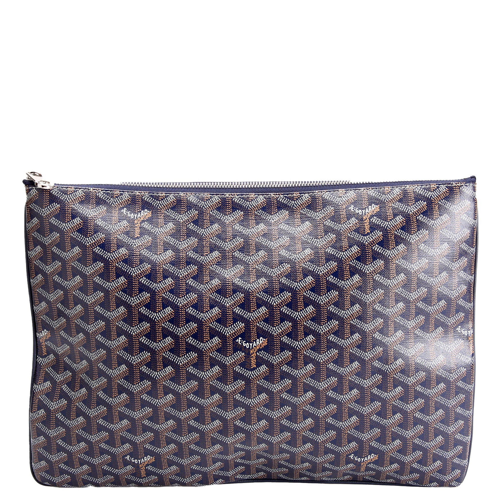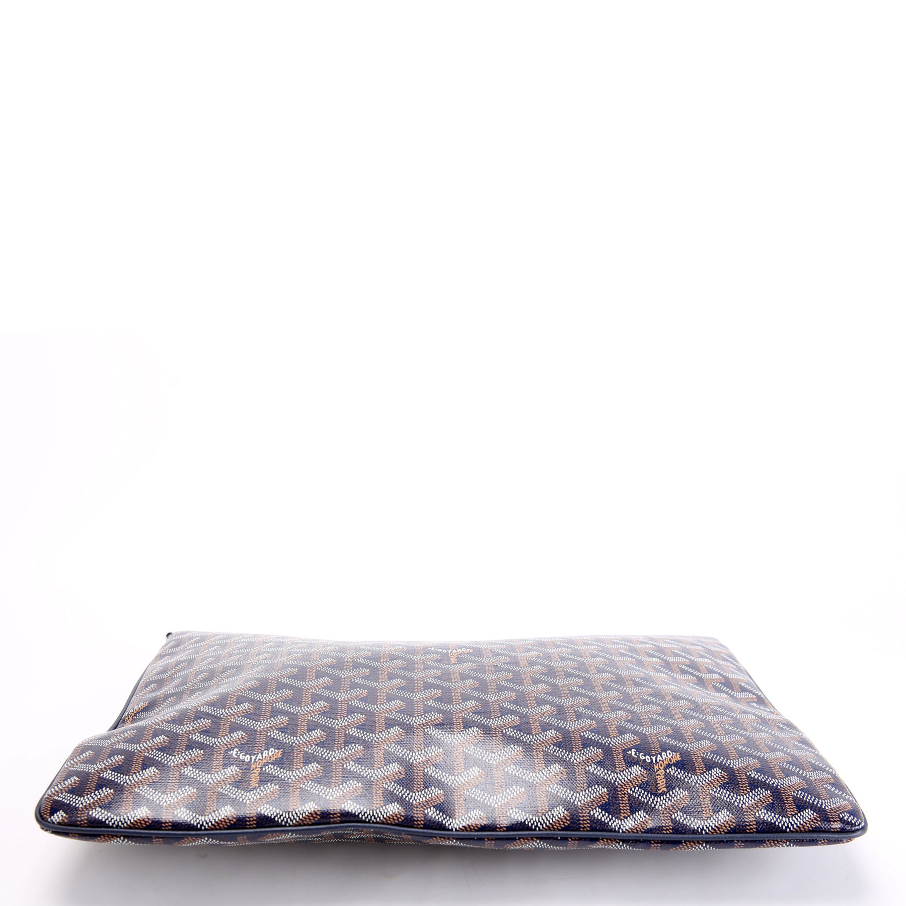 This pre-owned Goyard Senat GM Pouch is guaranteed 100% authentic. The exterior is in the classic Goyard Goyardine Coated Canvas