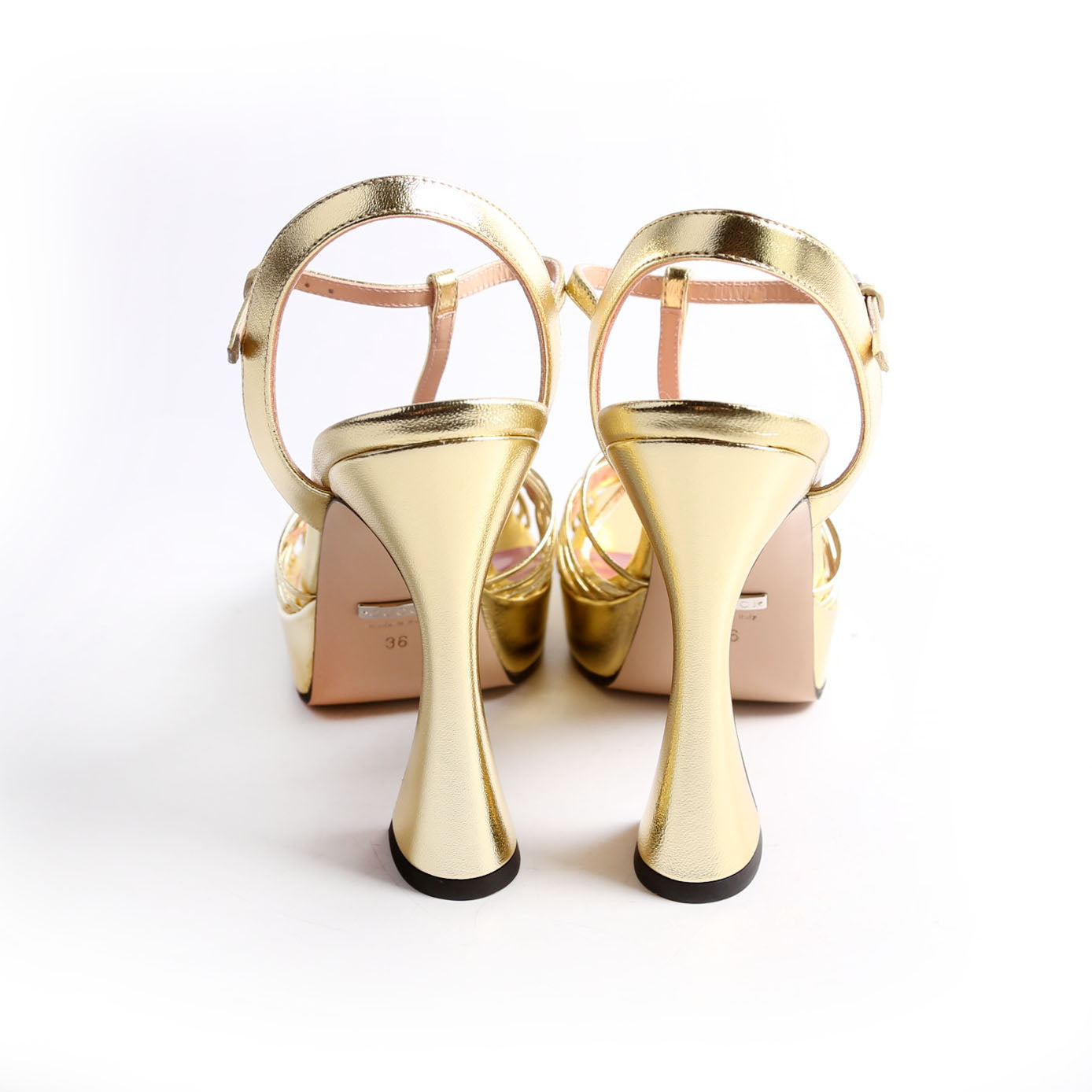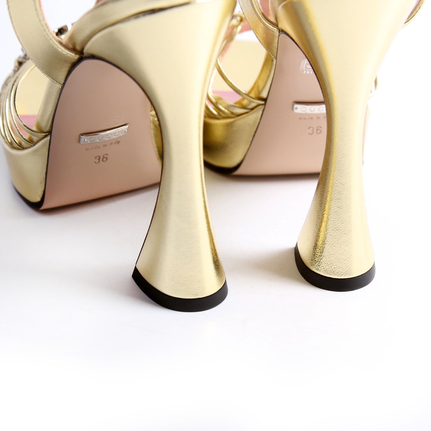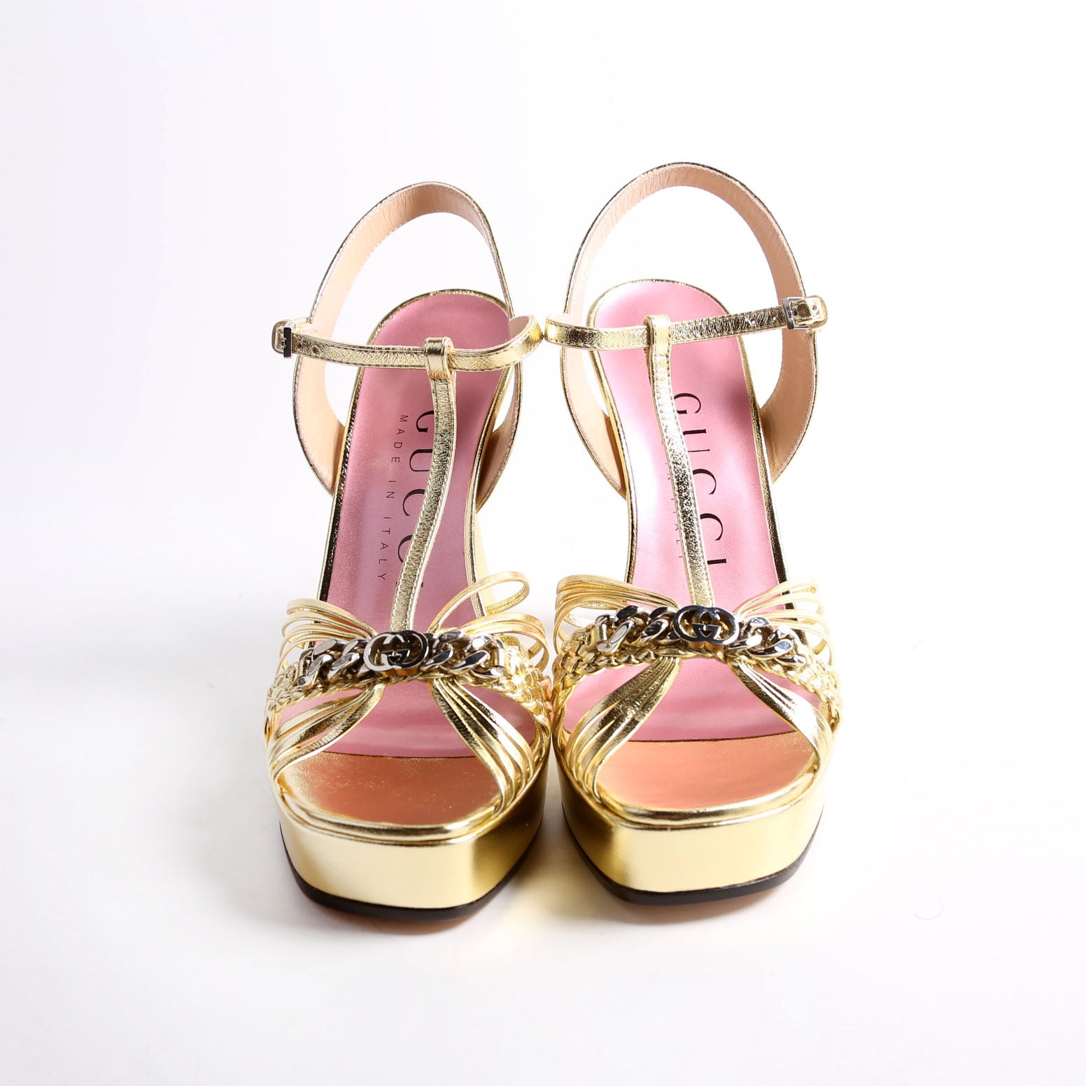 These pre-owned Gucci Logo Chain Strappy Platform Sandal Heels are guaranteed 100% authentic.