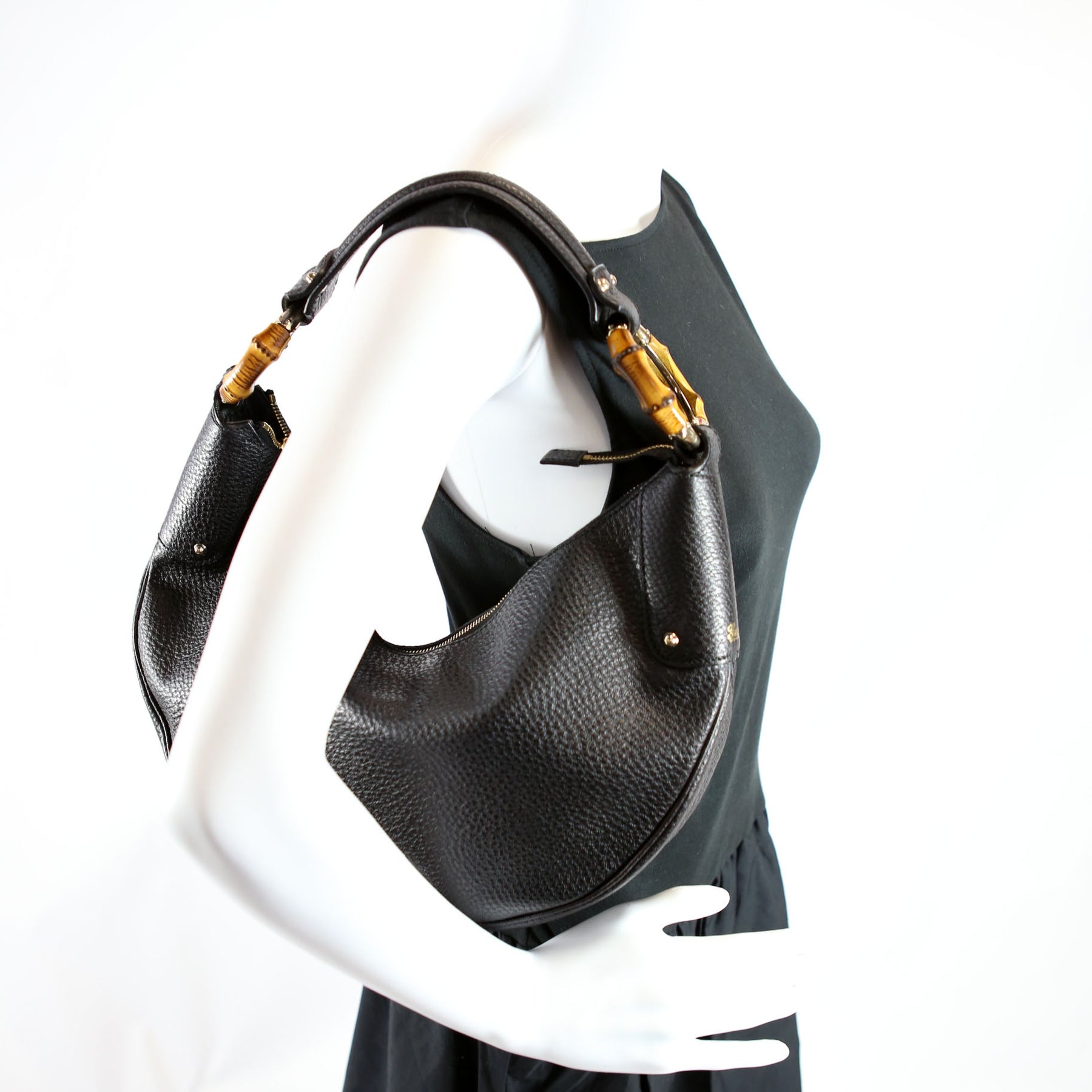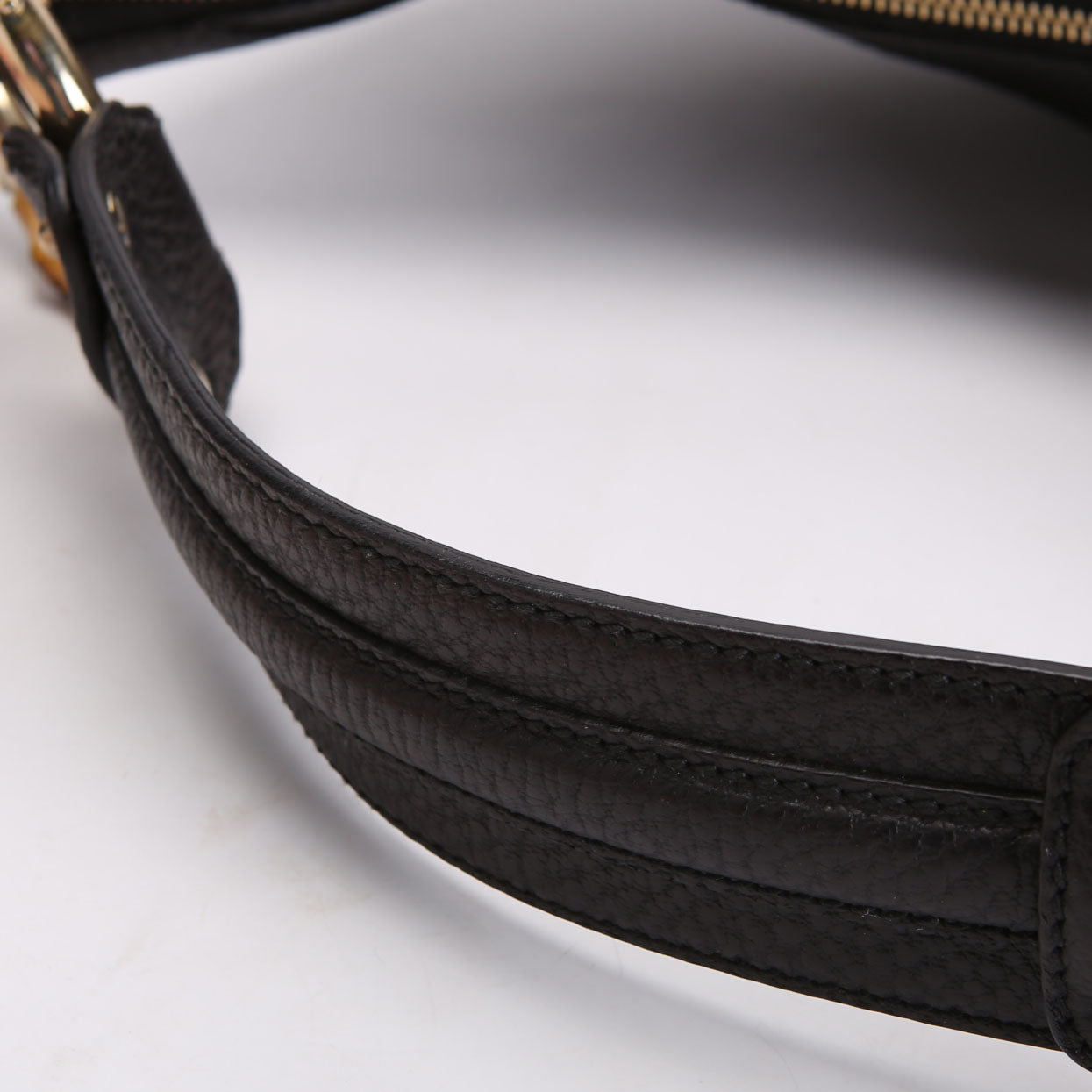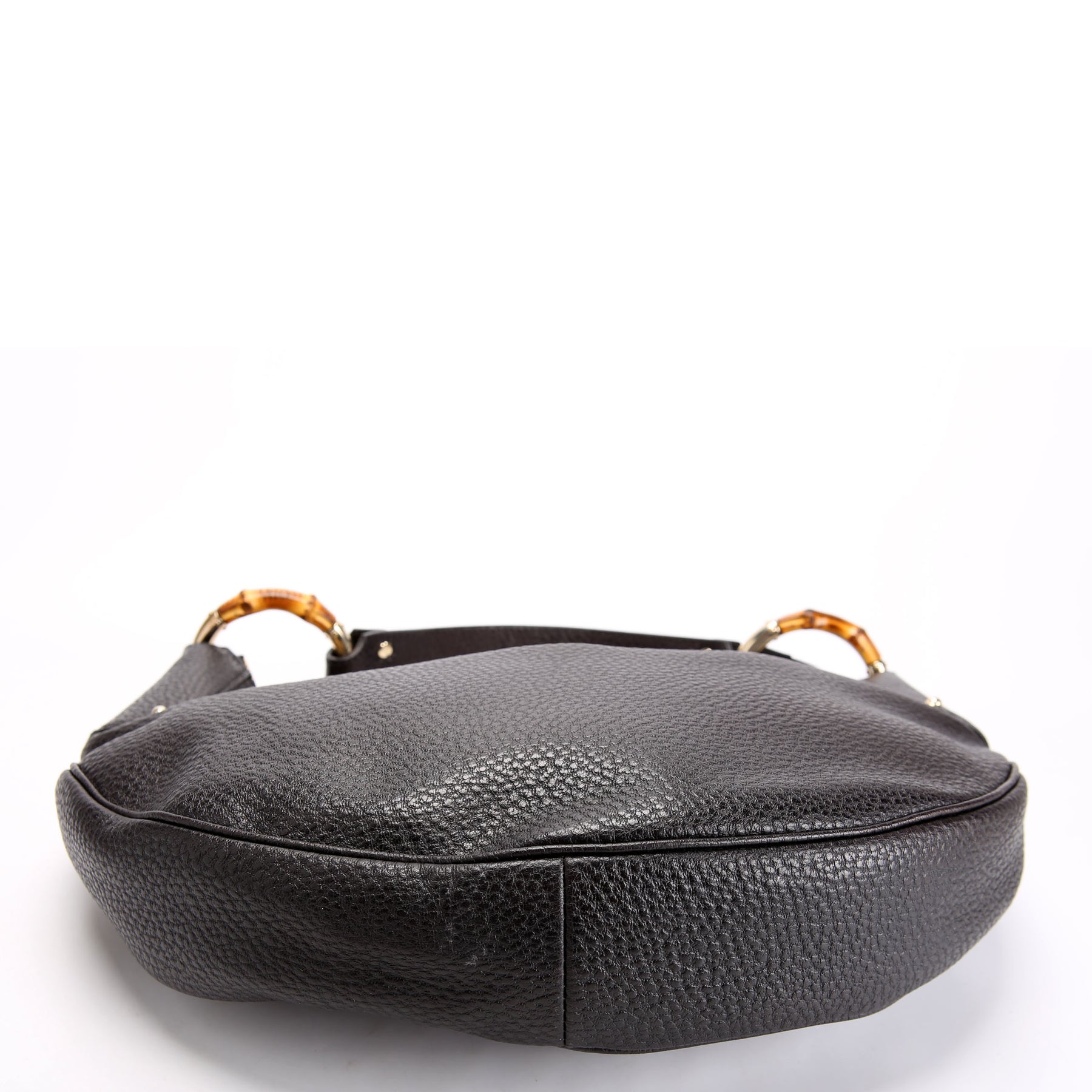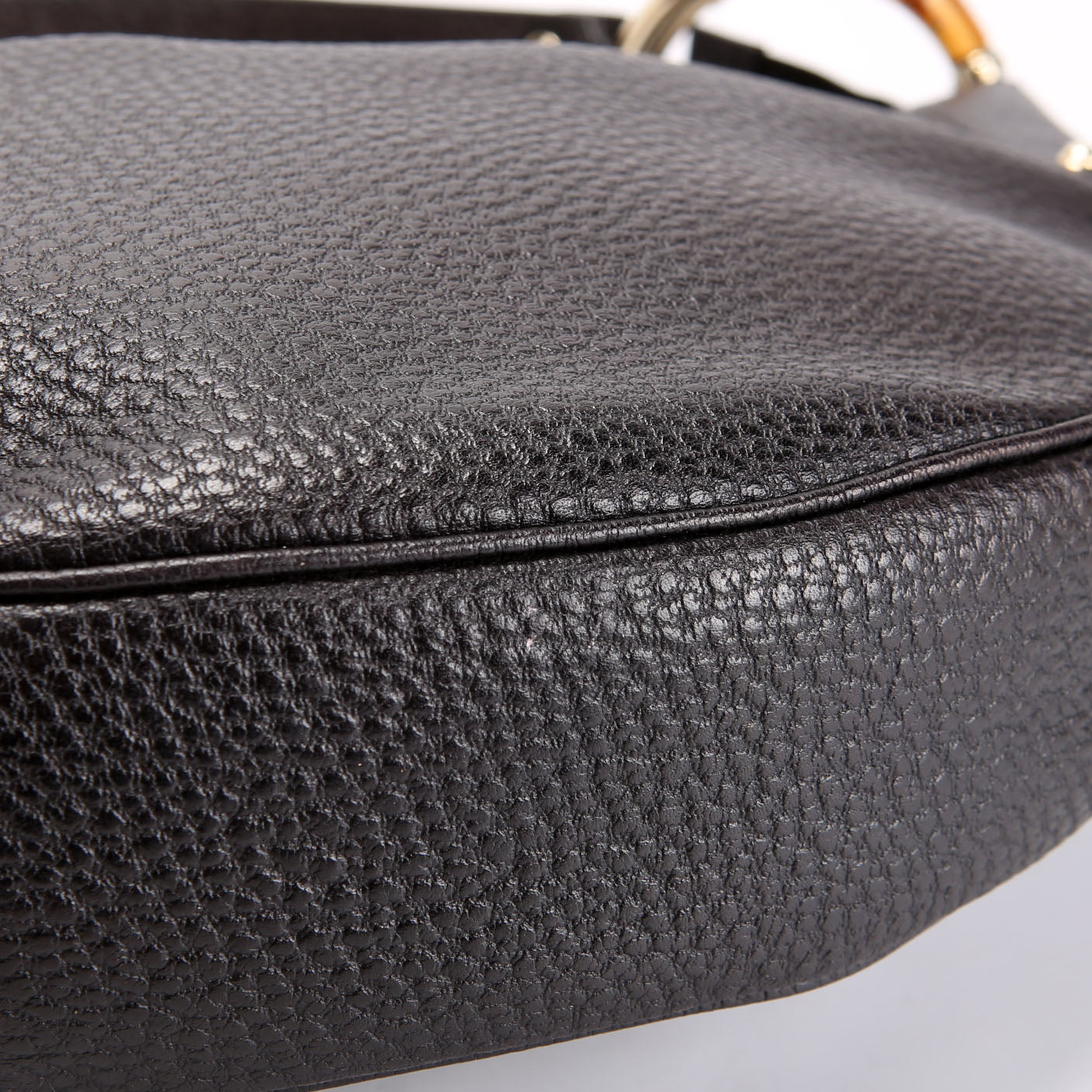 This pre-owned Gucci Bamboo Ring Leather Hobo is guaranteed 100% authentic. The exterior is in the classic Gucci Pebbled Leather.