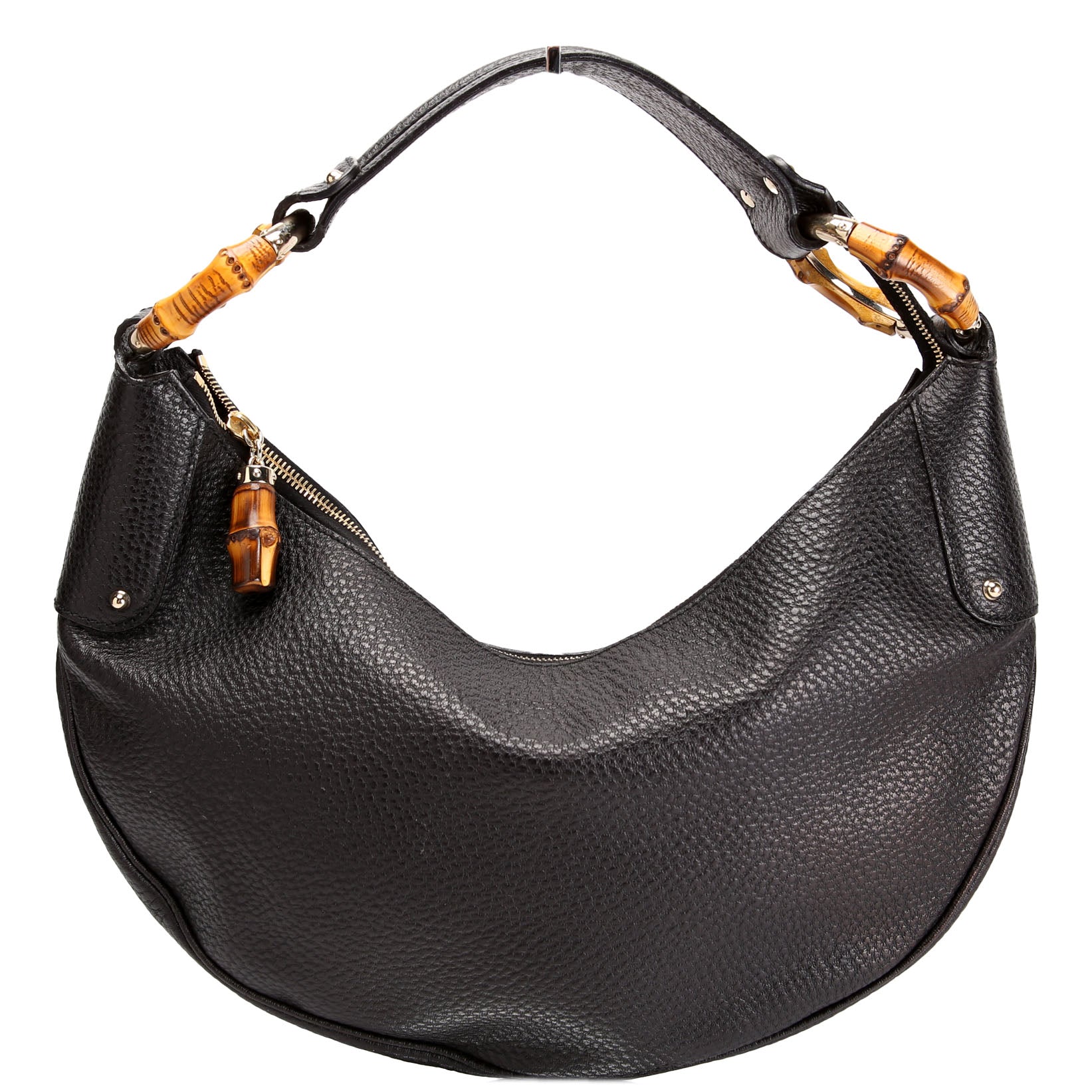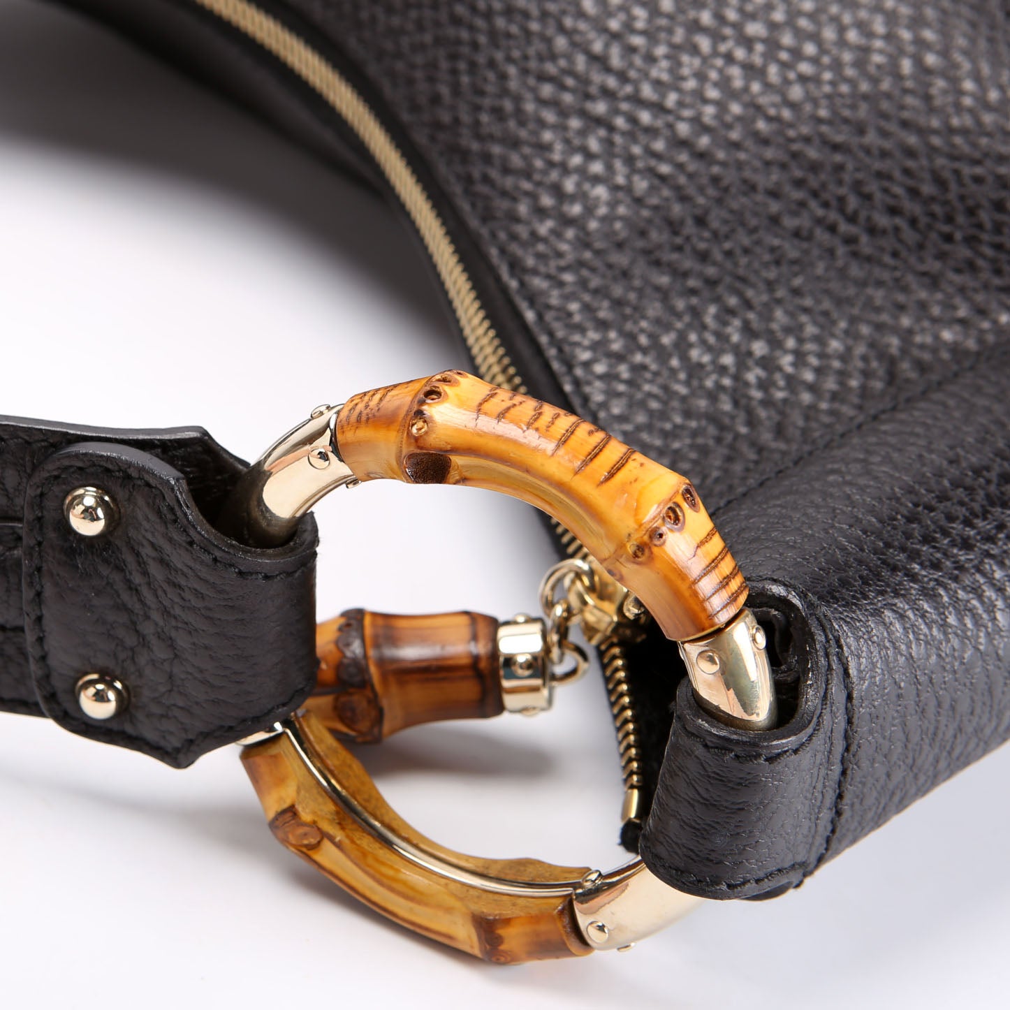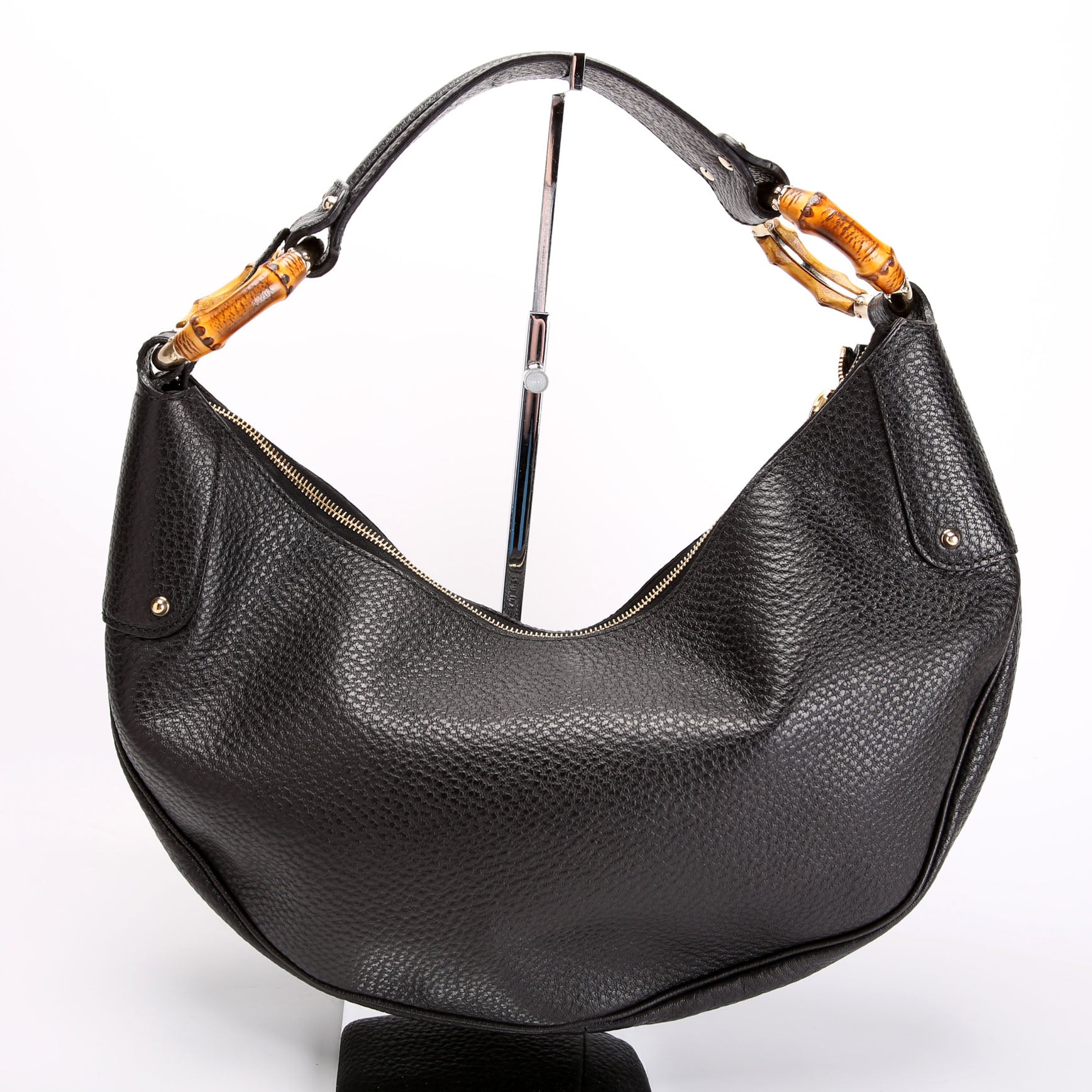 This pre-owned Gucci Bamboo Ring Leather Hobo is guaranteed 100% authentic. The exterior is in the classic Gucci Pebbled Leather.