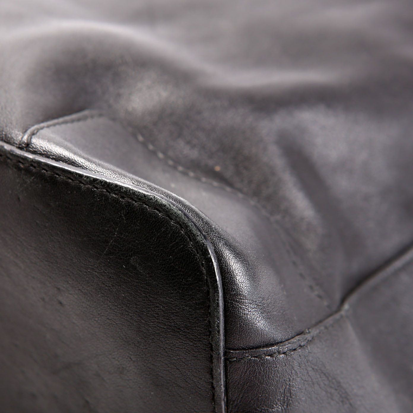 Exterior: The exterior leather shows scuffs throughout. The corners and bottom shows wear and rubbing.