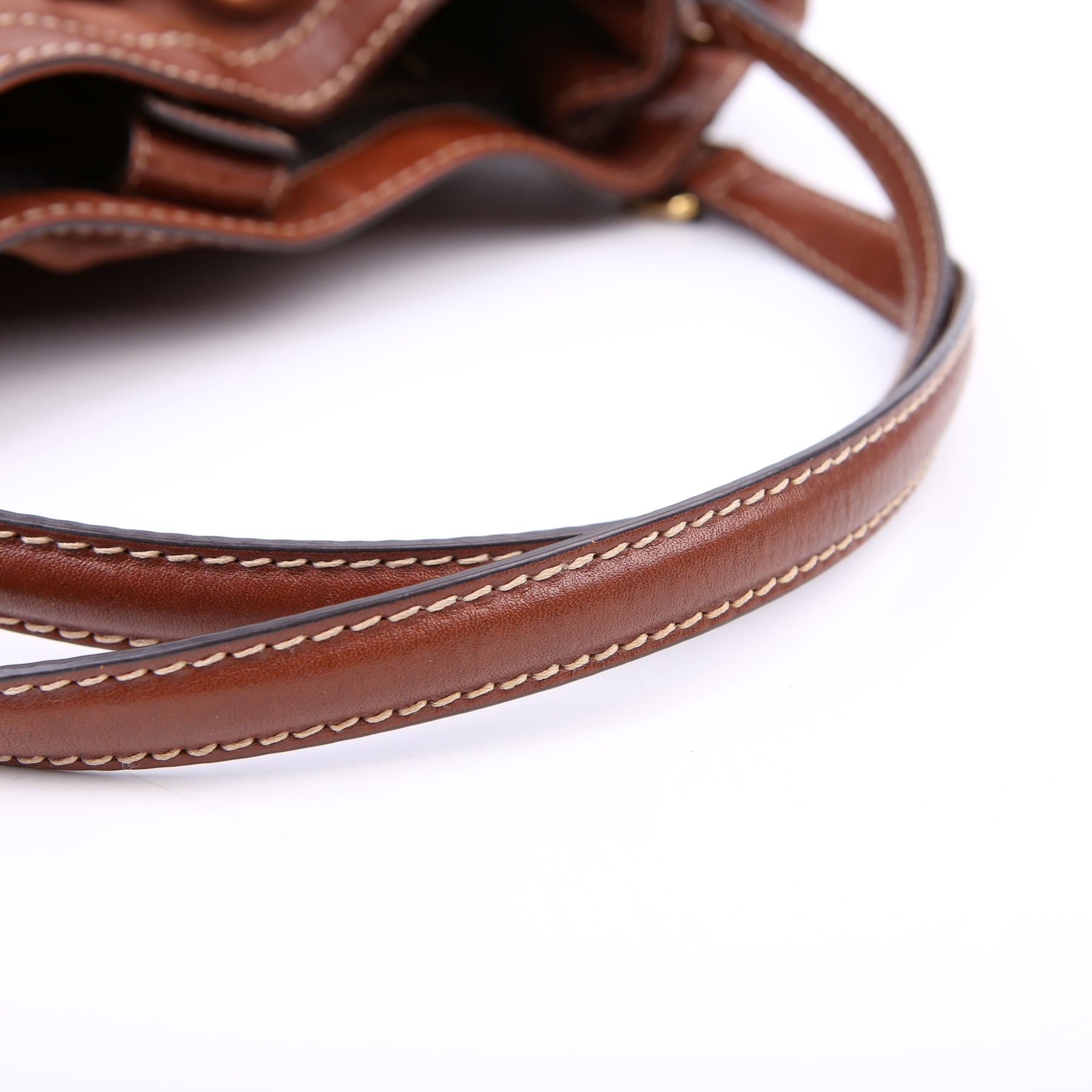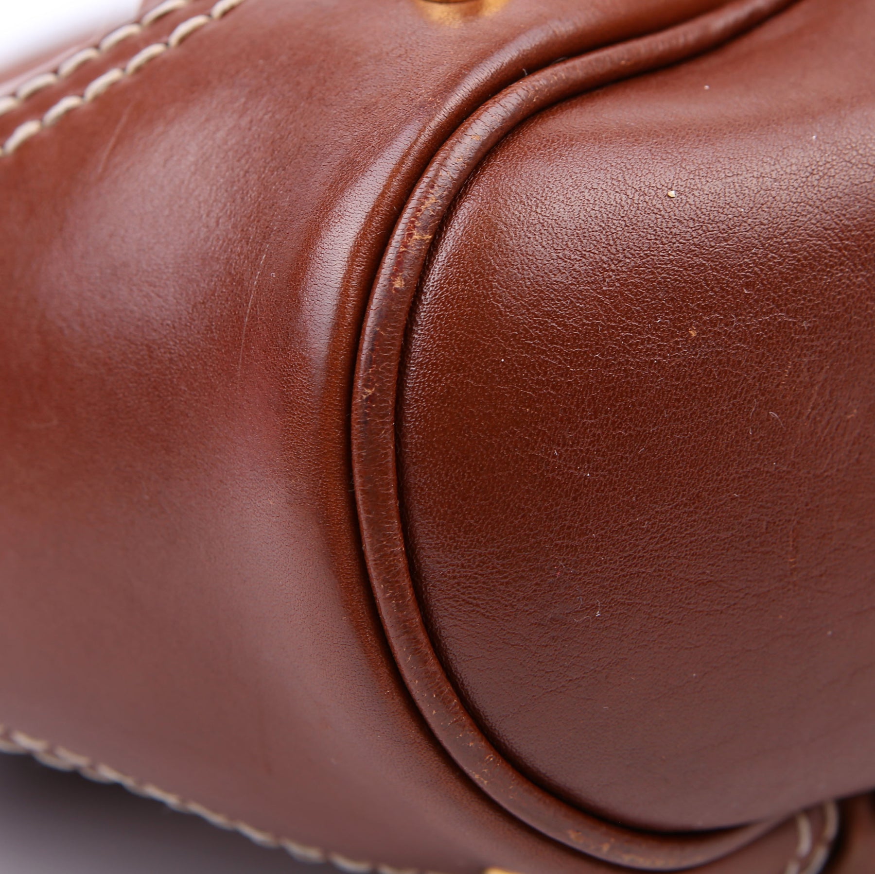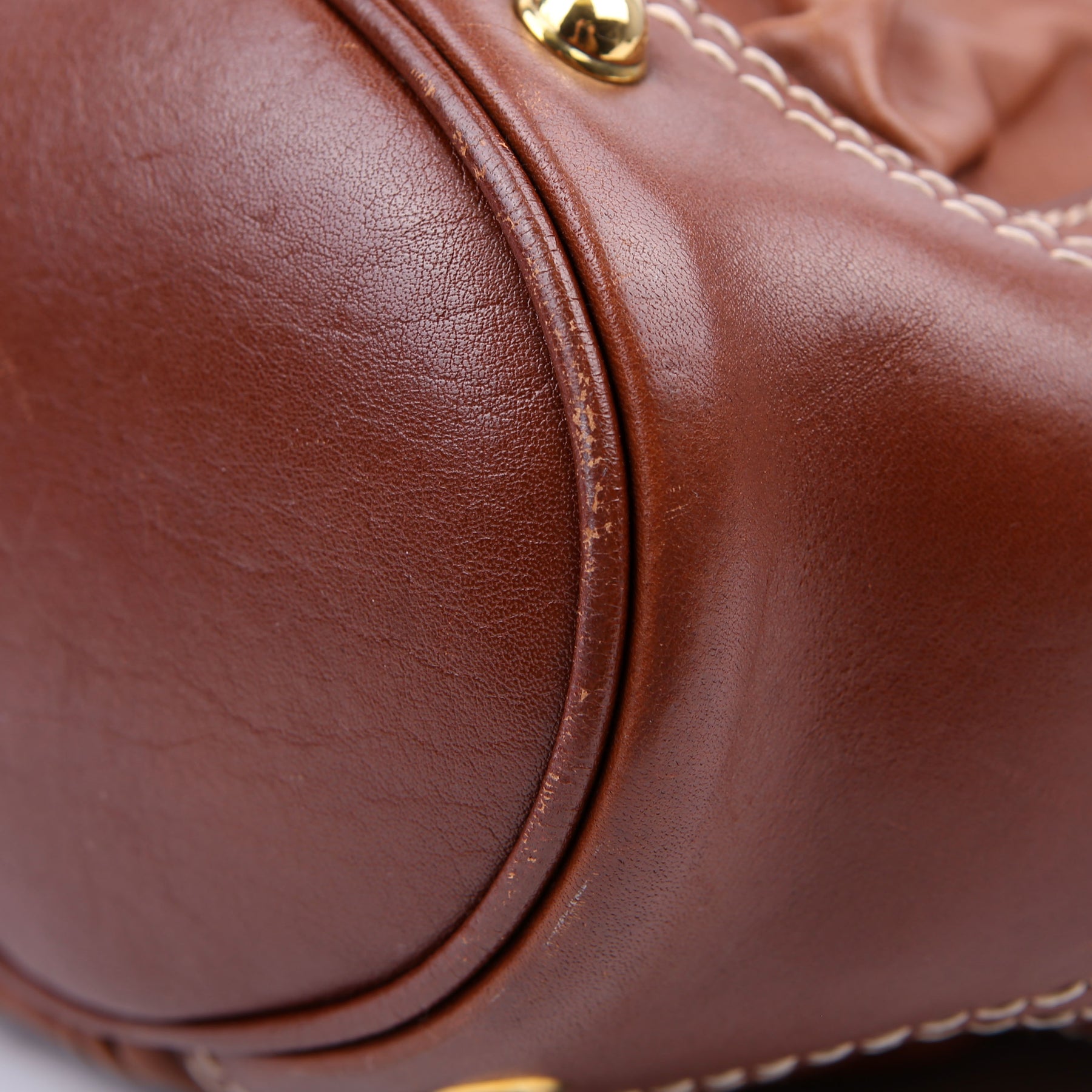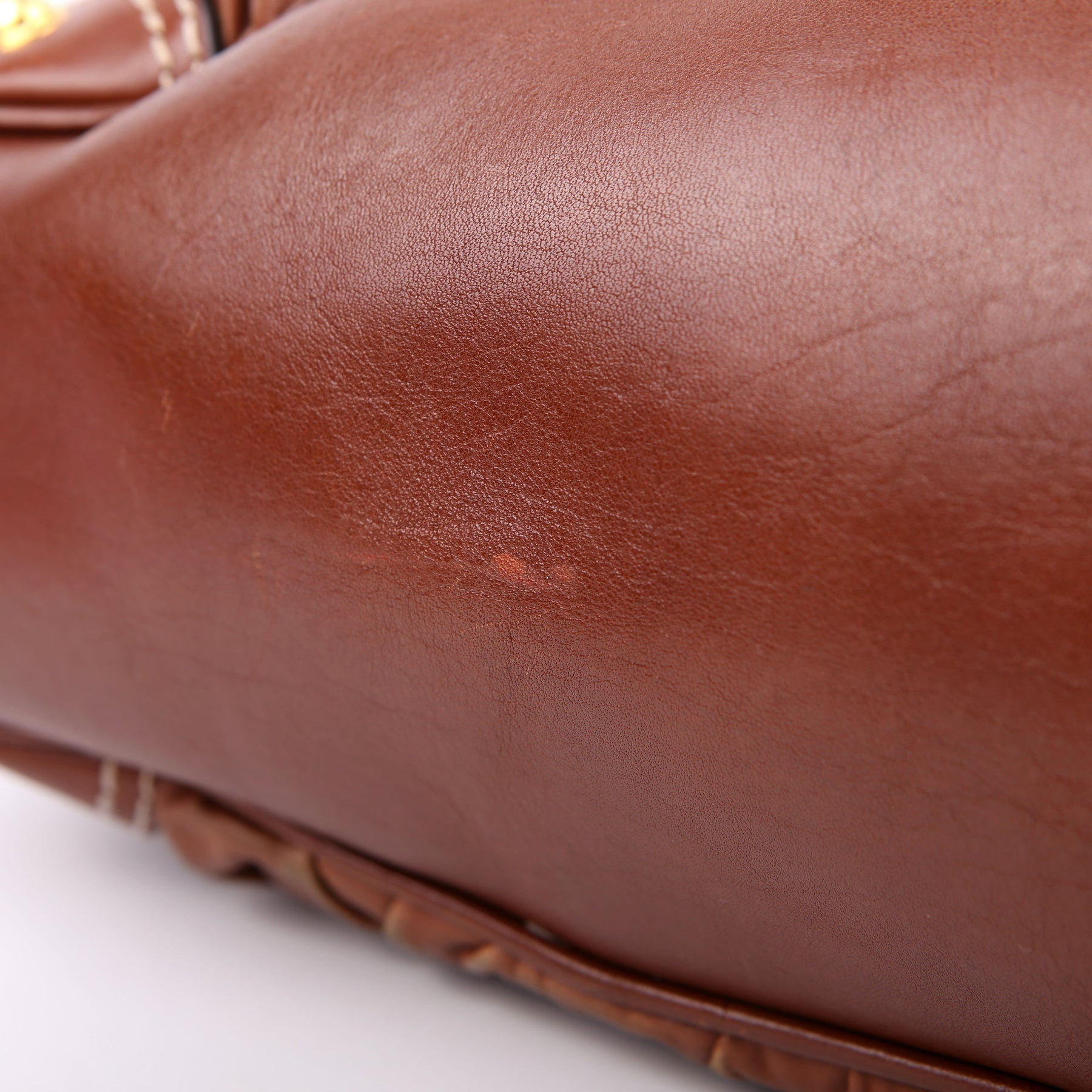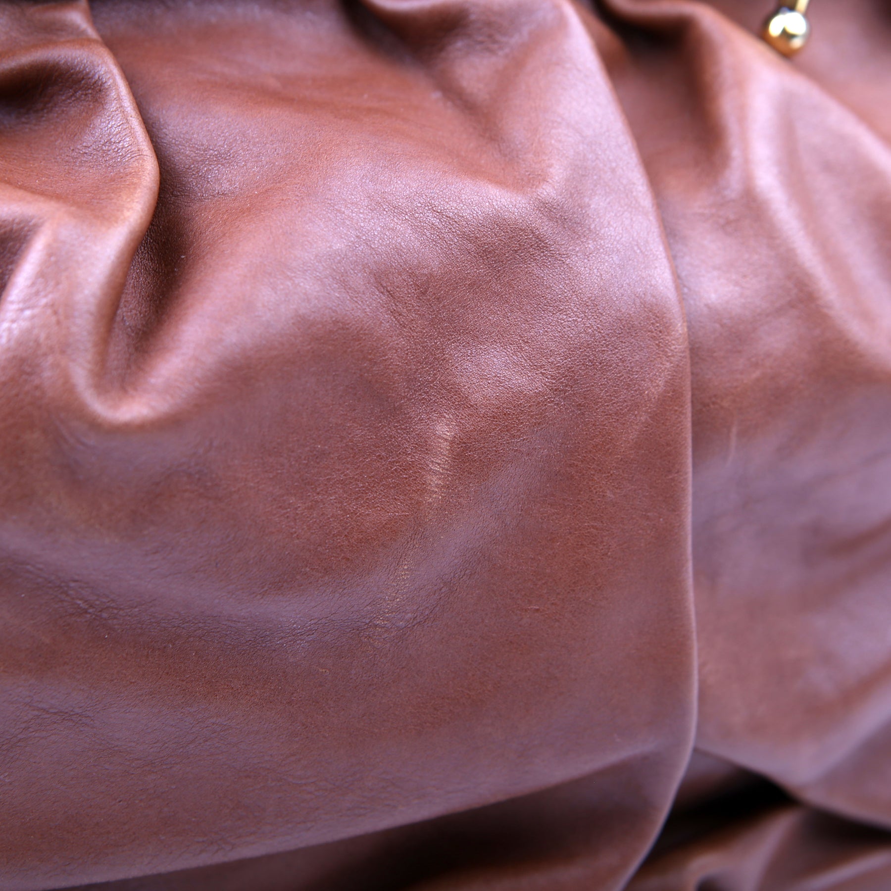 Exterior: The exterior leather has minor scuffs and scratches throughout. The corners show minor rubbing.