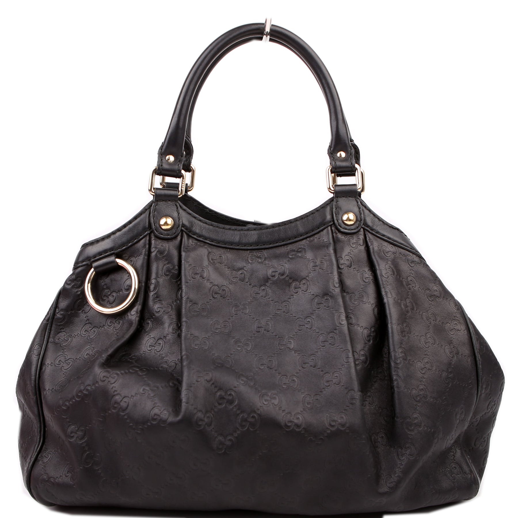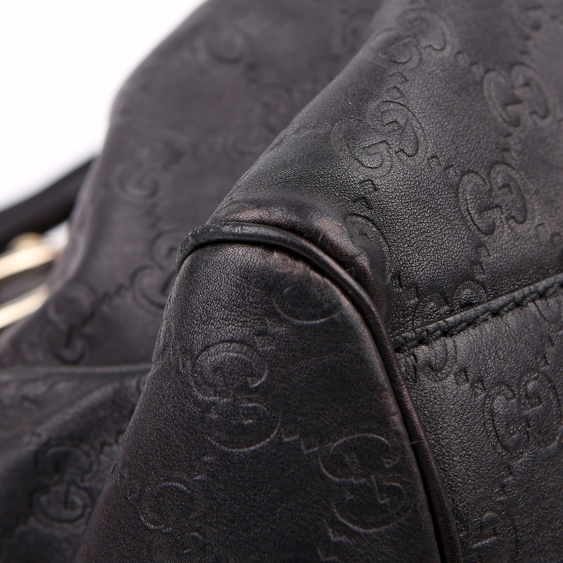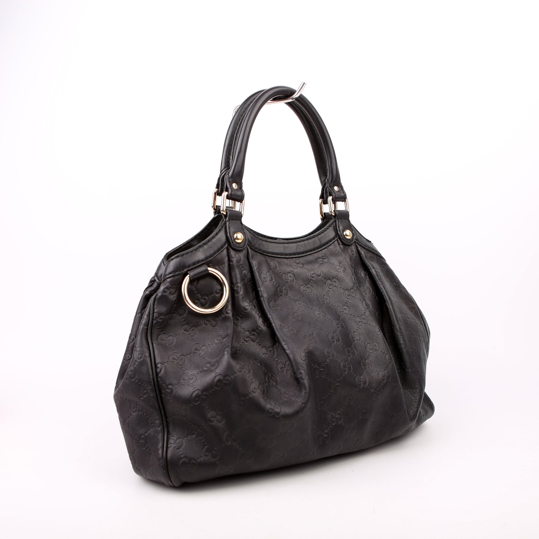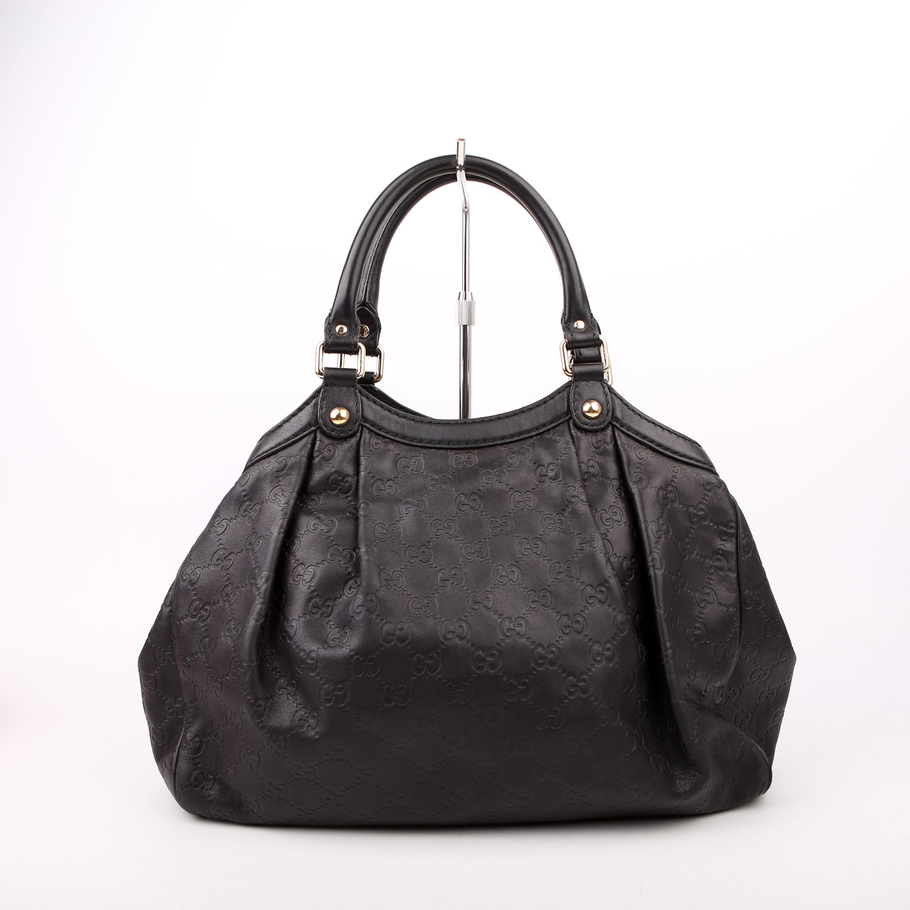 This pre-owned Gucci Sukey Medium is guaranteed 100% authentic. The exterior is in the classic Gucci GG canvas.
