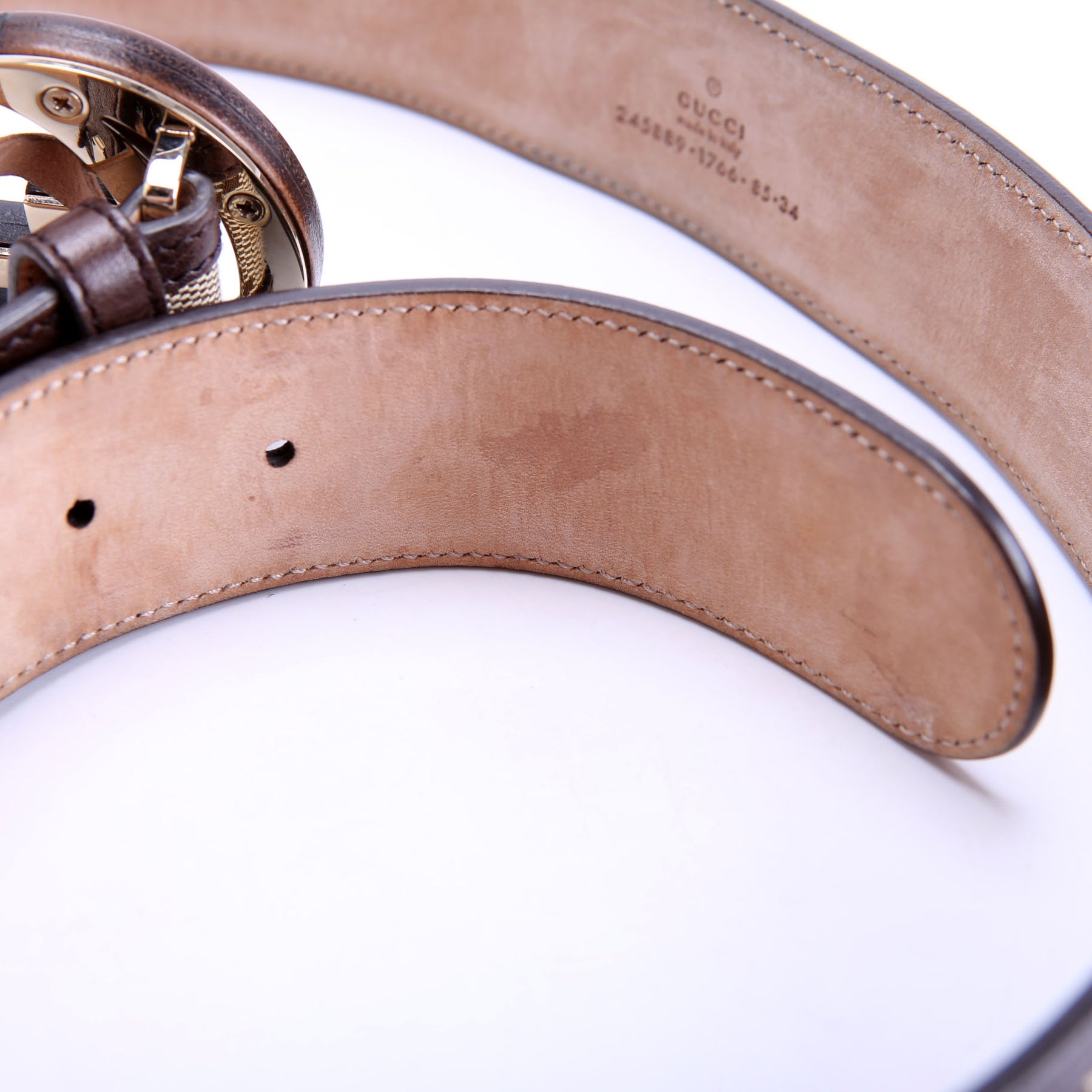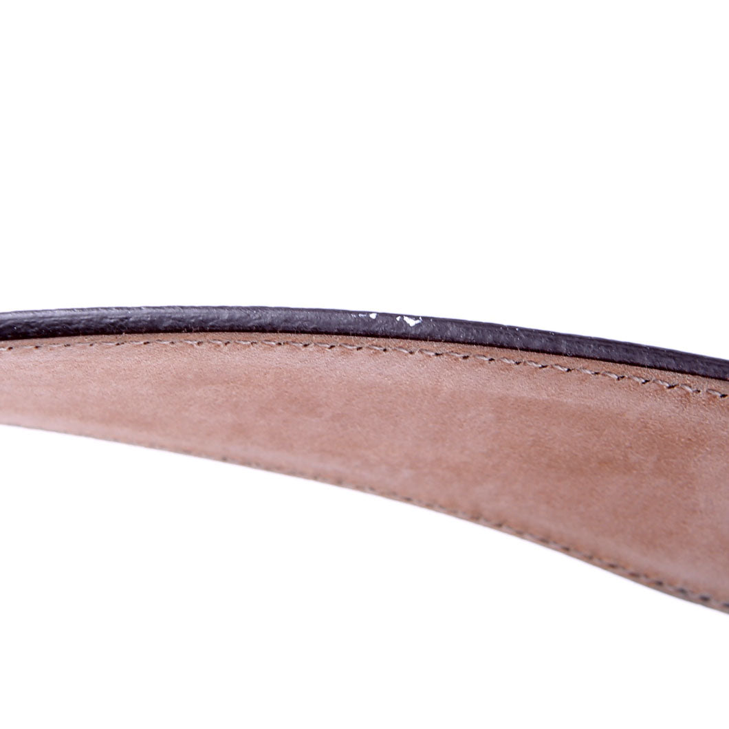 Hardware: The buckle operates properly. The hardware shows scratches and scuffs to the leather.