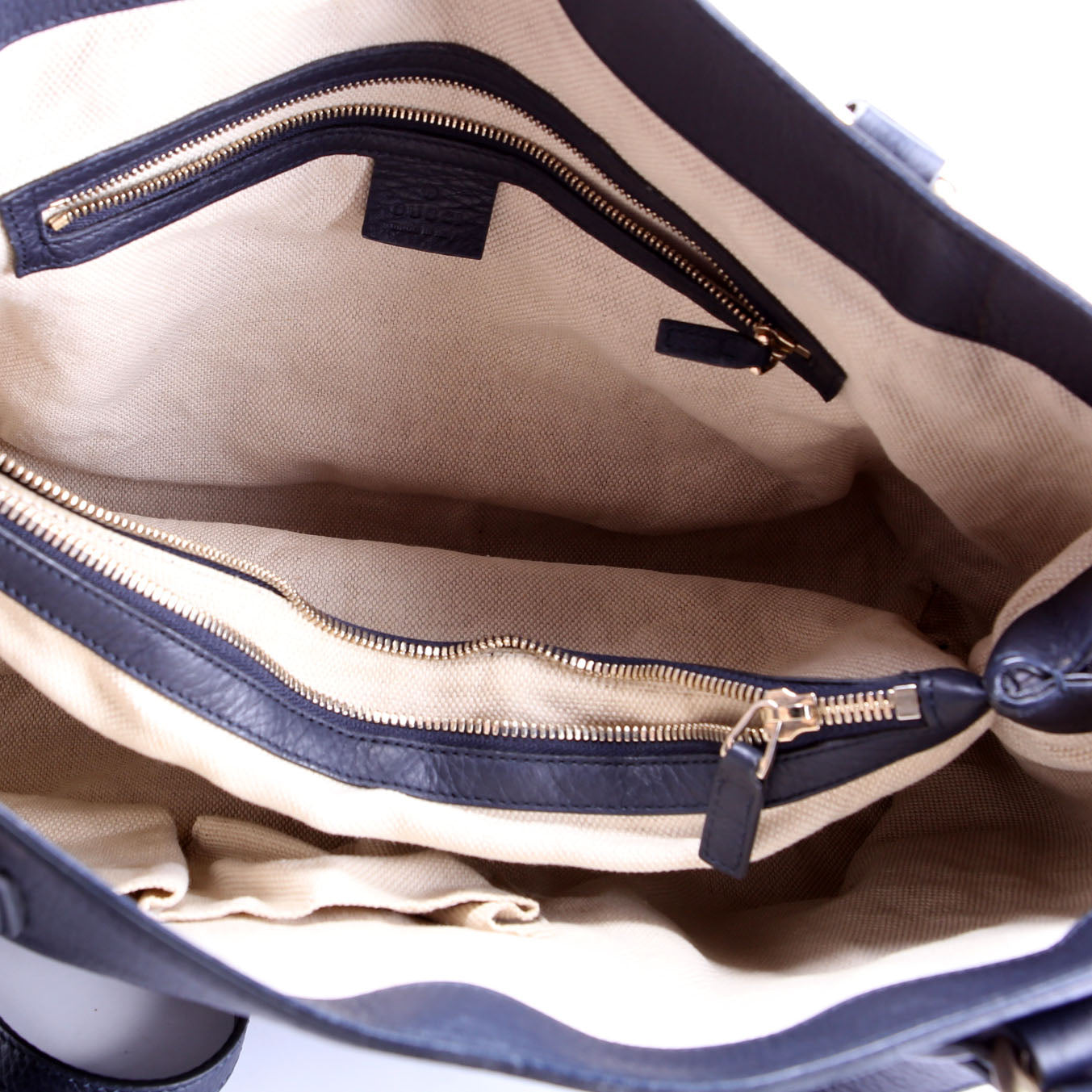 Interior: The interior fabric is free from wear. The interior features two open sections, and two zip closure pockets.