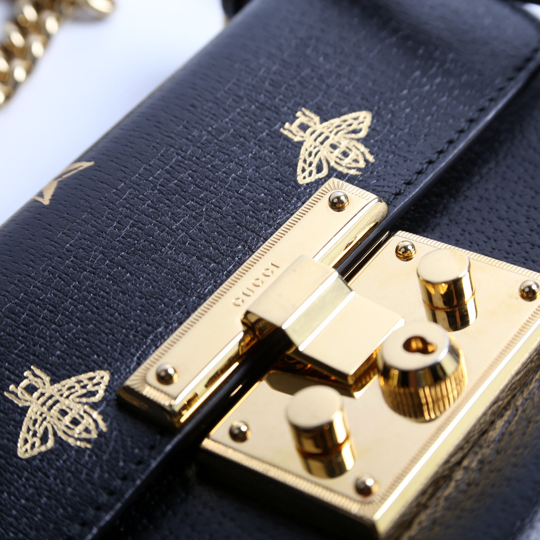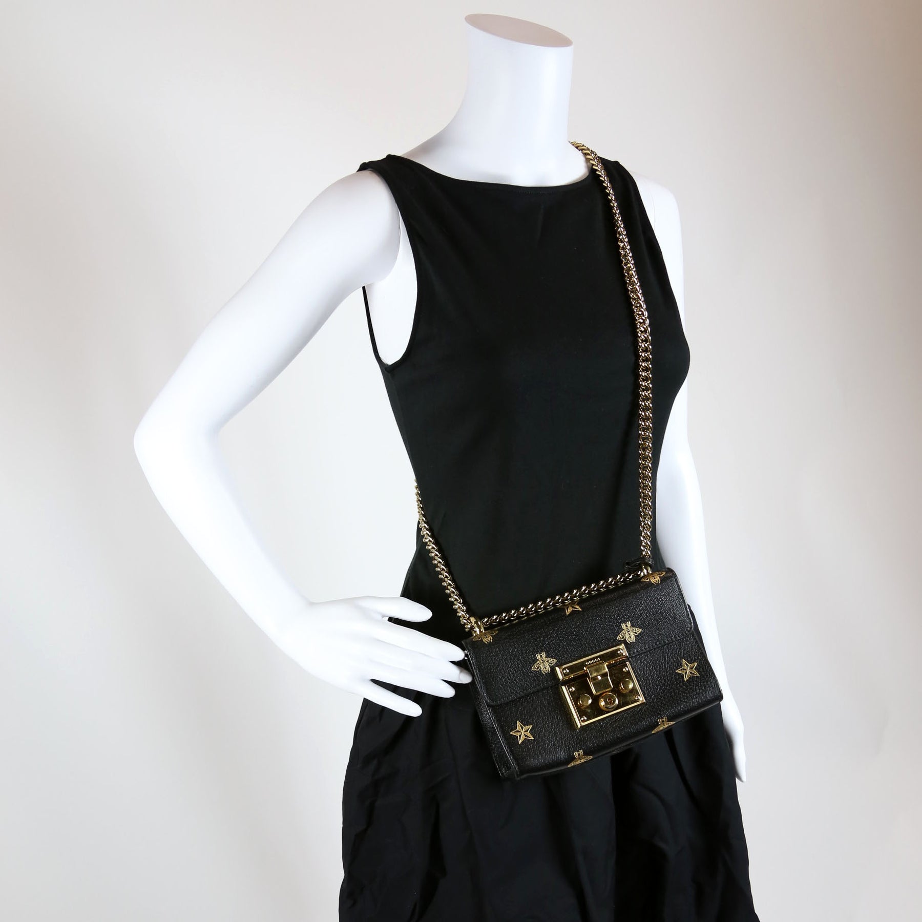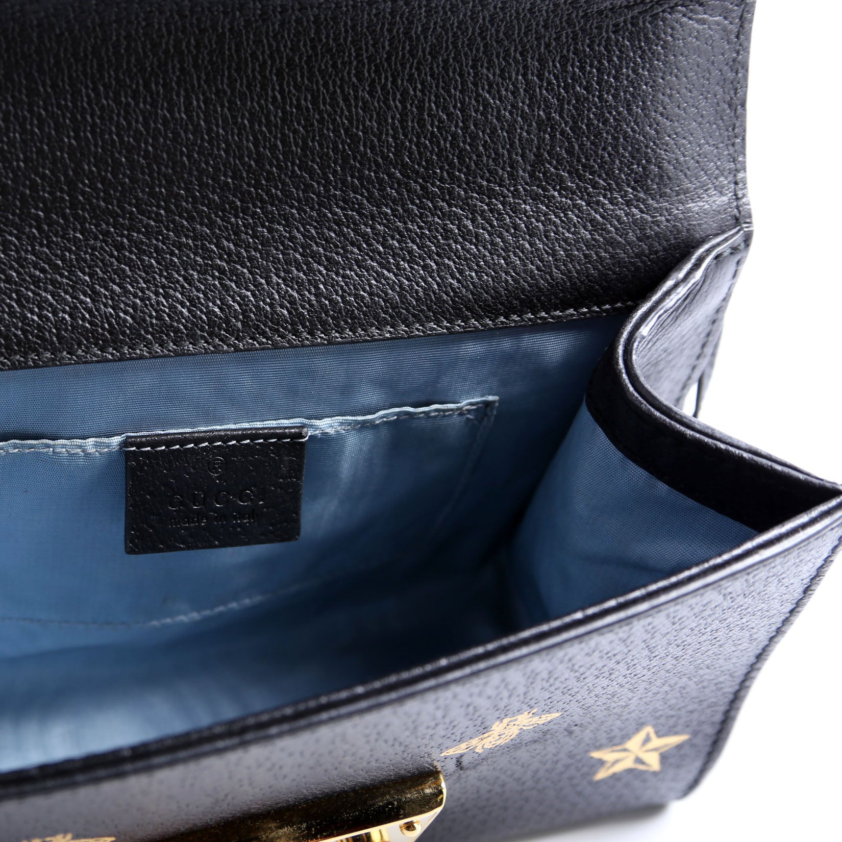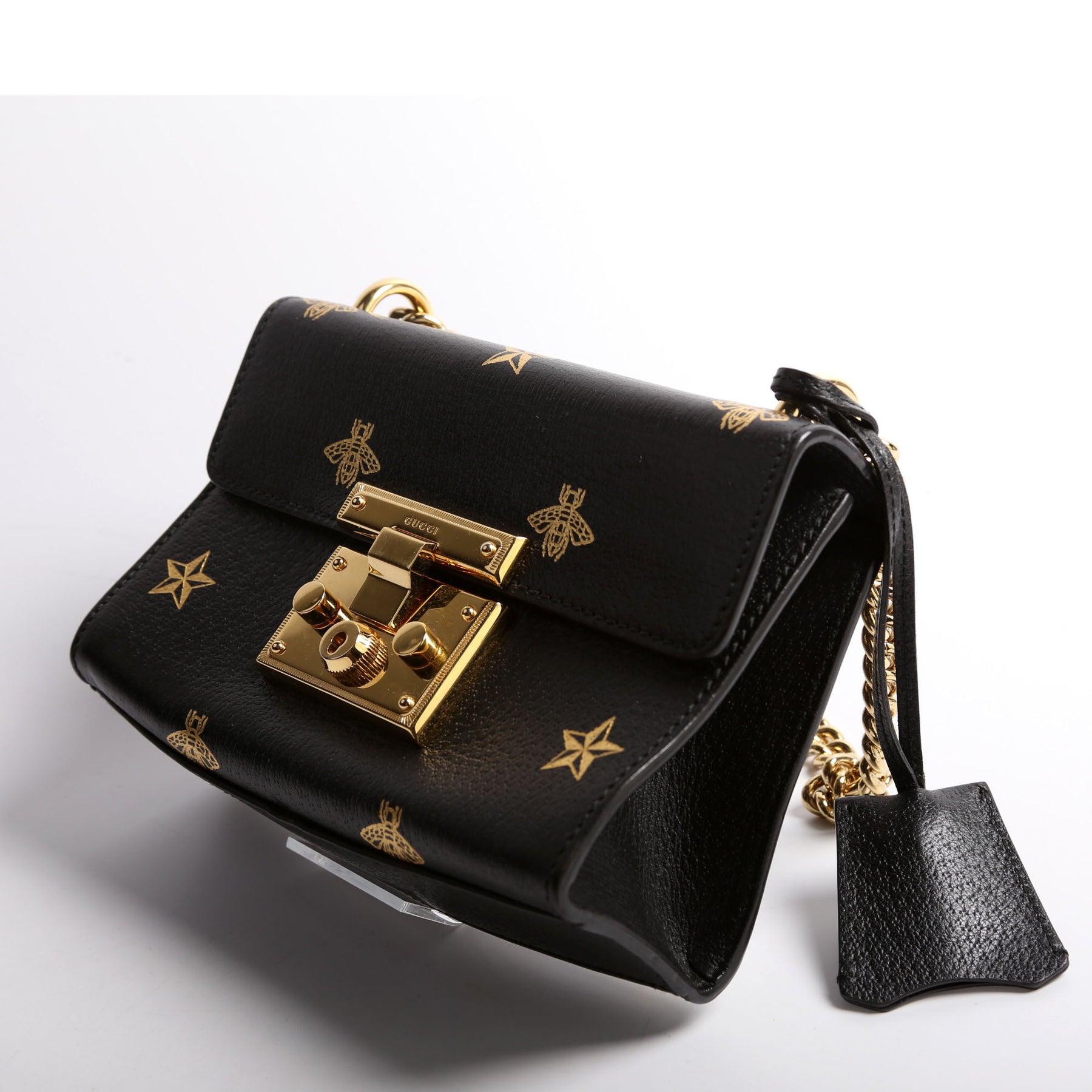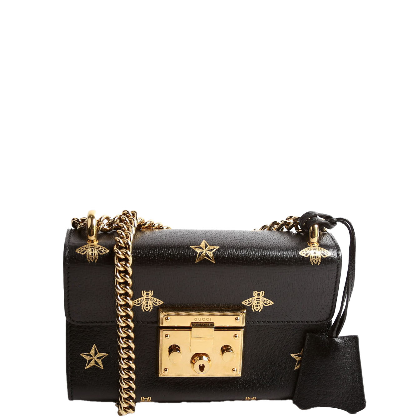 This pre-owned Gucci Padlock GG Bee Star Small is guaranteed 100% authentic. The exterior is in the classic Gucci Supreme canvas and leather.