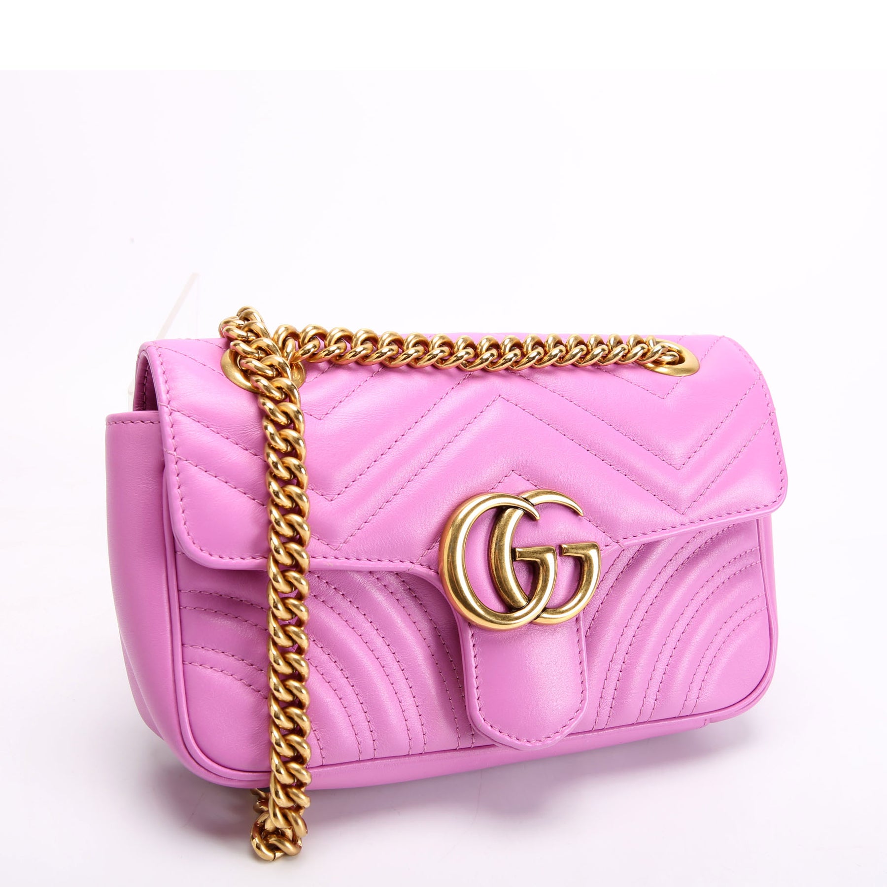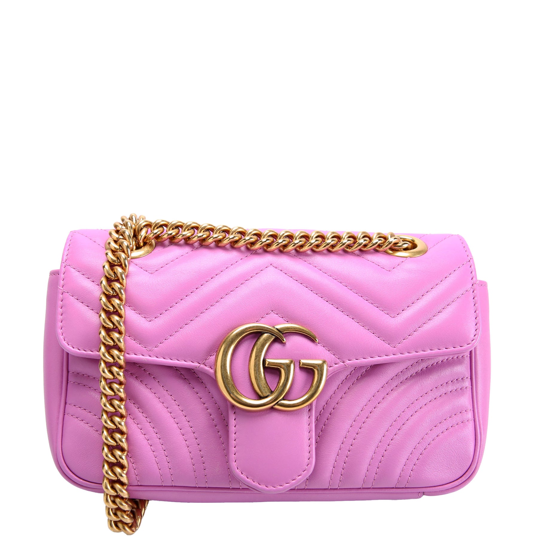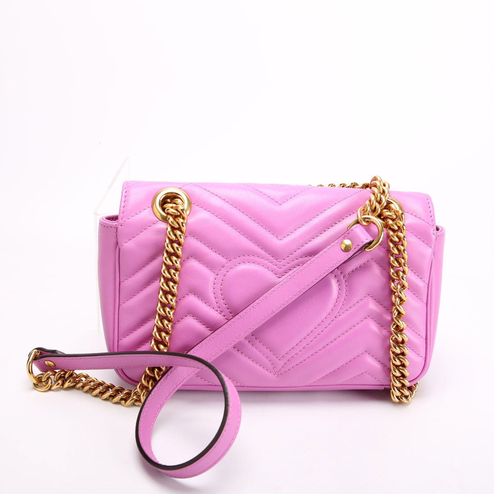 This pre-owned Gucci Shoulder Mini Flap is guaranteed 100% authentic. The exterior is in the classic Gucci Marmont leather.
