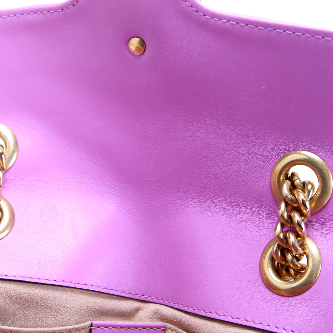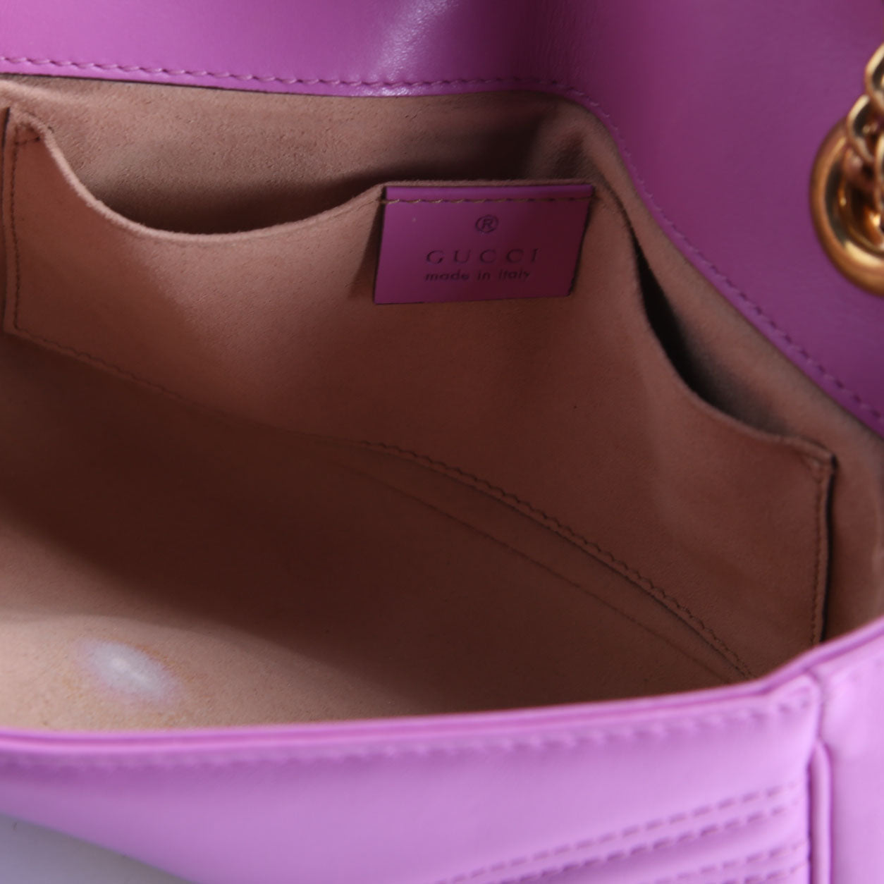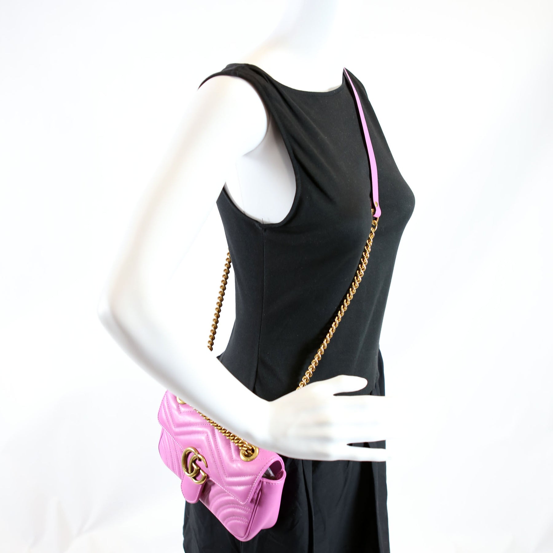 This pre-owned Gucci Shoulder Mini Flap is guaranteed 100% authentic. The exterior is in the classic Gucci Marmont leather.