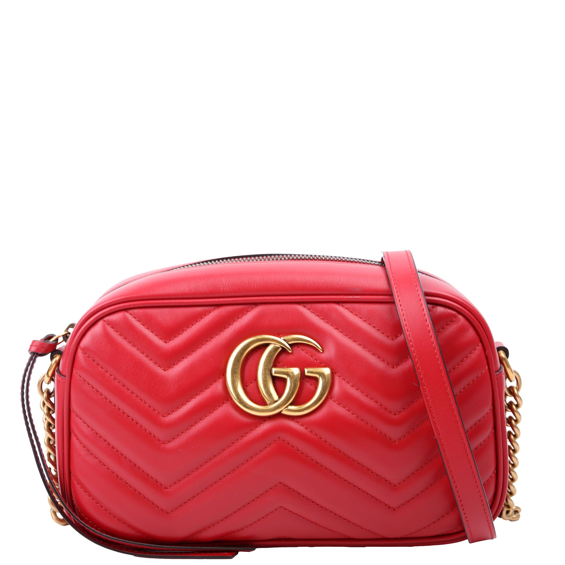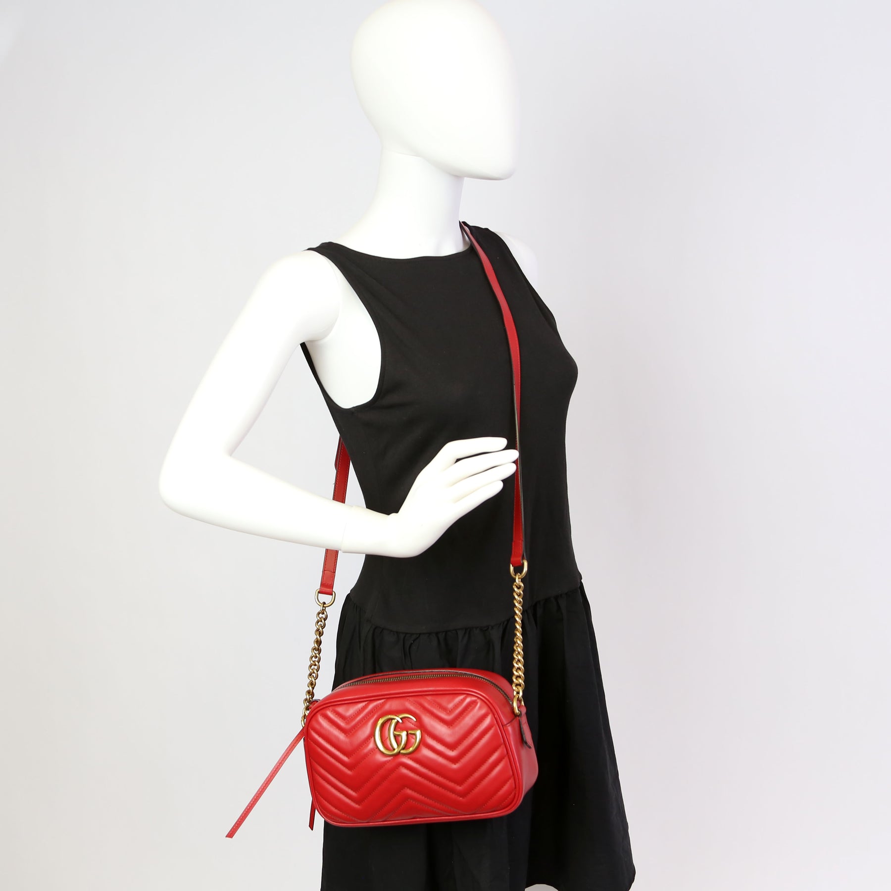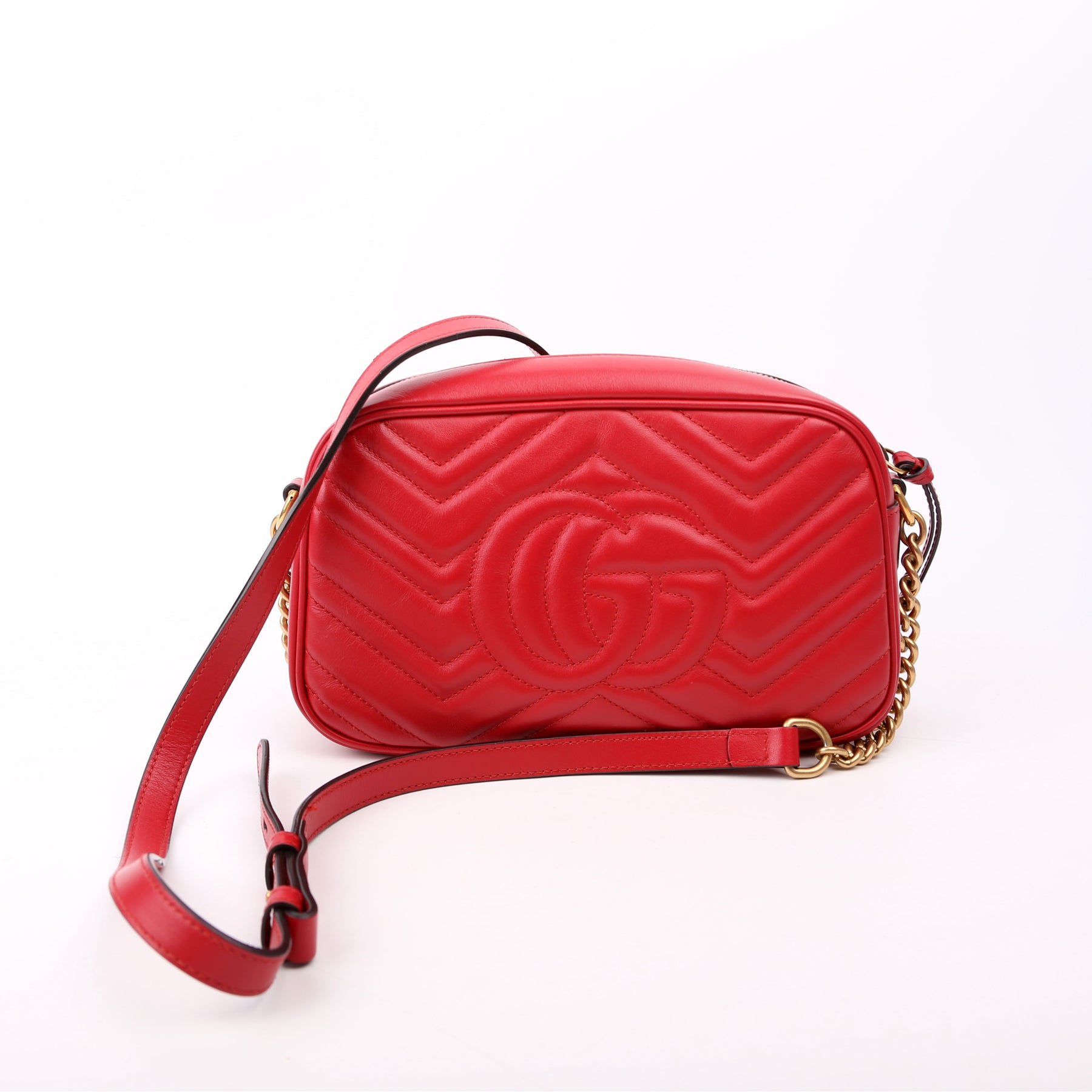 This pre-owned Gucci Marmont Small Leather Camera is guaranteed 100% authentic. The exterior is in the classic Gucci Marmont leather.