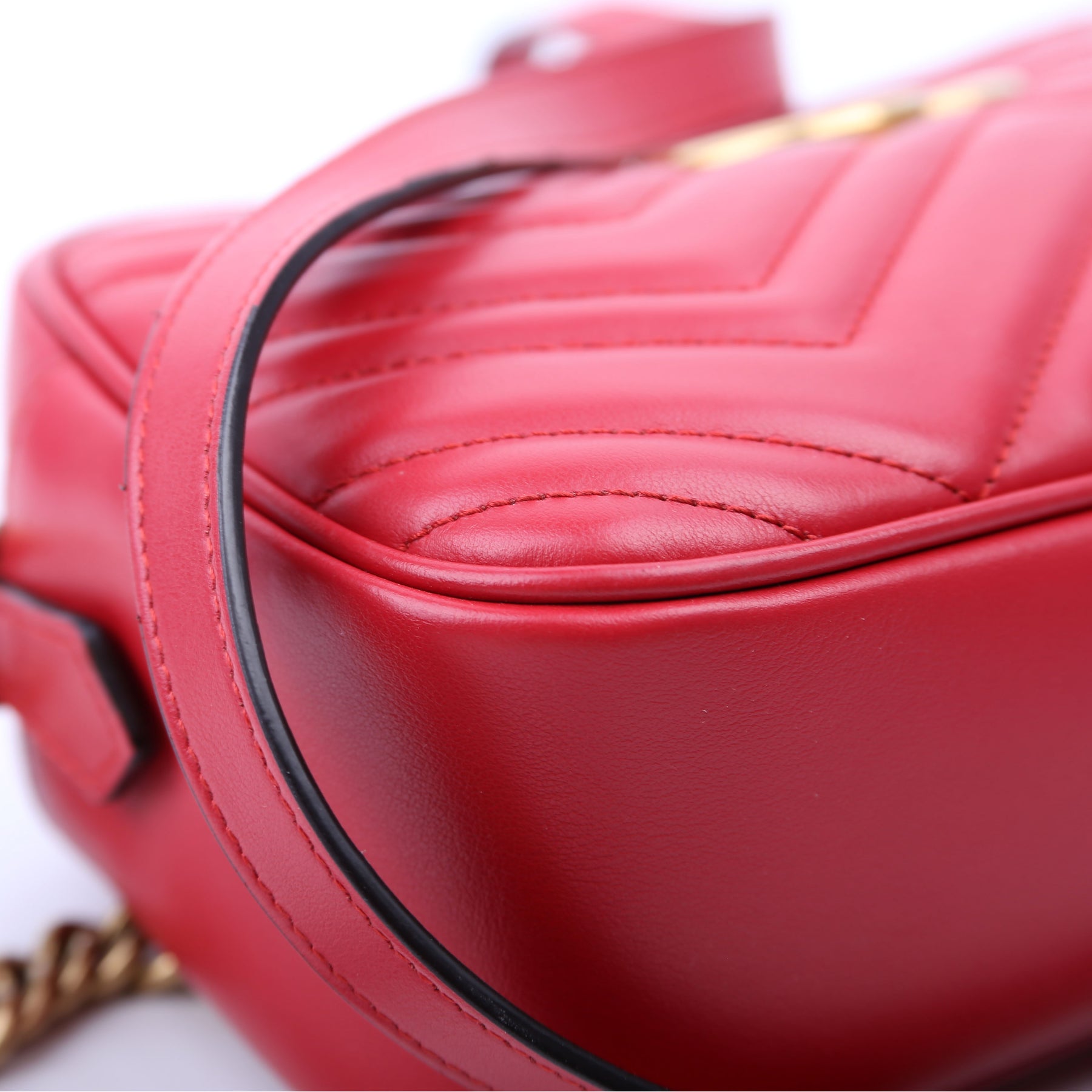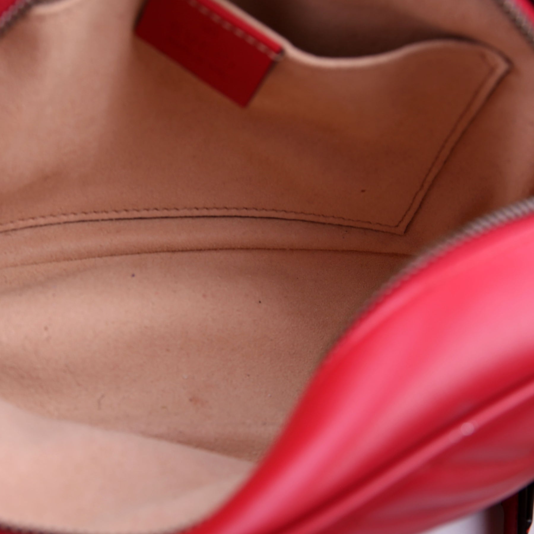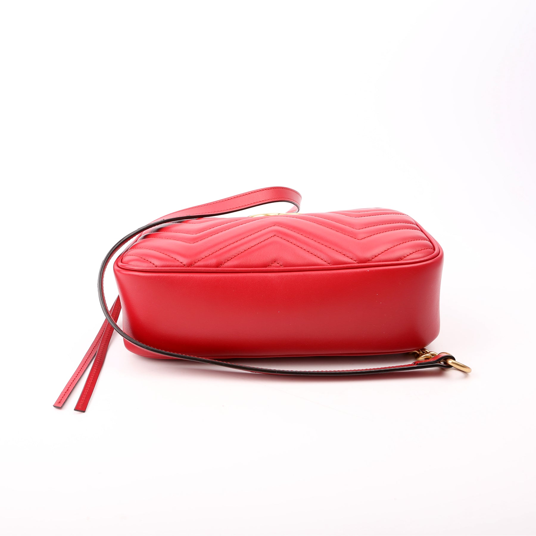 This pre-owned Gucci Marmont Small Leather Camera is guaranteed 100% authentic. The exterior is in the classic Gucci Marmont leather.