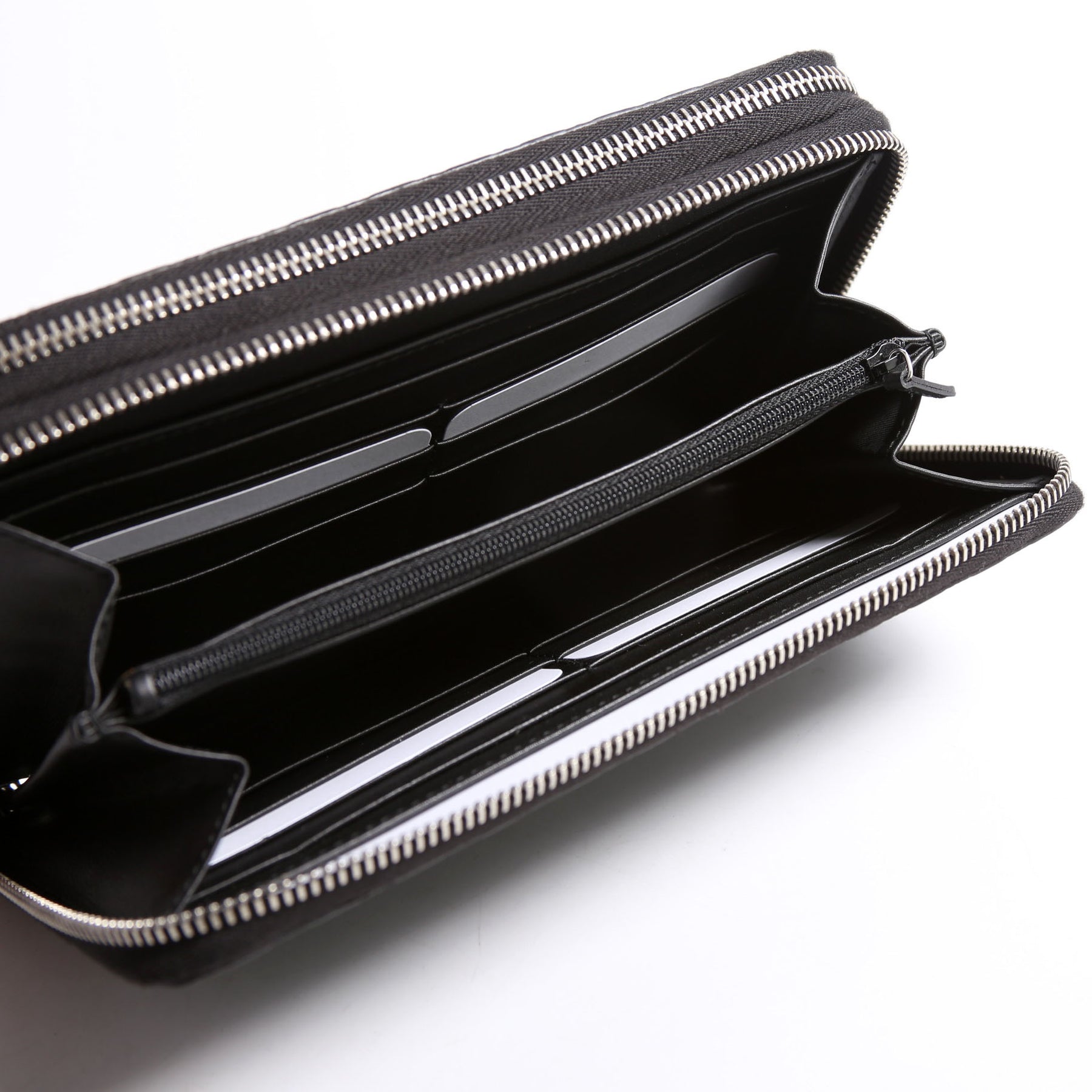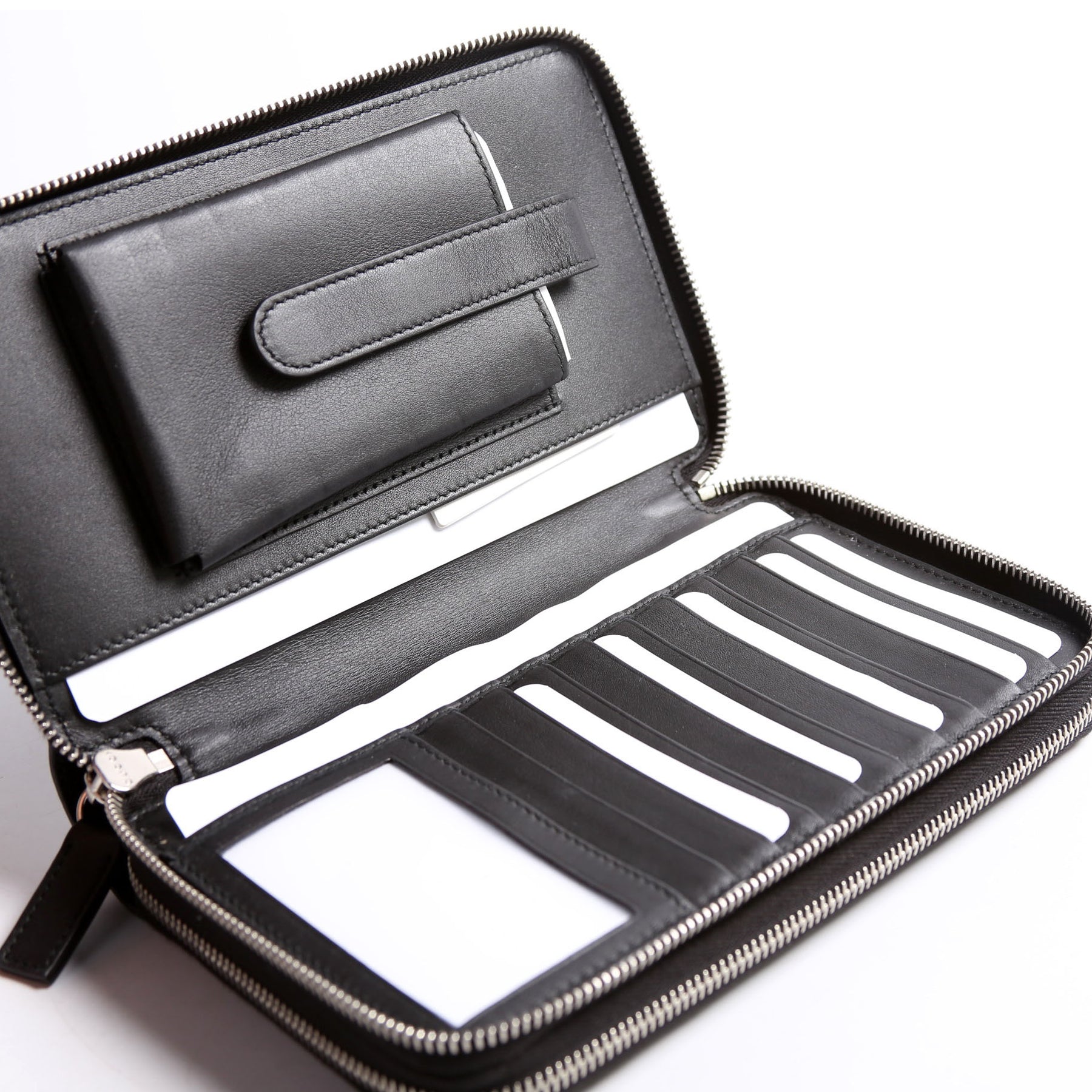Interior: The interior is free from wear. It features twenty-two card slots, four open pocket, one zip closure pocket, and one snap closure pocket.