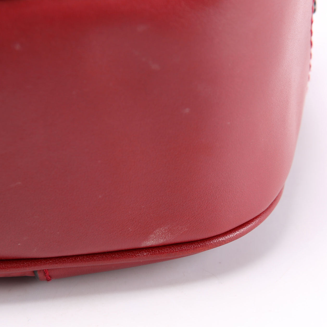 Exterior: The exterior leather shows marks throughout. The base shows scuffs and marks. The corners show wear and rubbing.