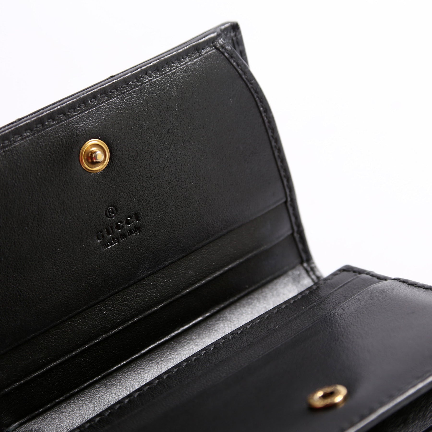 Interior: The interior is free from wear. It features six card slots, one bill slot, and one zip closure pocket.
