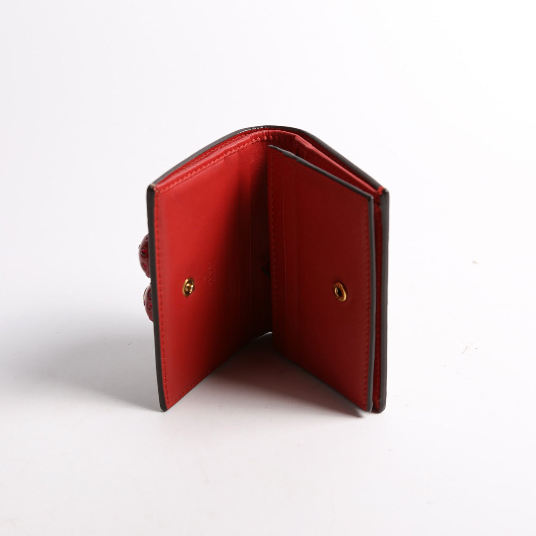 Interior: The interior is free from wear. It features six card slots, one bill slot, and one zip closure pocket.