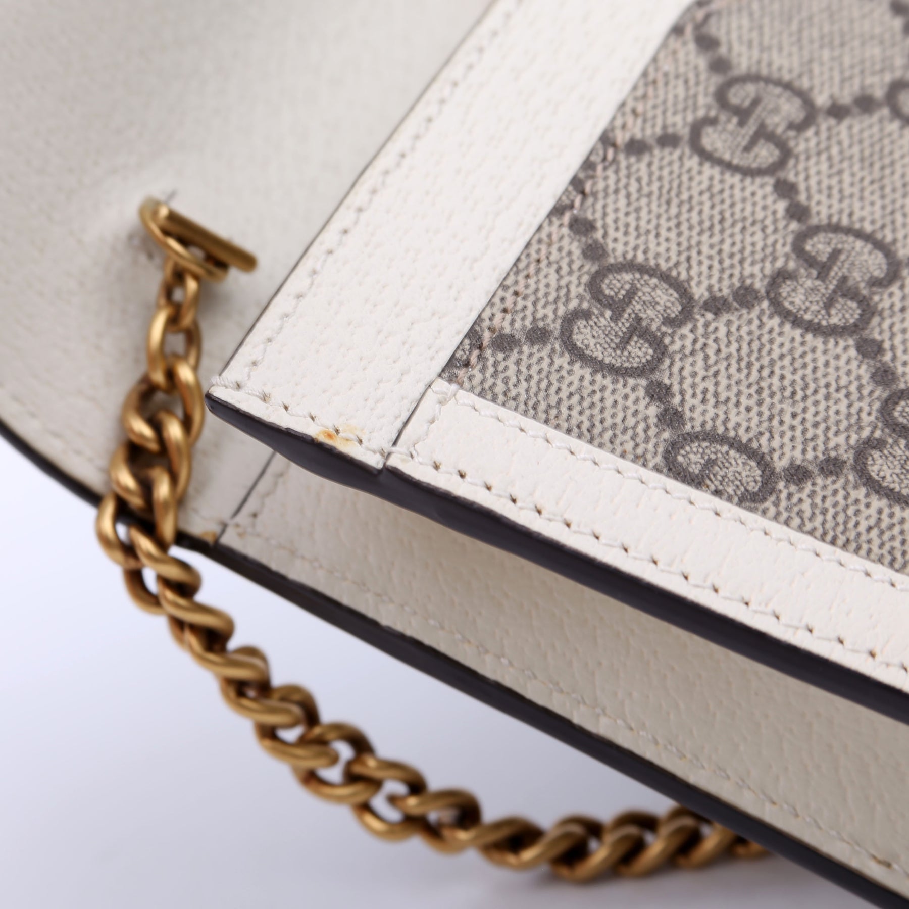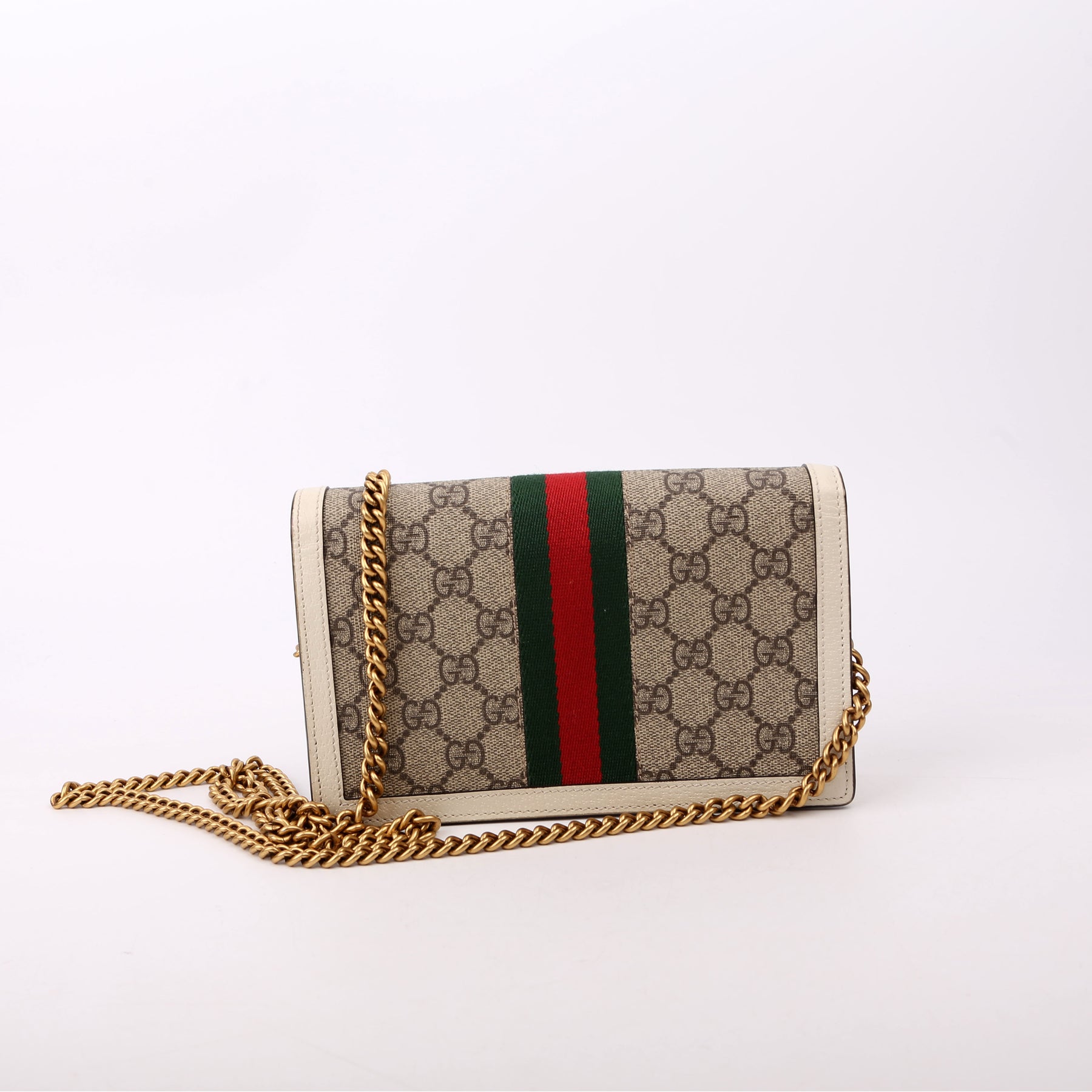 This pre-owned Gucci Queen Margaret Wallet On Chain is guaranteed 100% authentic. The exterior is in the classic Gucci GG Supreme coated canvas.