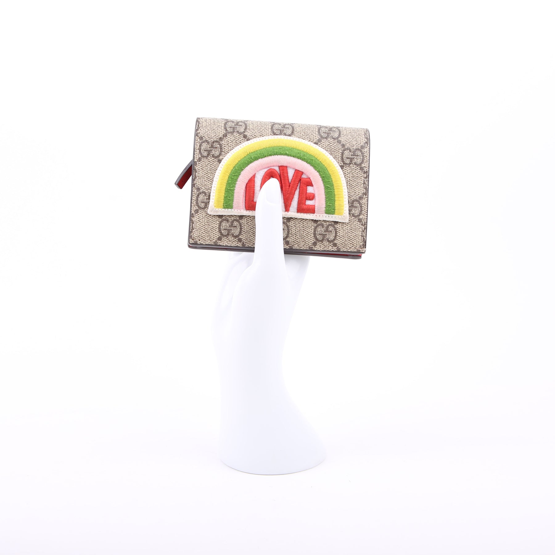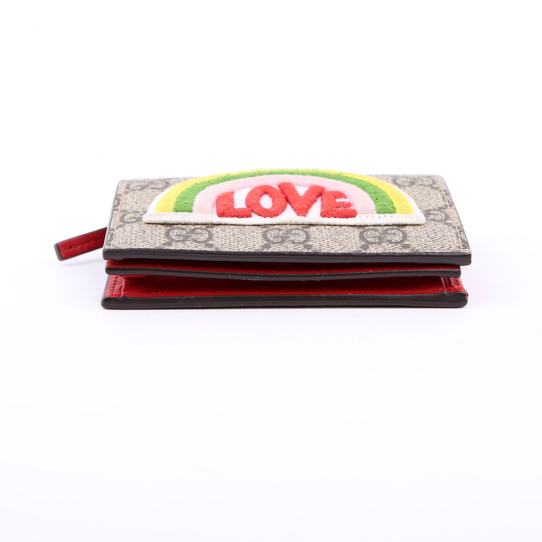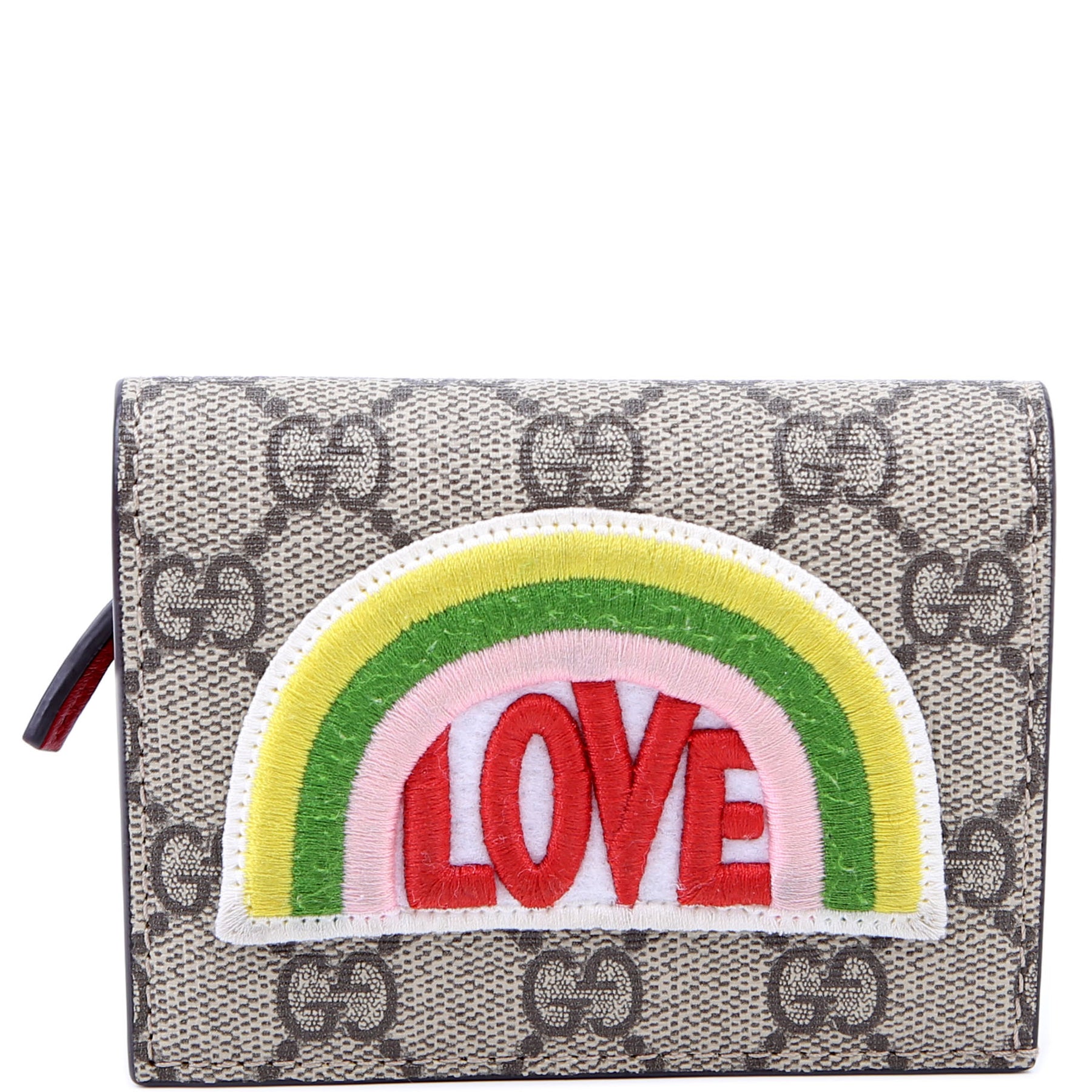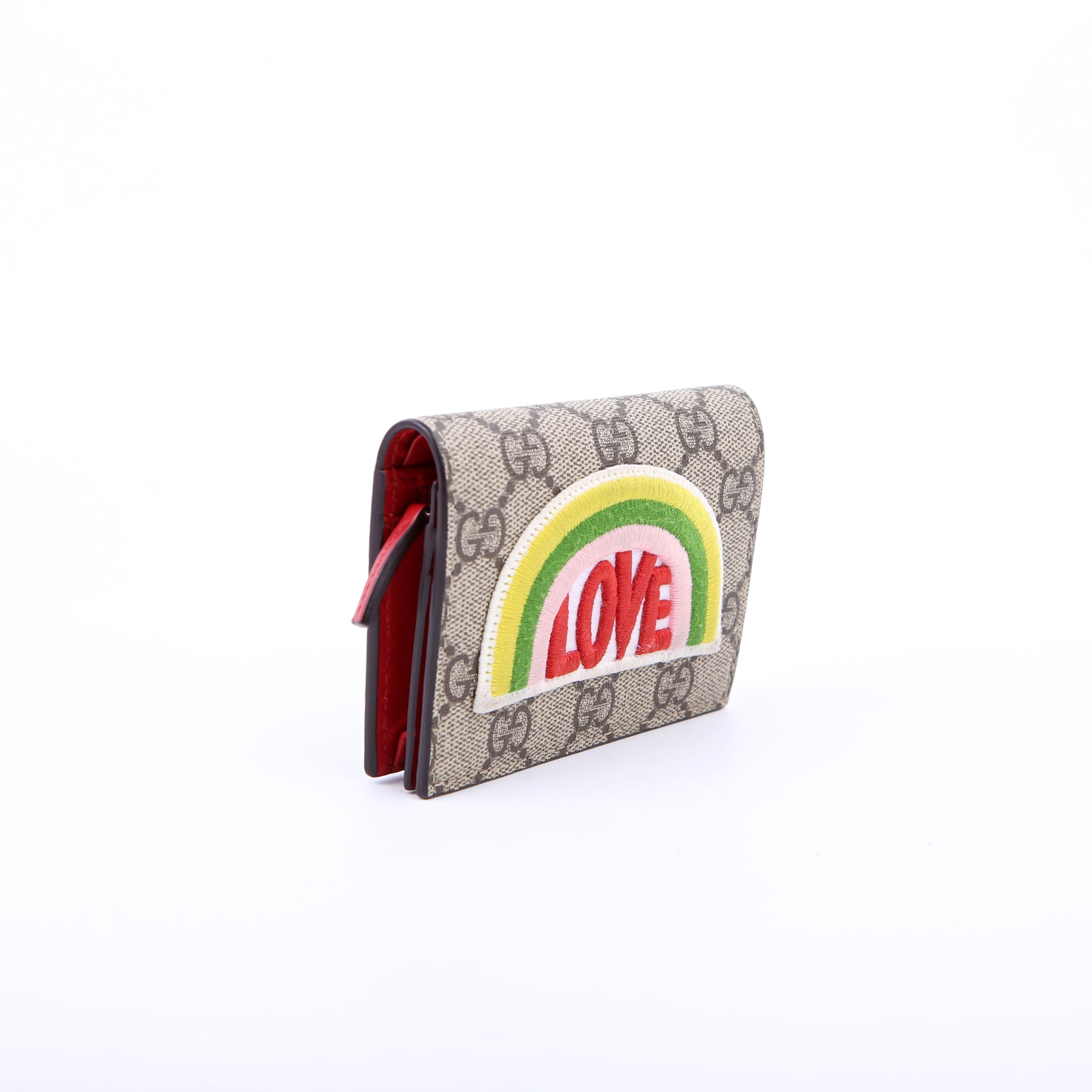 This pre-owned Gucci Small Love Wallet is guaranteed 100% authentic. The exterior is in the classic Gucci GG Supreme coated canvas.
