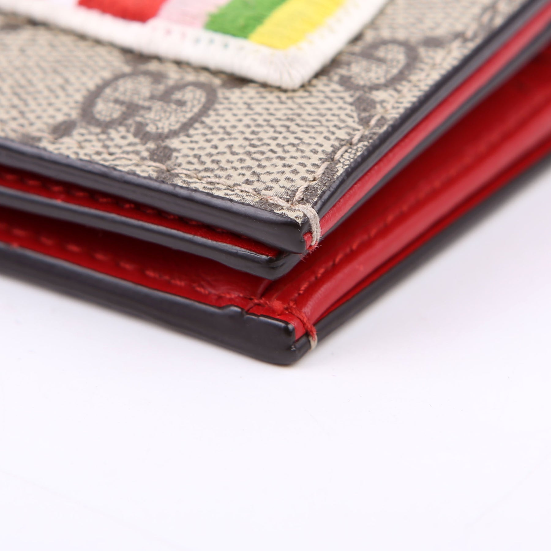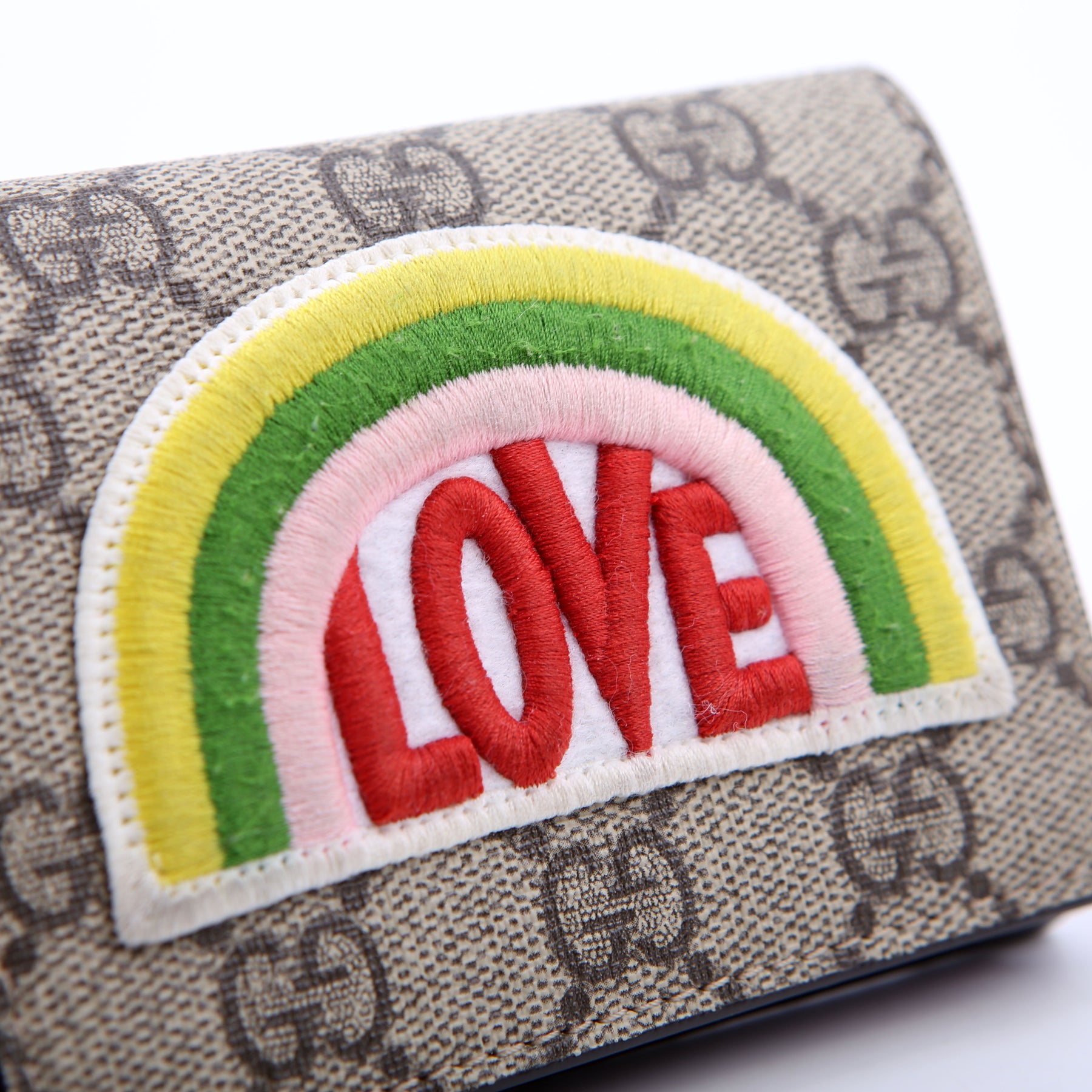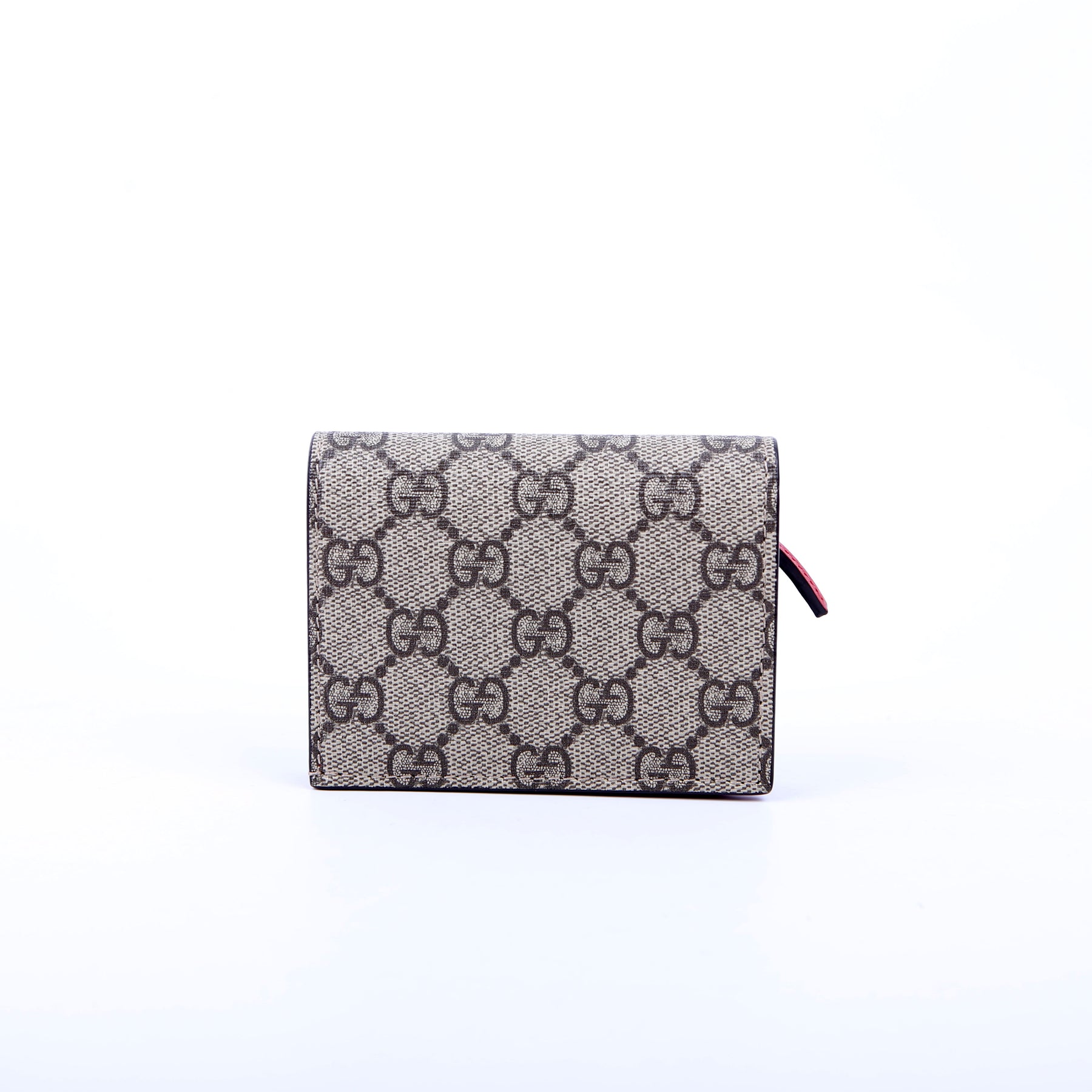 This pre-owned Gucci Small Love Wallet is guaranteed 100% authentic. The exterior is in the classic Gucci GG Supreme coated canvas.