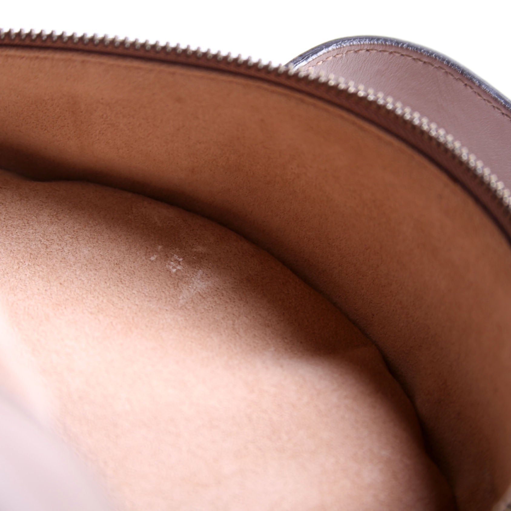 Exterior: The exterior leather shows light wear and scuffs. The corners show wear and rubbing. The structure is slightly misshapen from storage and wear.