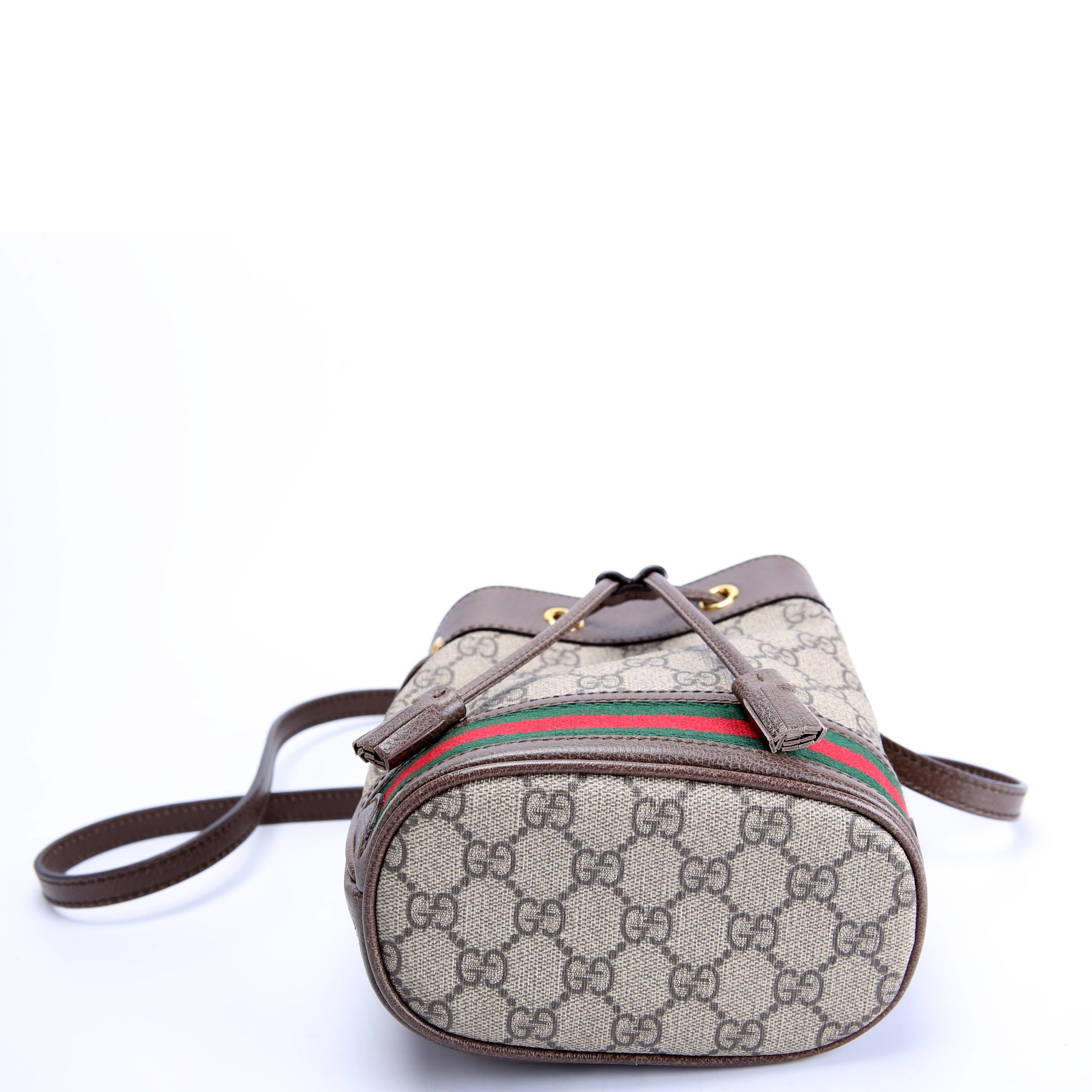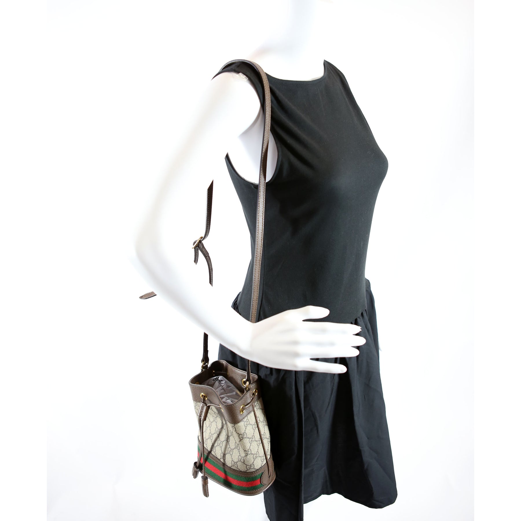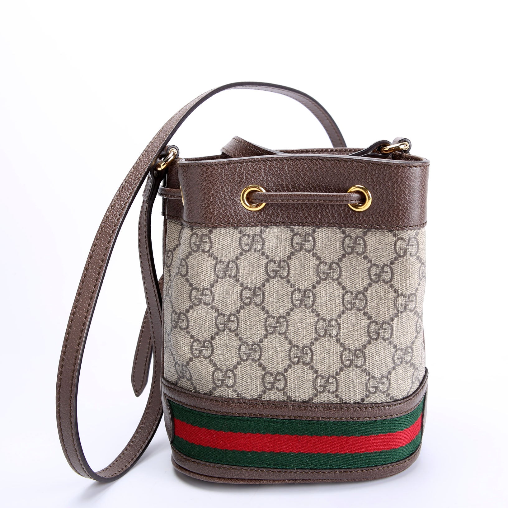 This pre-owned Gucci Canvas Ophidia Mini Bucket is guaranteed 100% authentic. The exterior is in the classic Gucci Supreme Coated Canvas.