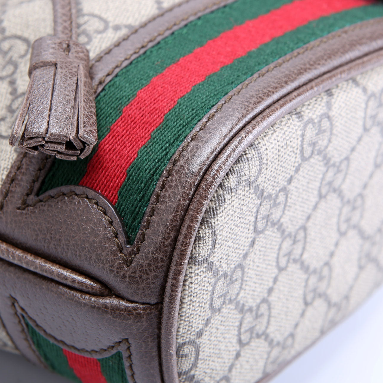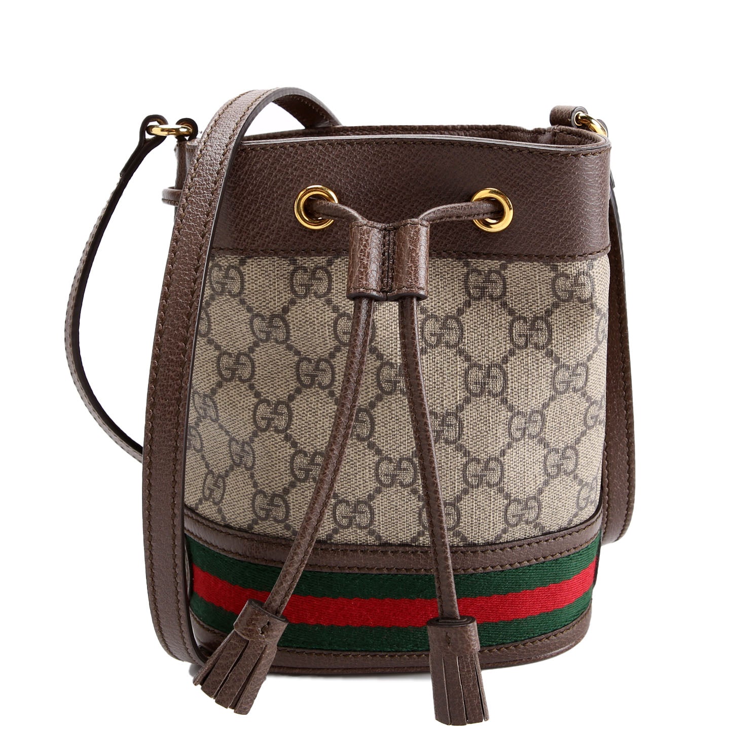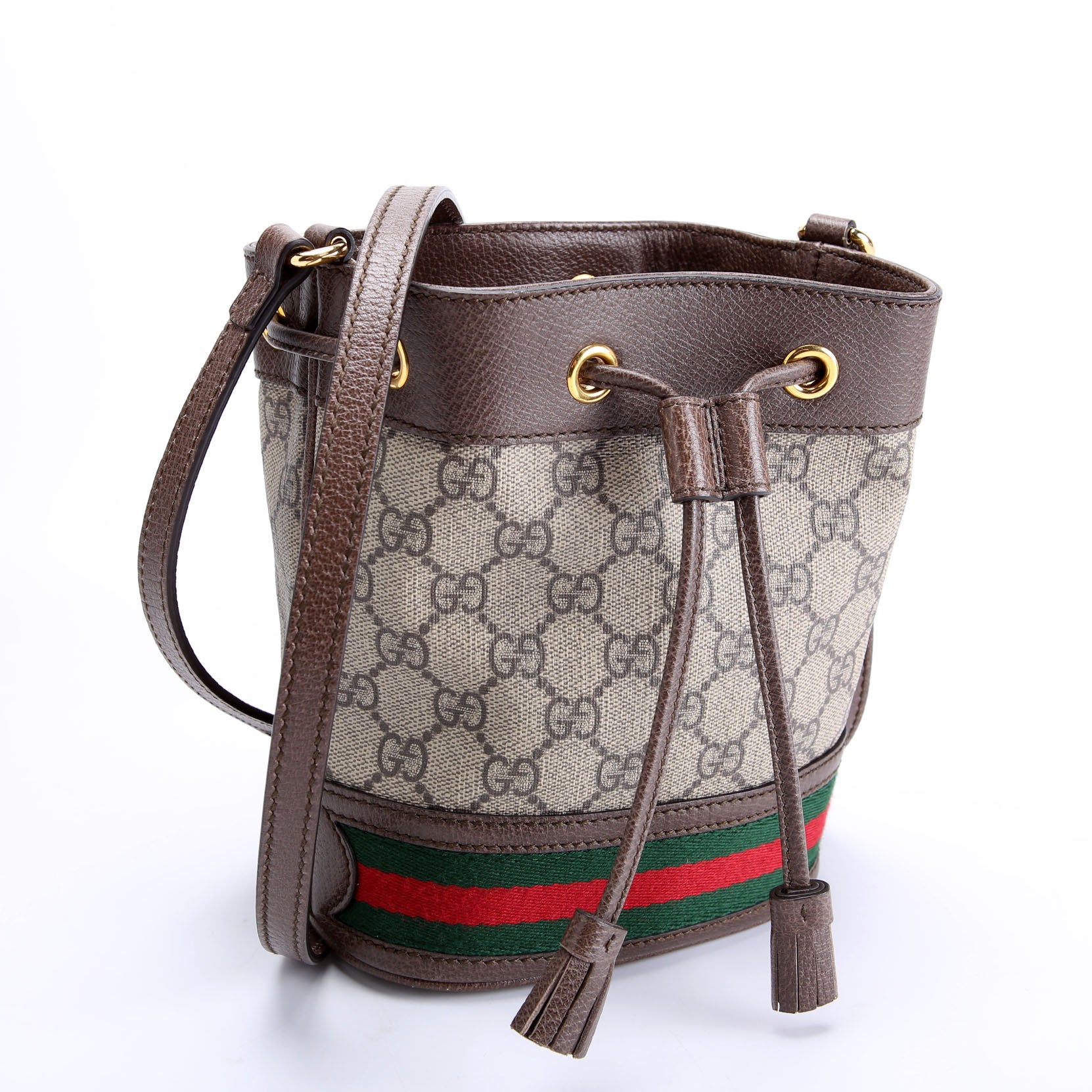 This pre-owned Gucci Canvas Ophidia Mini Bucket is guaranteed 100% authentic. The exterior is in the classic Gucci Supreme Coated Canvas.