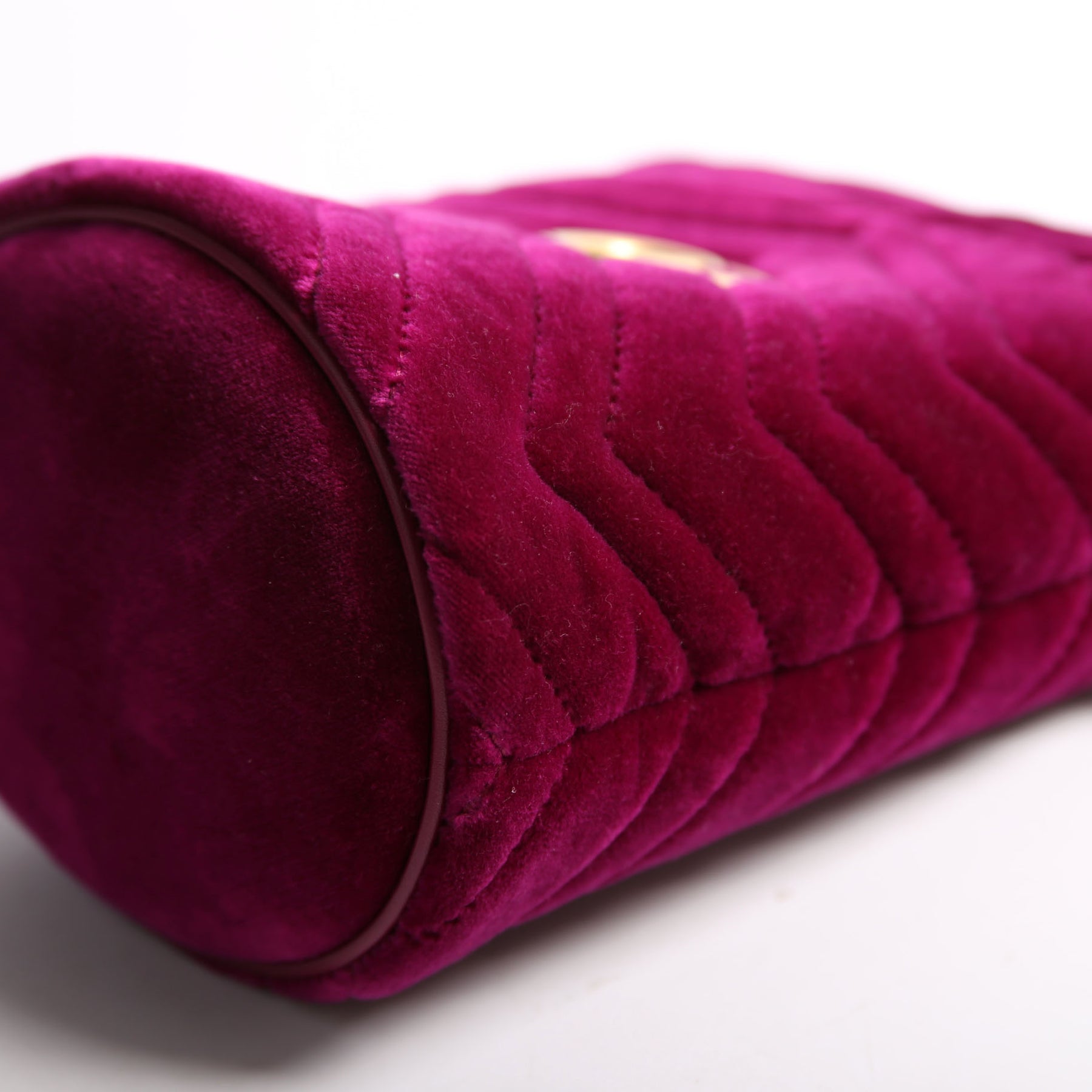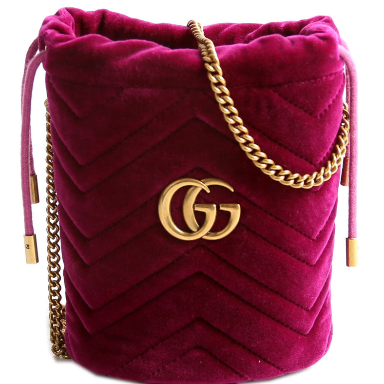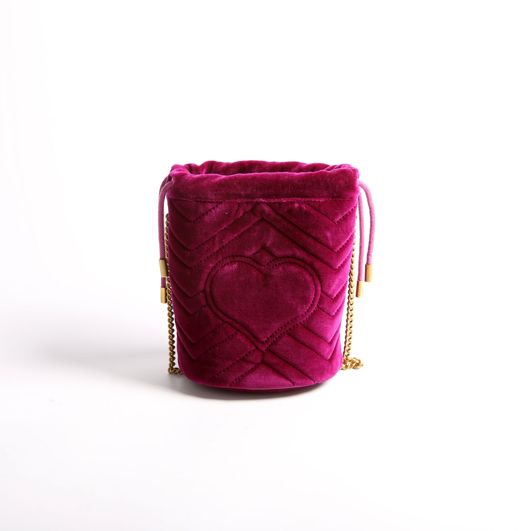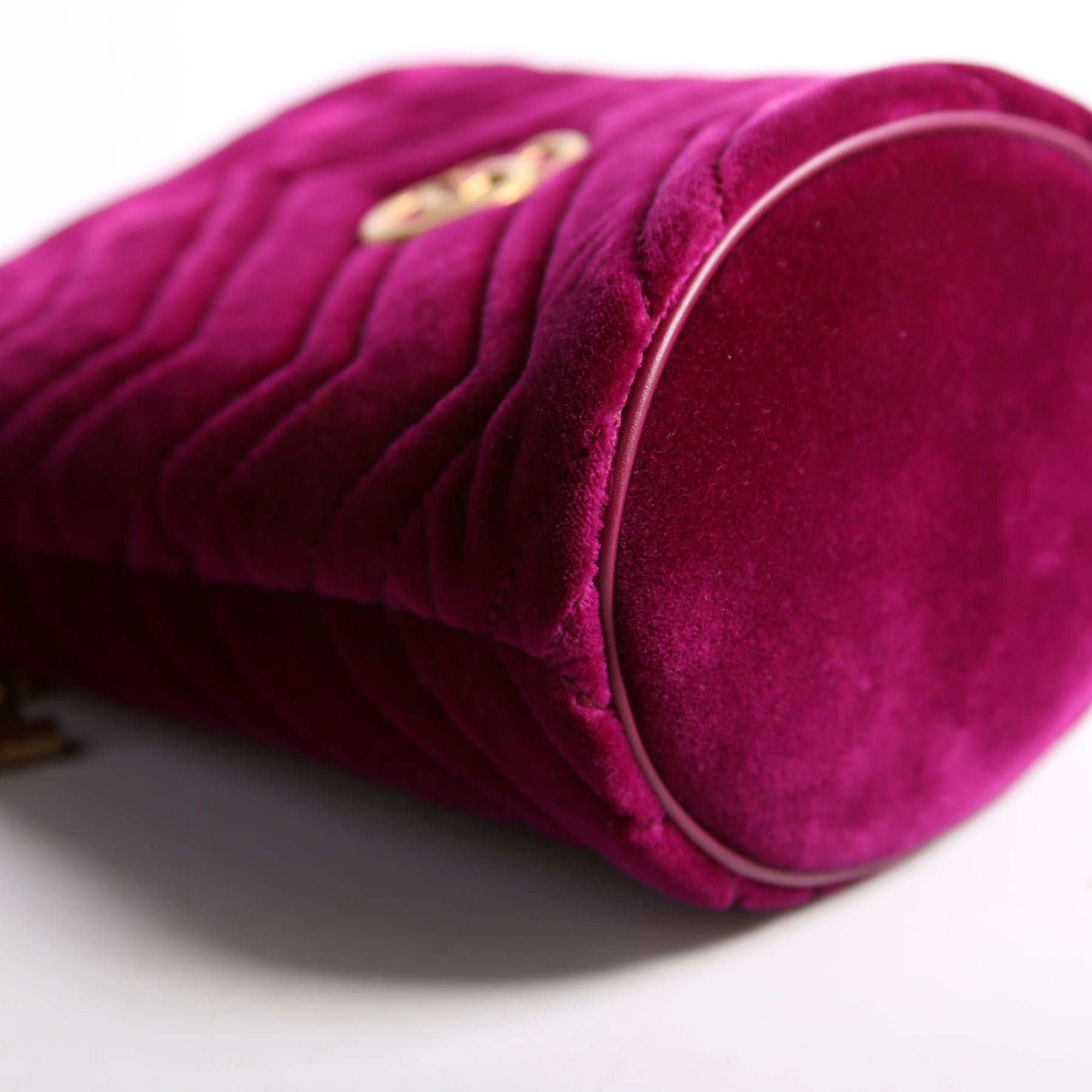 This pre-owned Gucci Marmont Mini Bucket is guaranteed 100% authentic. The exterior is in the classic Gucci Marmont velvet.