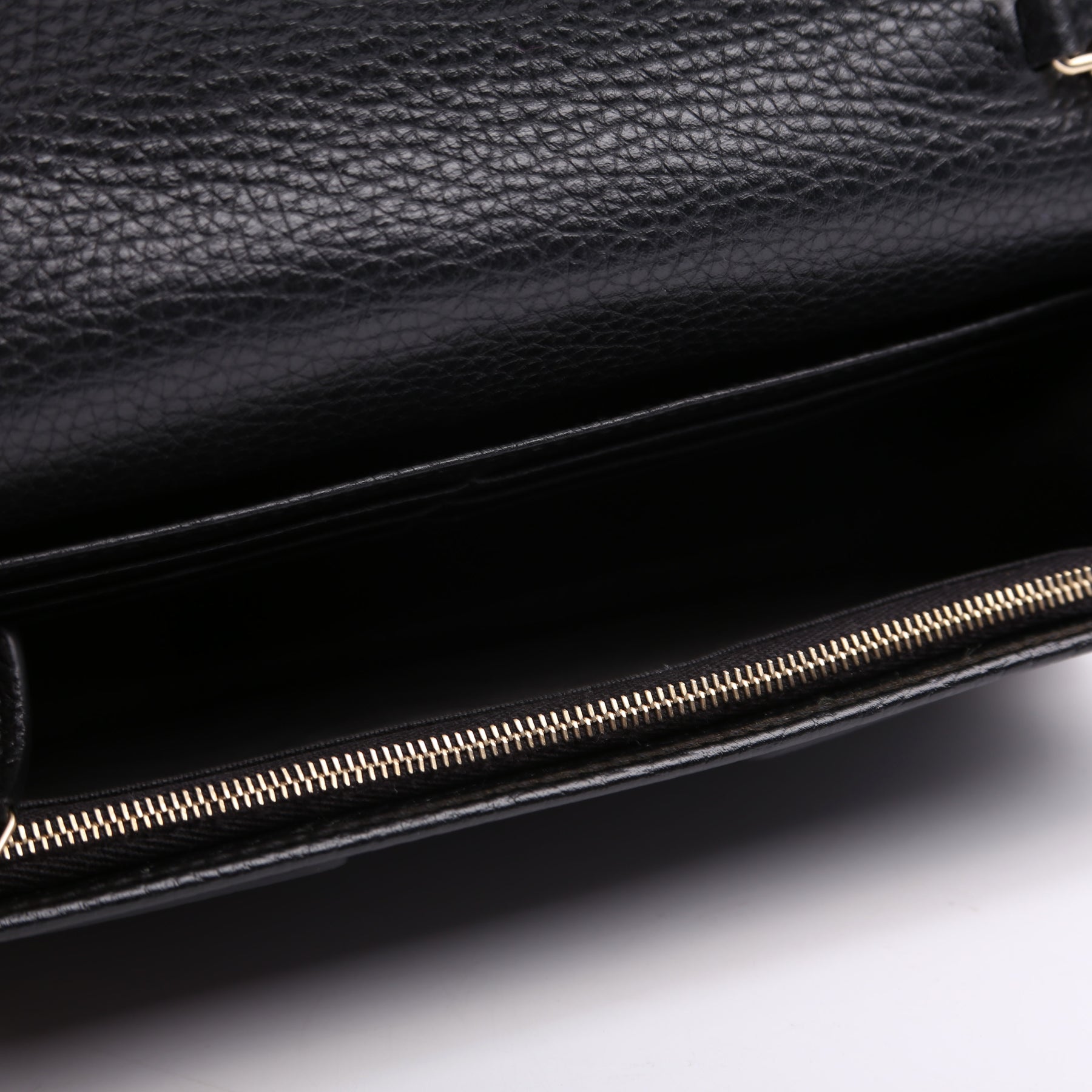 Interior: The interior has no major signs of wear. The interior features two open pockets. There is a light scratch on the interior leather flap.