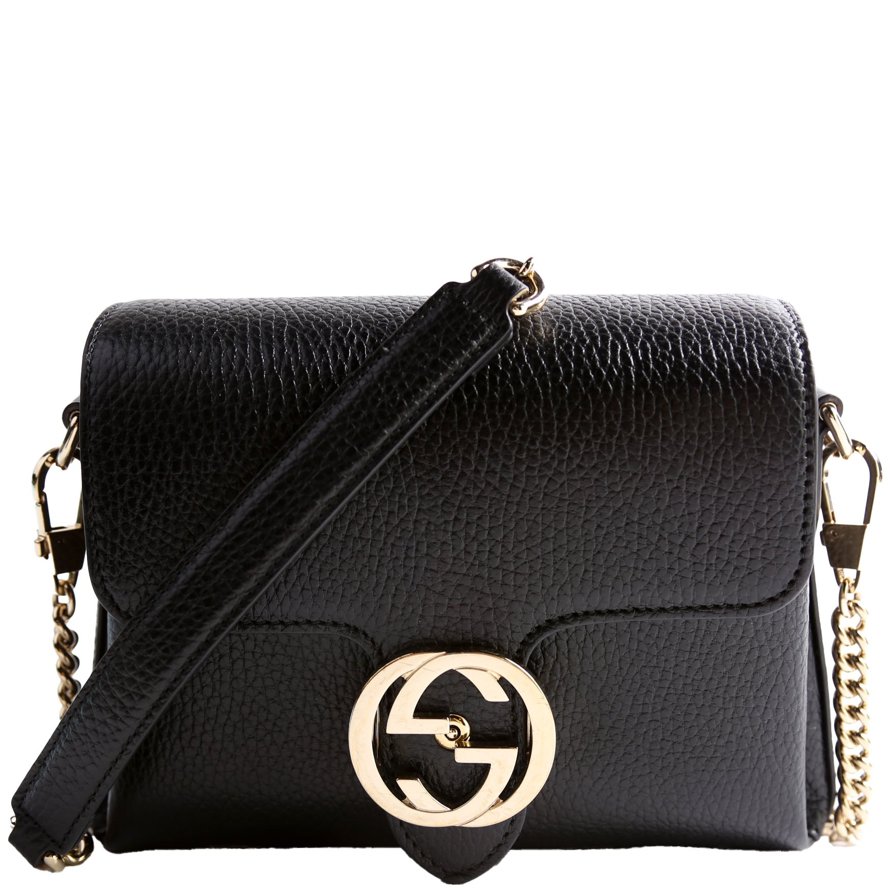 This pre-owned Gucci Interlocking GG Small Crossbody is guaranteed to be 100% authentic. The exterior is in the classic Gucci pebble grain leather.
