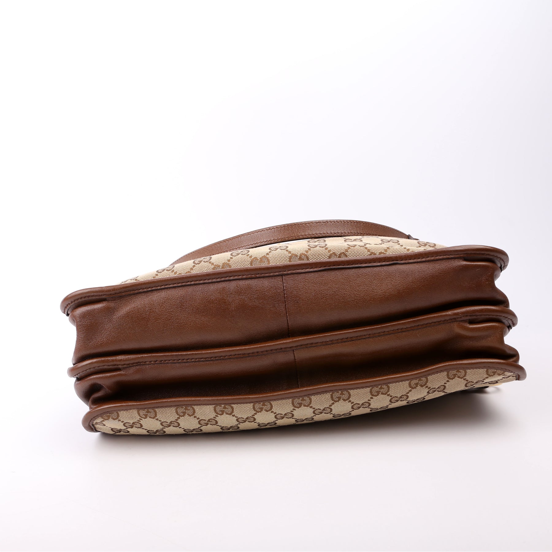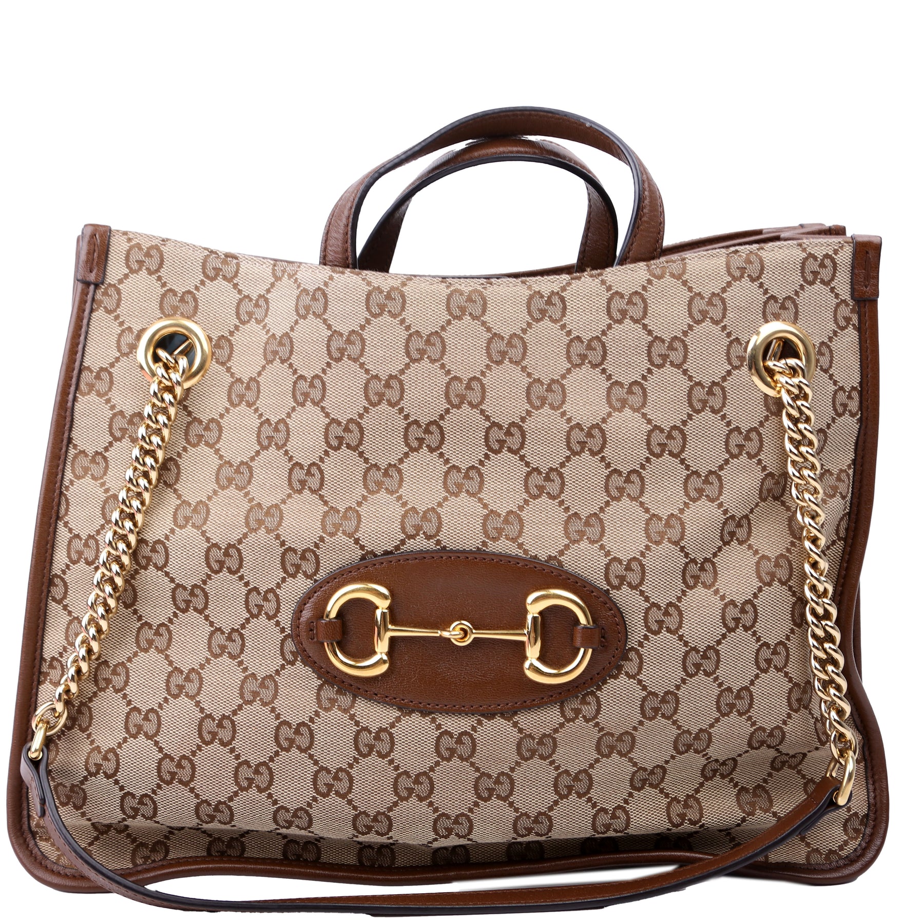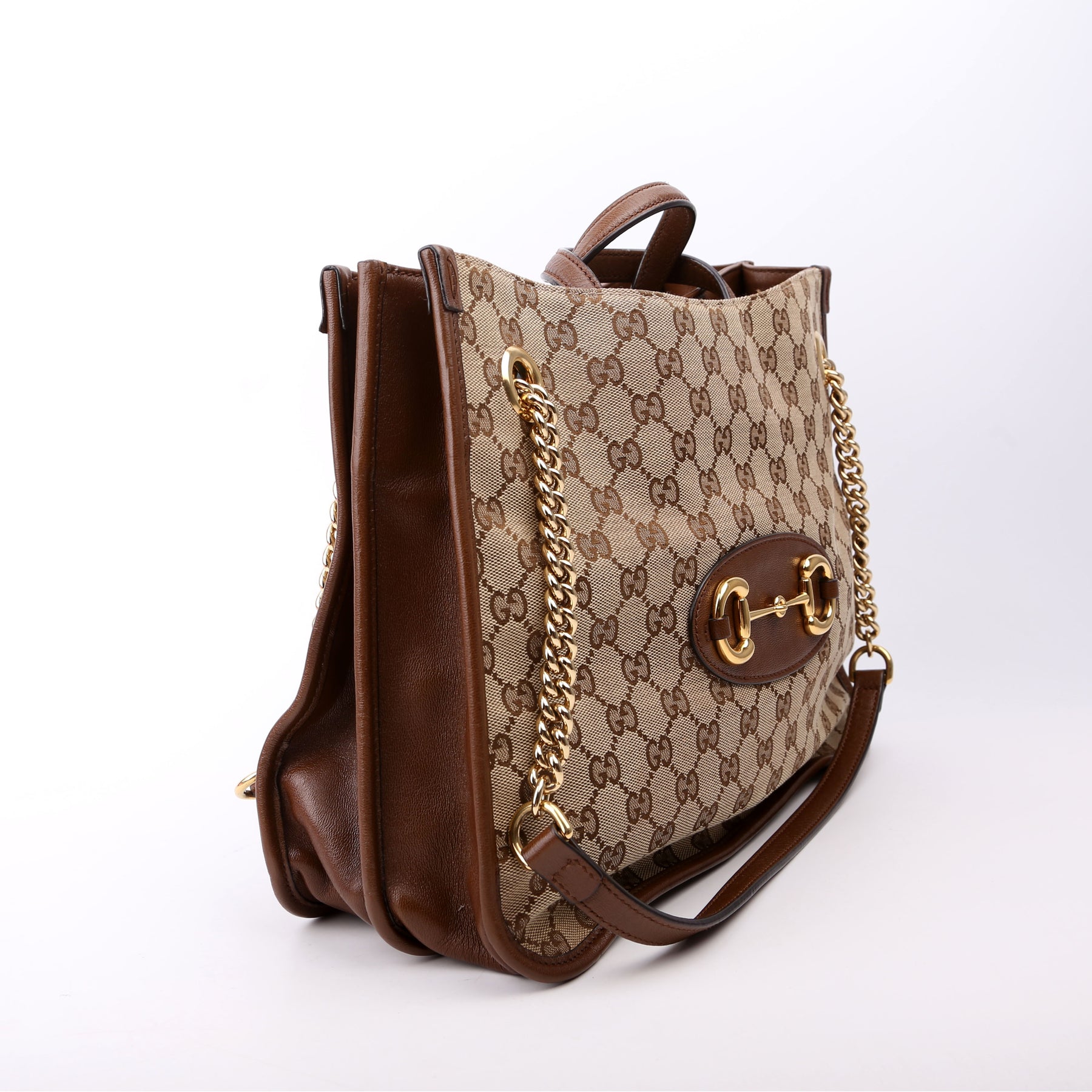 This pre-owned Gucci 1955 Horsebit Large Tote is guaranteed 100% authentic. The exterior is in the classic Gucci GG canvas.